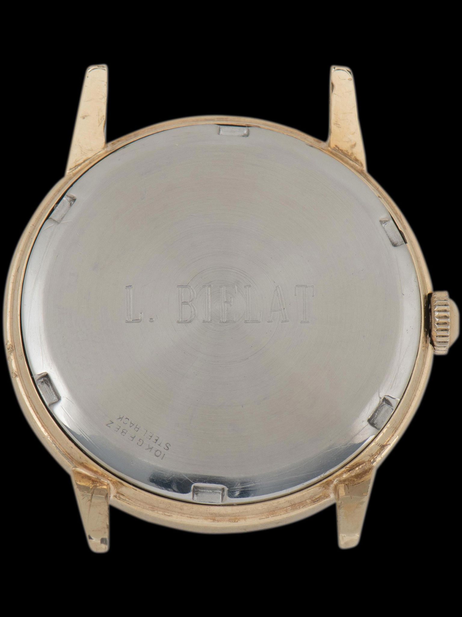 The excellent yellow gold-filled case features long, broad lugs that exhibit light evidence of being previously polished and show honest signs of gentle use. It retains its original yellow gold Omega crown. The steel case back shows minor, honest signs of wear with the inscription "L. Bielat." The watch will be supplied on a handmade two-piece leather strap.