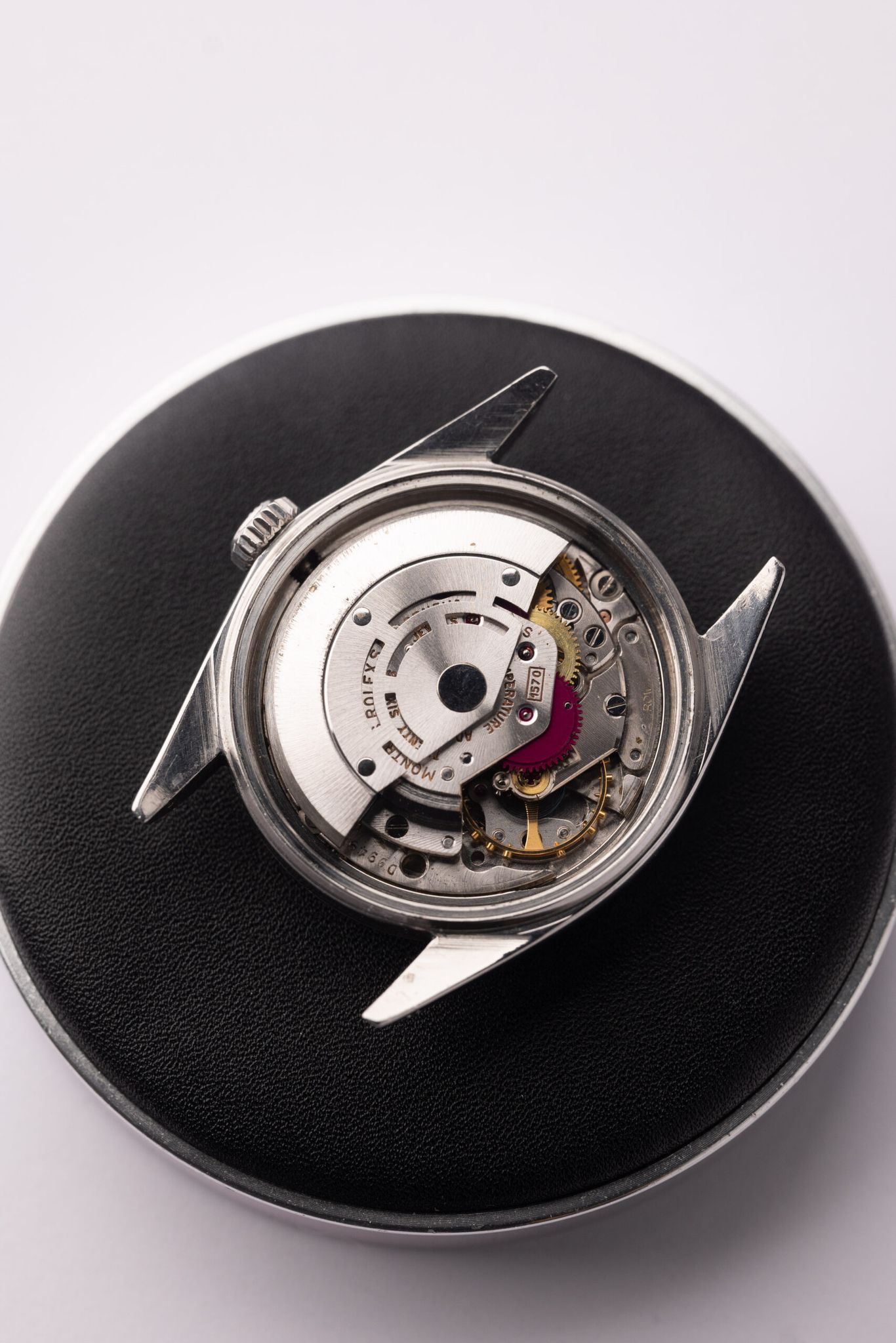 “Pie-Pan” dials are detail unique to history, whose outbound minute track position upon soft chamfers, a slope descending toward the watch’s rehaut. This champagne radial sunburst diall Rolex is an uncommon Datejust combination, an affordable and unique vintage offering.