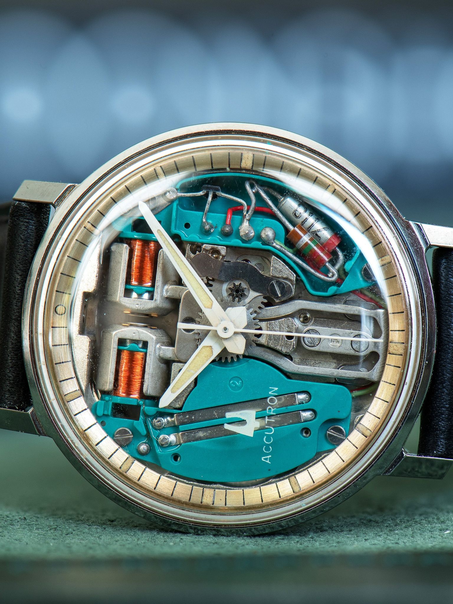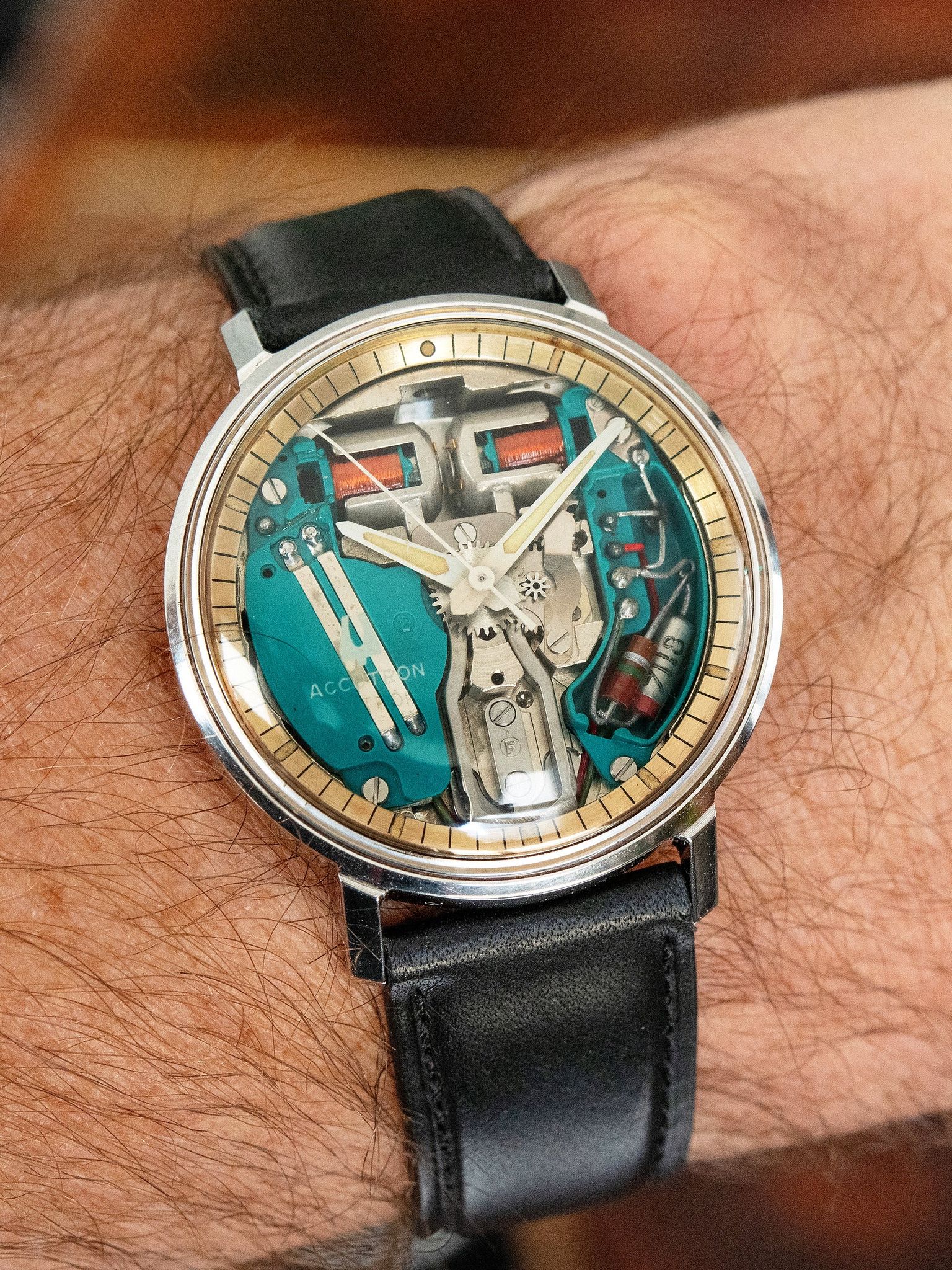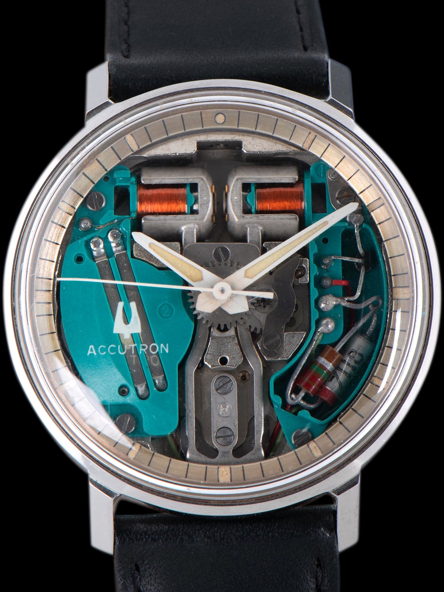The Accutron line was initially a product of Bulova's view of the future – one that replaced analog movements with battery-powered ones, and predated the quartz crisis by a decade or so. But this isn't just any electric movement. This is one uses a steel tuning fork powered by electromagnets to keep incredibly precise time. And it does it while humming (if you put your ear to the watch, you'll be able to hear the tuning fork working away).