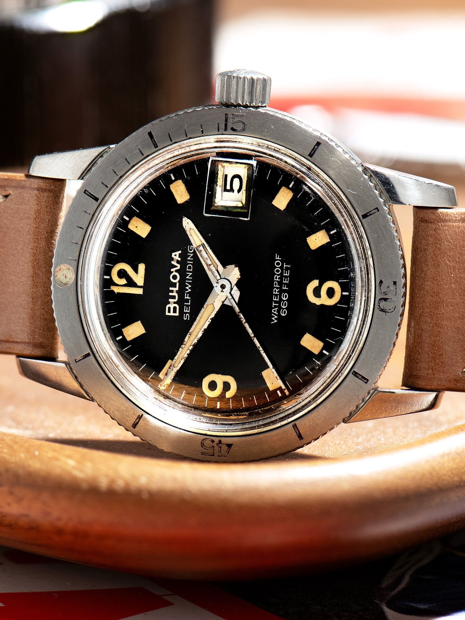 This 1968 Bulova Snorkel ref. 386-4 Skin Diver has all of the elements we love about the mid to early "Golden Era" divers. Not only has it aged to reflect a beautiful patina, but it's also a devilishly attractive watch, hosting an occult-inspired depth rating of 666 feet.