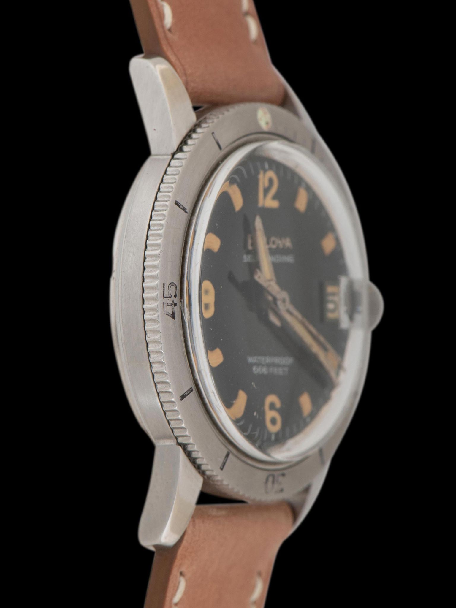 The excellent stainless steel case remains in very strong overall condition showing only light signs of honest use with minimal evidence of previous polishing present. The ratcheting bezel is also in excellent condition showing minimal wear though the factory black enamel is partially missing. The case retains its original Bulova-signed crown. The case back exhibits minimal wear and retains its original Bulova medallion. The watch comes supplied on a 2pc handmade leather strap.