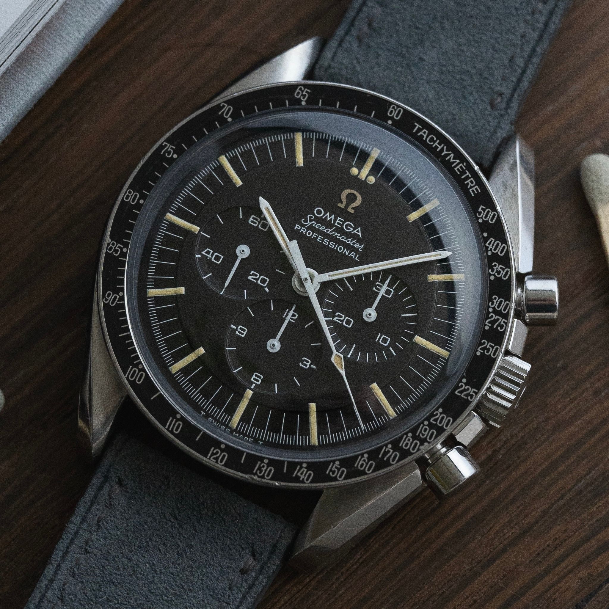 This is a scarce run transitional model which features the DON Bezel, applied logo dial and 861 movement. This was a very short run speedy.