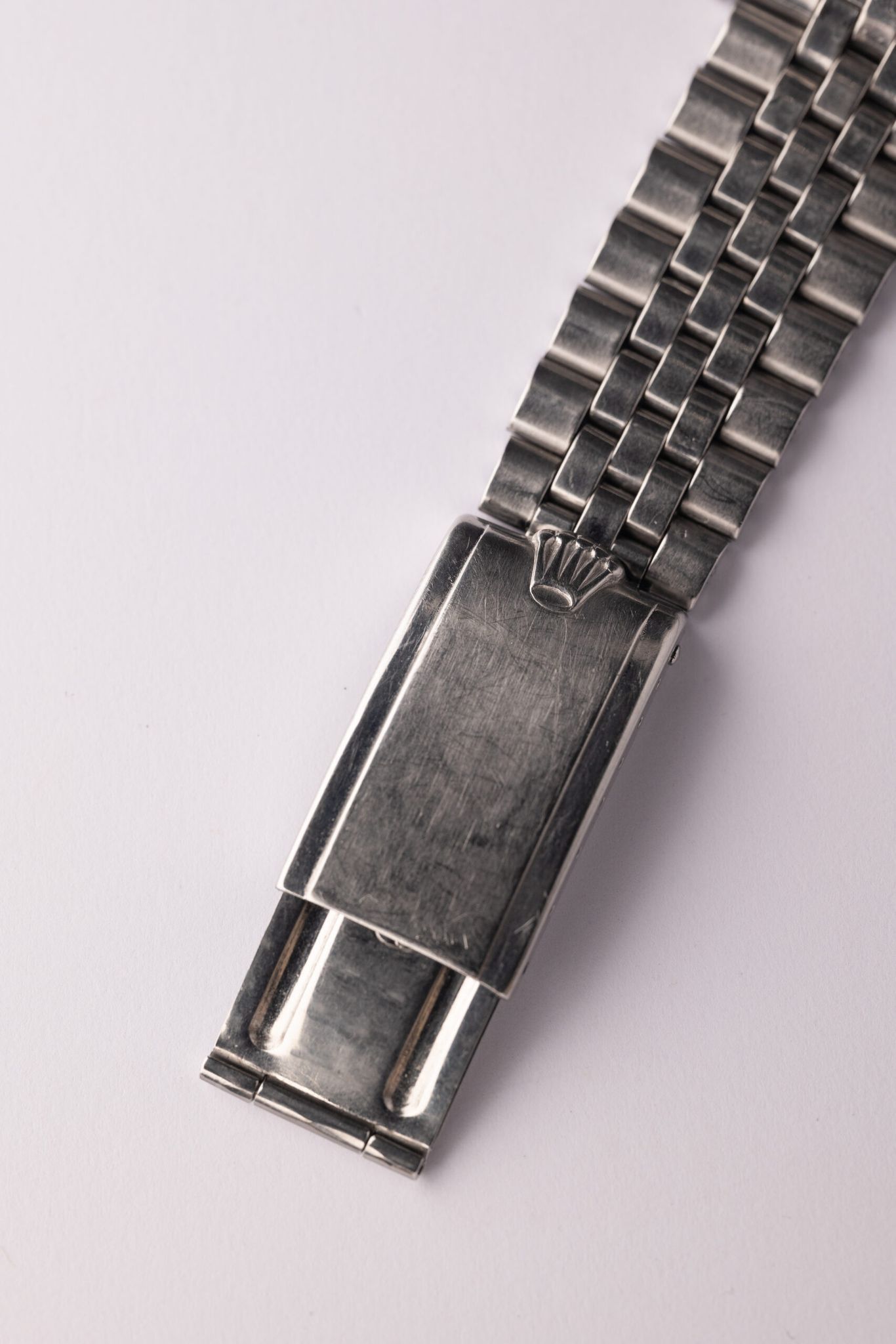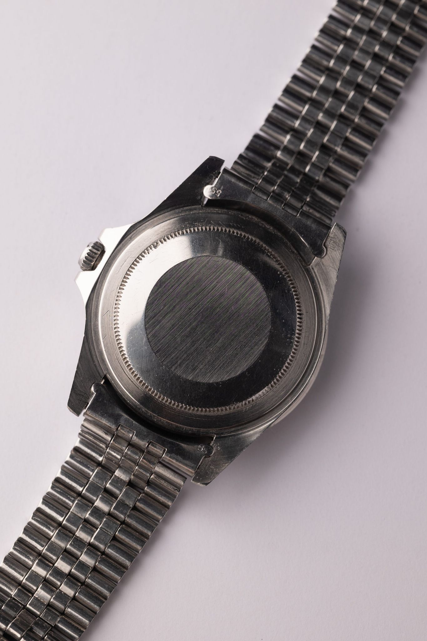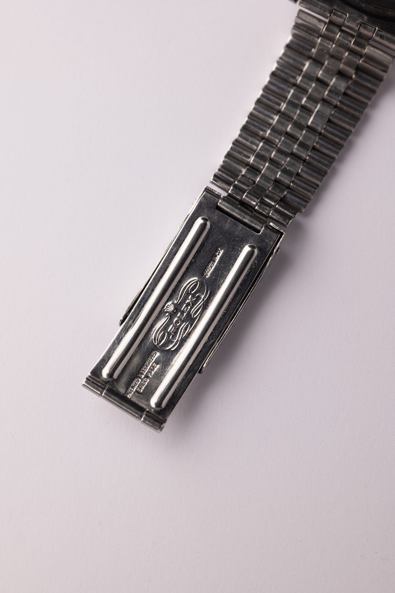 1675’s earliest matte dials are “Long E” variants where Rolex “E’s” middle line is equidistant to its top and bottom lines. Mega Fat Font insert has faded into a soft salmon and denim; tritium lume appears a very subtle, not at all distracting, classic yellow; case appears lightly polished, bevels retain factory spec super sharp and fat bevels.