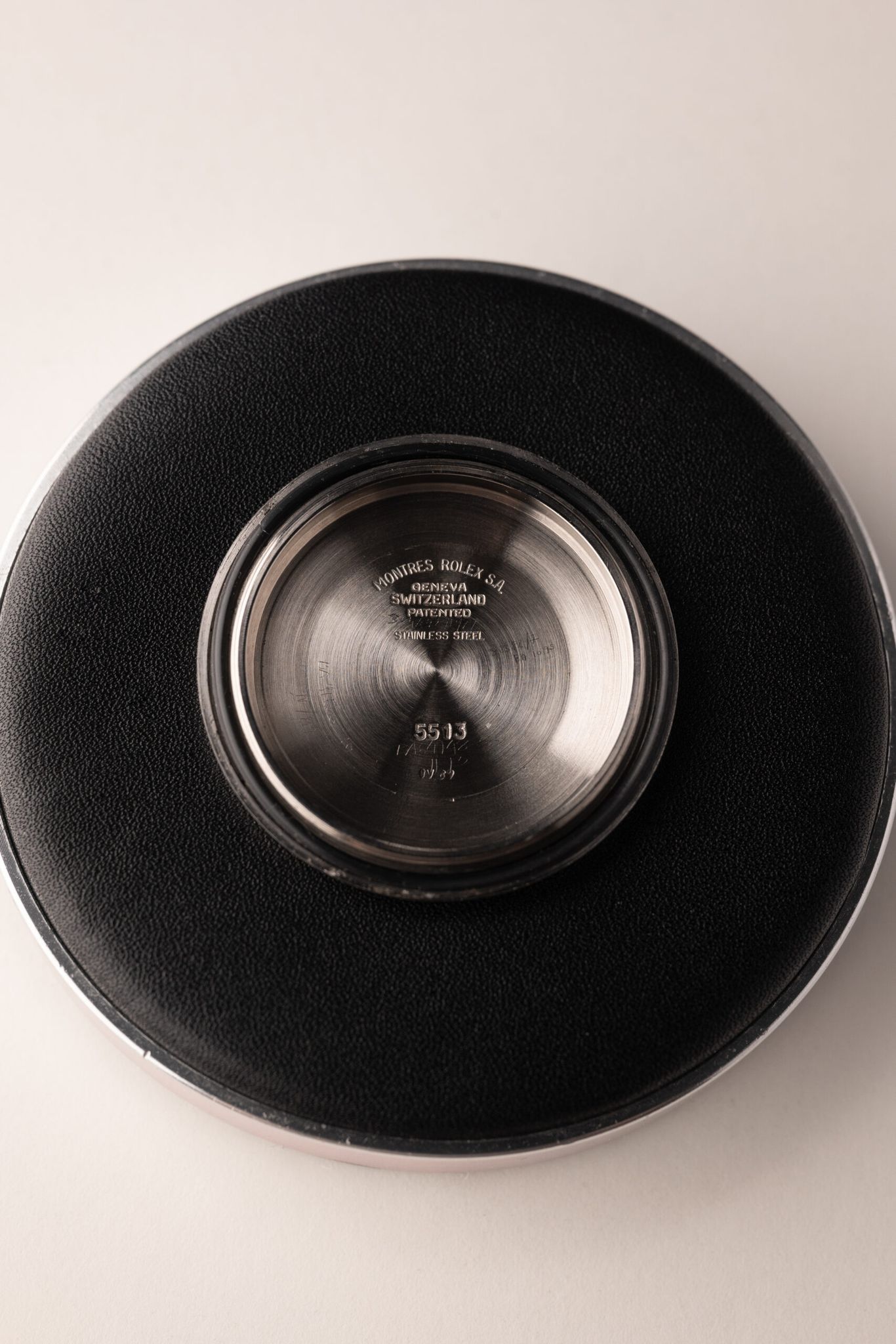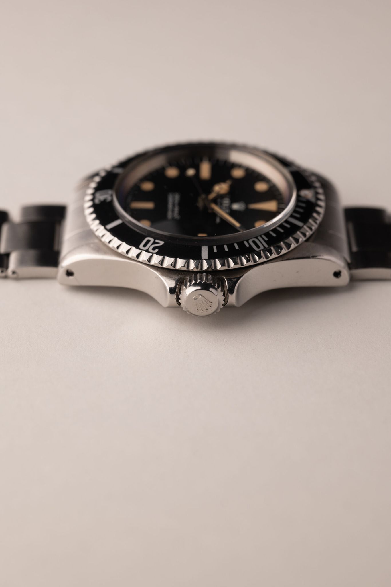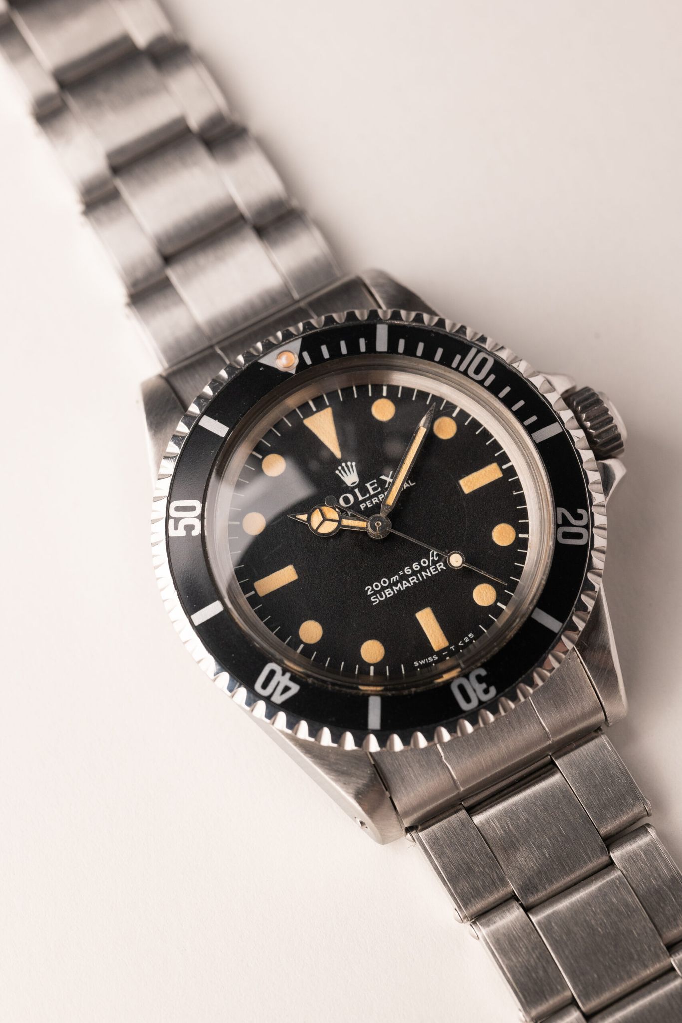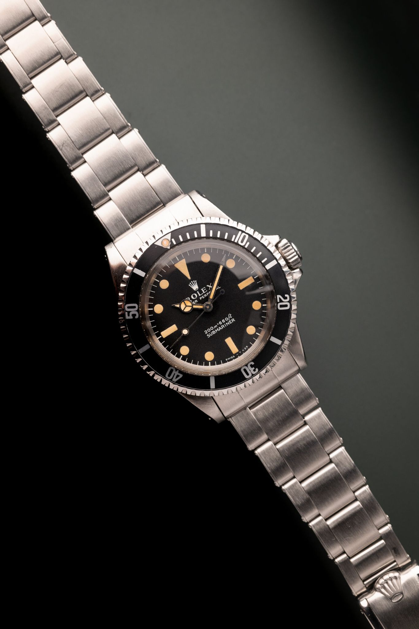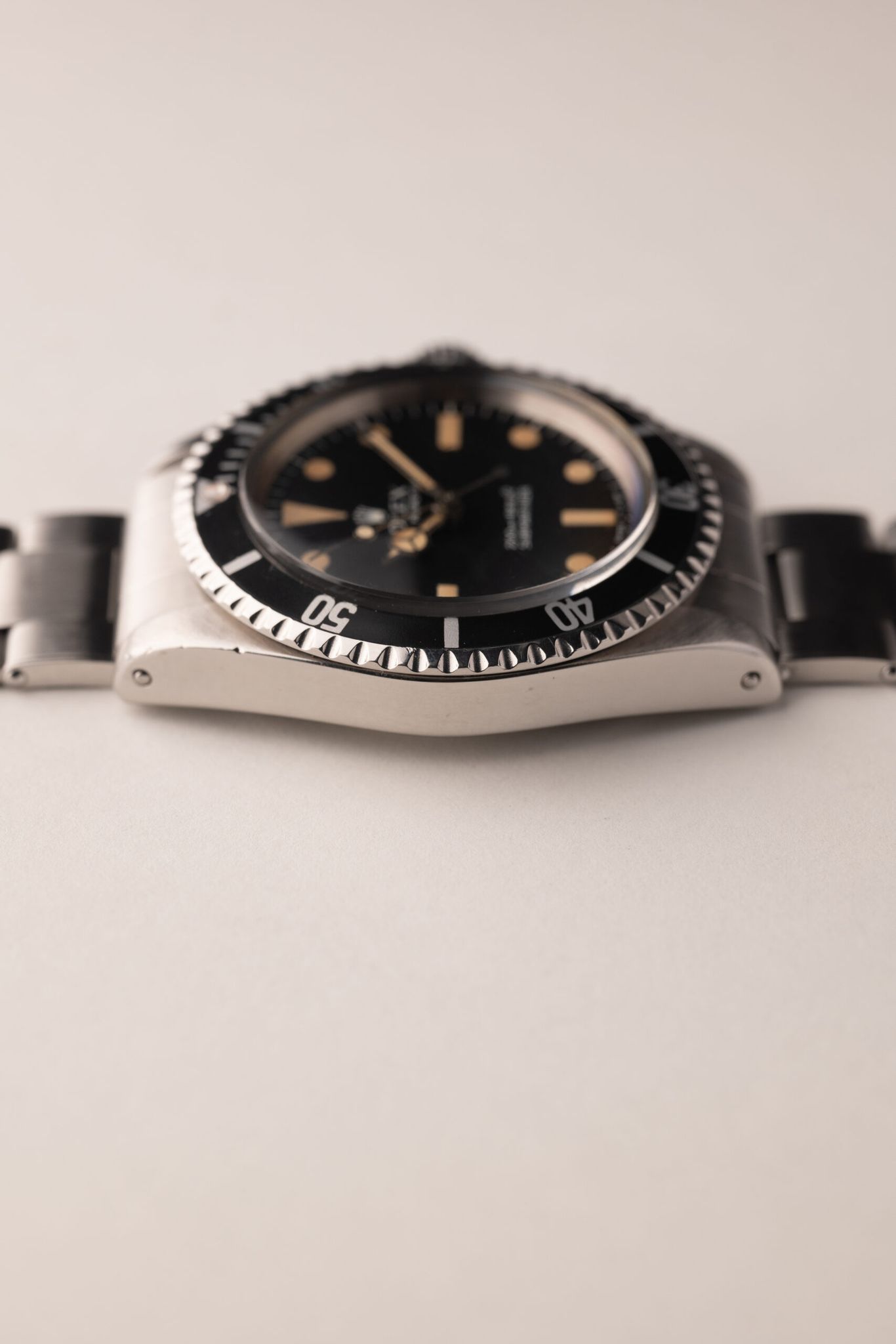 A Submariner's Depth Rating indicates range of sustainable use which Rolex, until the early 1970's, gave Europe's Metric Meters primacy over Imperial Feet. But as the monarch's main audience shifted, so too did its order. This 5513 "Meters First" is an example preceding change whose dial is in great condition and lume has softly saturated paired with a rare "Kissing 40" Mega Fat Font insert. Case comes excellent and has seen a previous polish, though remains thick. Comes complete with box and paper.