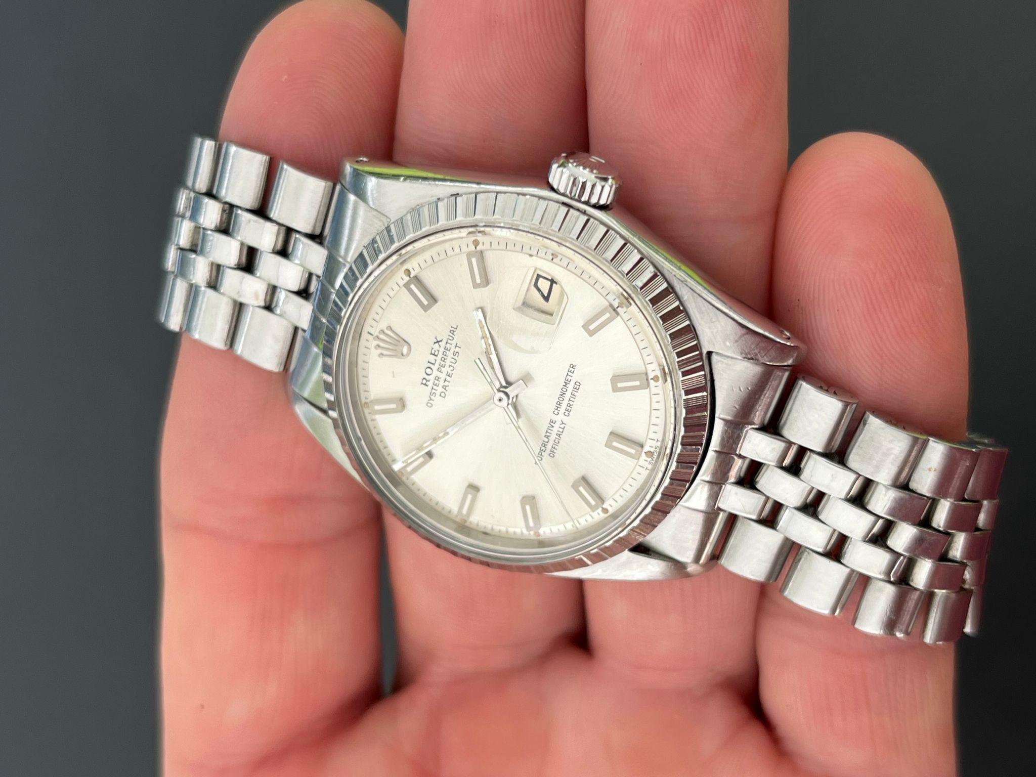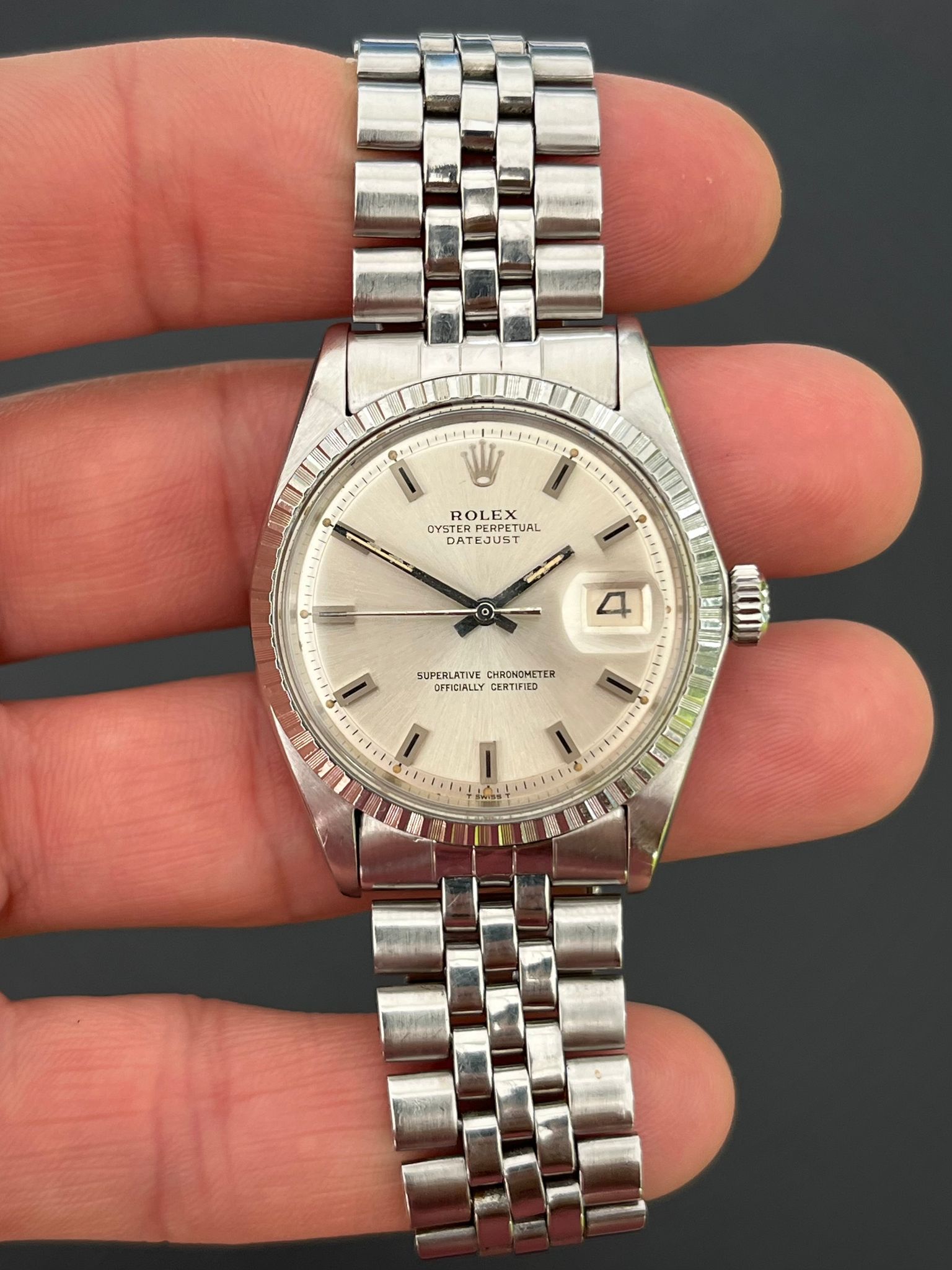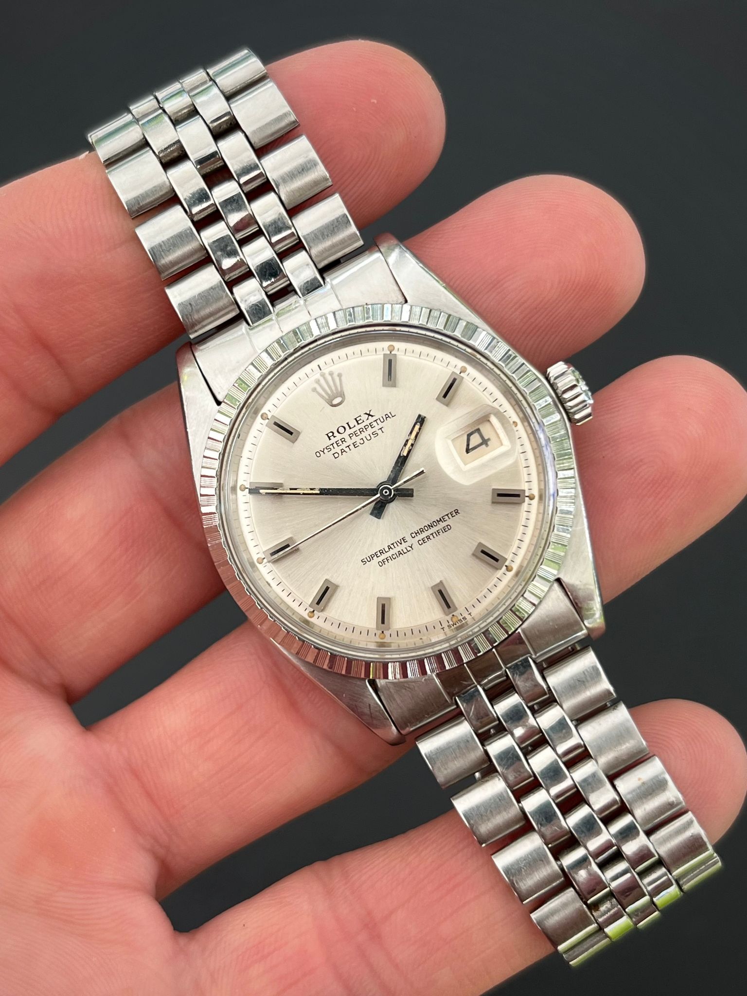 The Vintage Rolex 1603 Date just is an iconic watch known for its classic design, precision, and historical significance. With a stainless-steel case, a distinctive engine turned bezel, and a reliable automatic movement, this 36mm timepiece is a versatile choice suitable for both men and women. The watch's date function, with the signature Cyclops lens, adds to its practicality and aesthetic appeal. It's a piece of horological history, dating back to the early 1960s and early 1980s, showcasing Rolex's enduring commitment to craftsmanship and innovation.