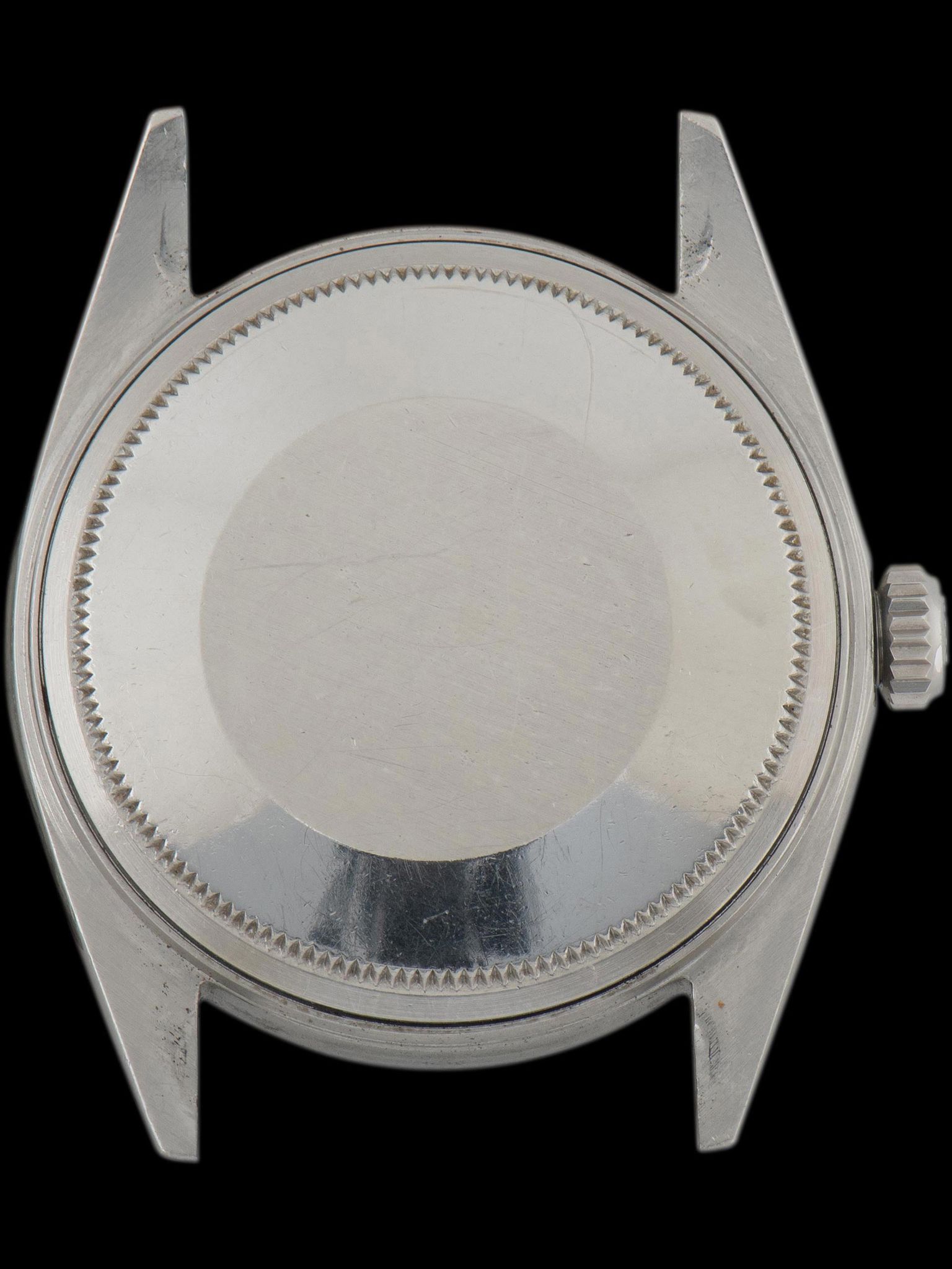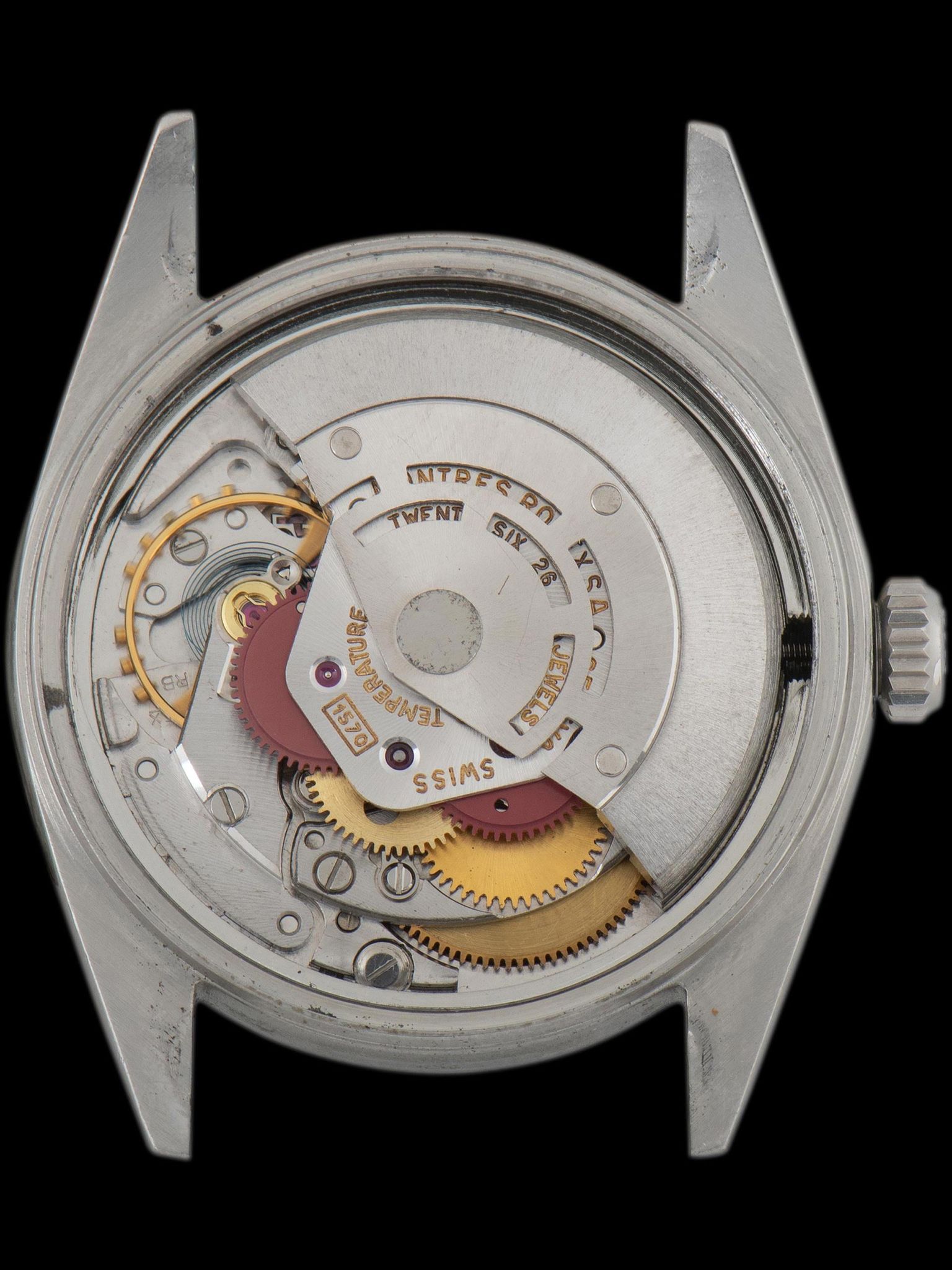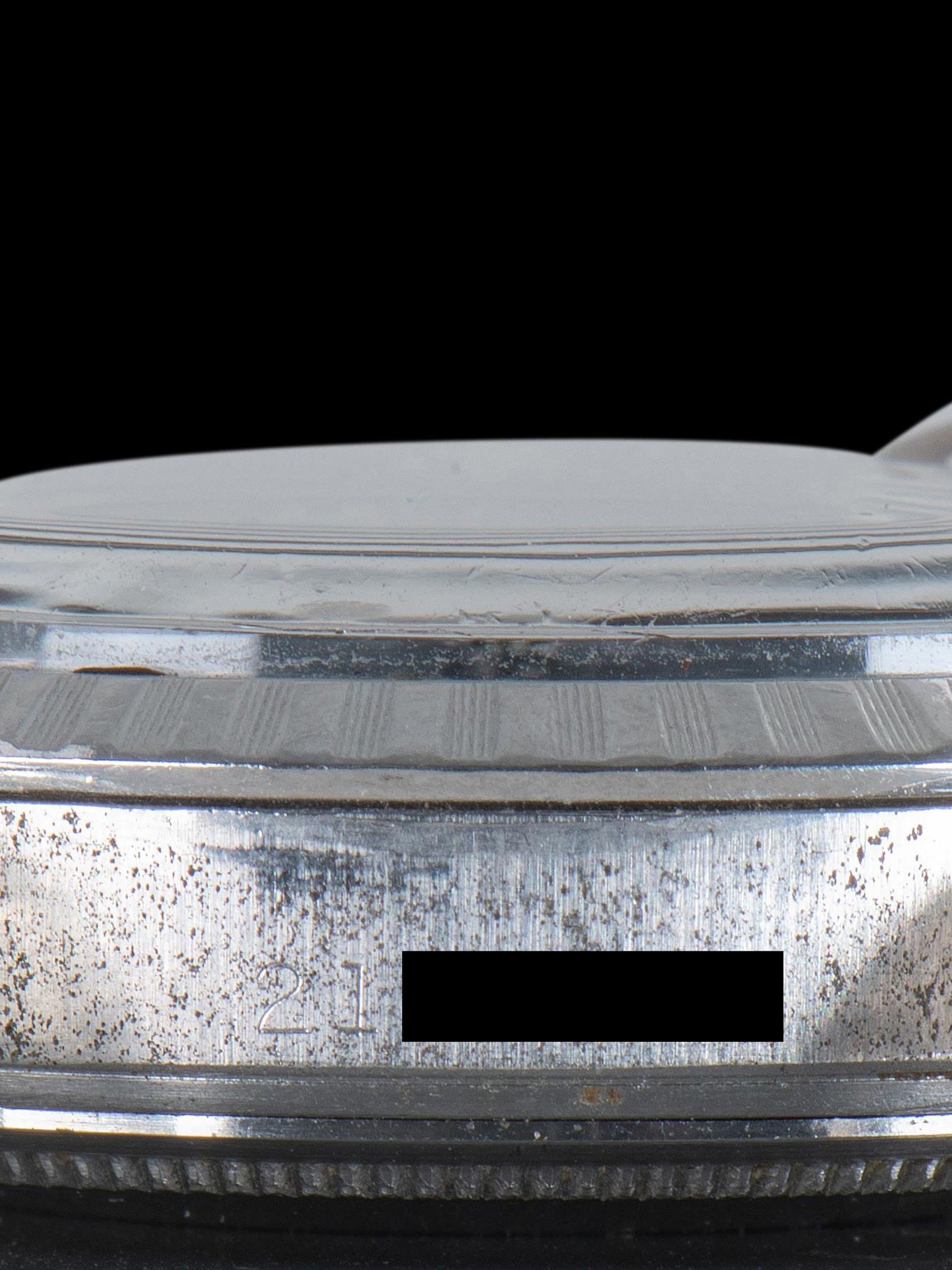 The rare and beautiful non-luminous matte black "confetti" dial is in very well-preserved condition, with the only notable element of age being an small oil stain on the minute track between 1 and 2 o'clock which is mostly invisible to the naked eye, otherwise the dial is in perfect condition. The "confetti" of the matte black dial texture is comprised of blue, red, green, and yellow speckling. The orignial hands have been professionally restored with luminova to remain functional, though this also matches the original aesthetic of the watch. The metallic date wheel is original with "closed" 6's and 9's.