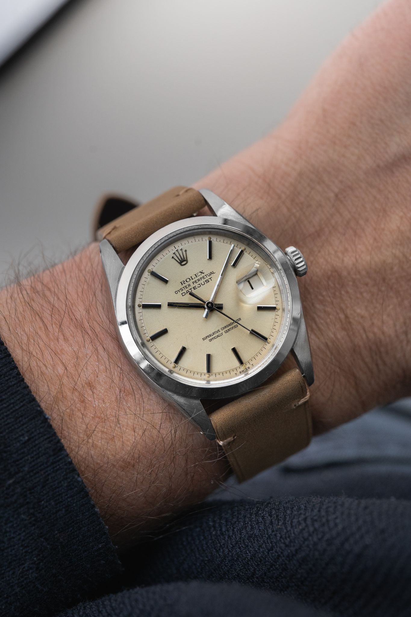 Step back in time with this remarkable 1969 Rolex Datejust, a piece that perfectly blends timeless design with vintage appeal. Crafted with an understated smooth bezel and perched on a bespoke leather band, this watch emanates an air of refined sophistication. Its silver dial, aged gracefully to a creamy patina, tells a story of character and enduring style, making it a truly unique find for discerning collectors.