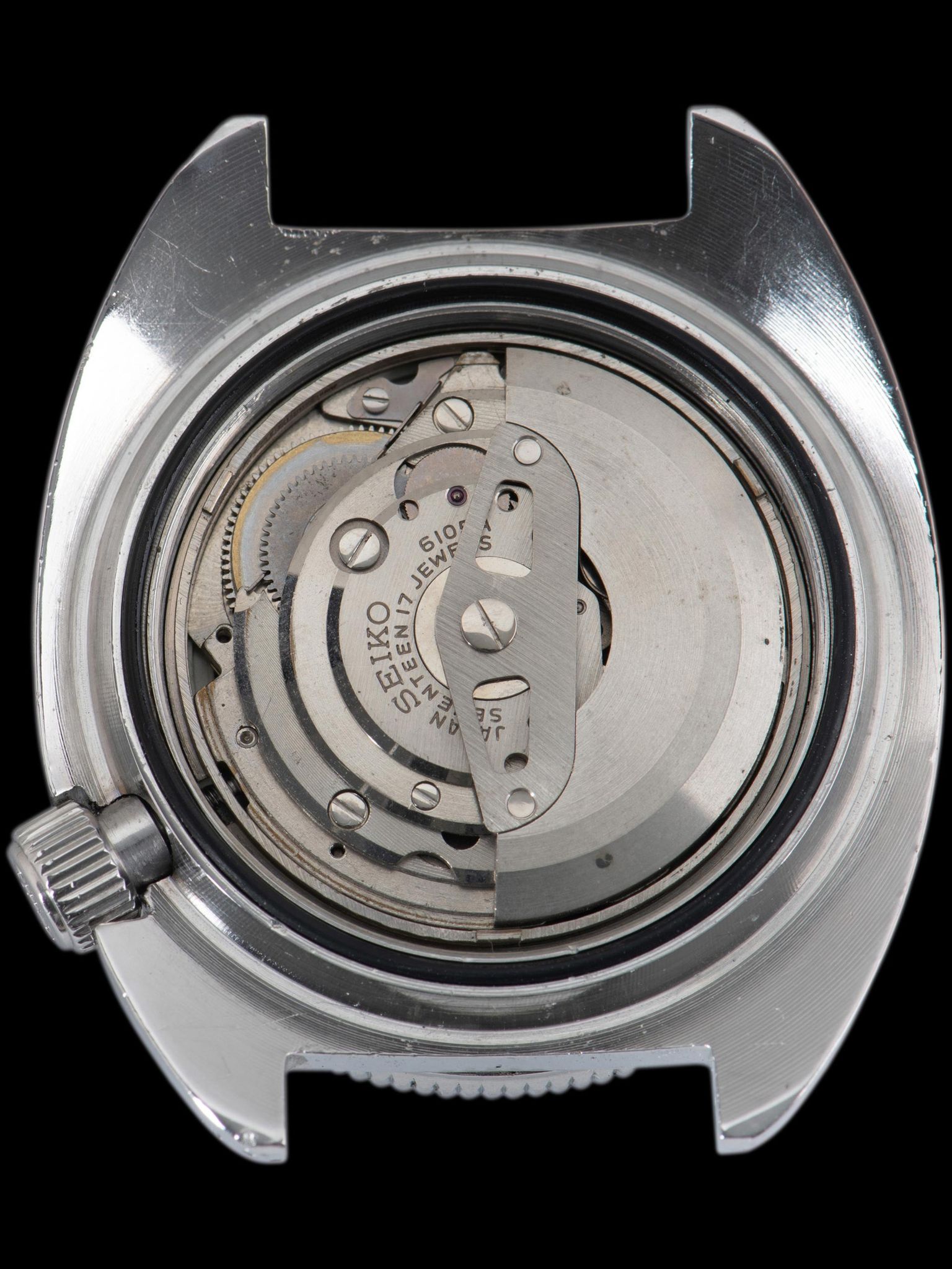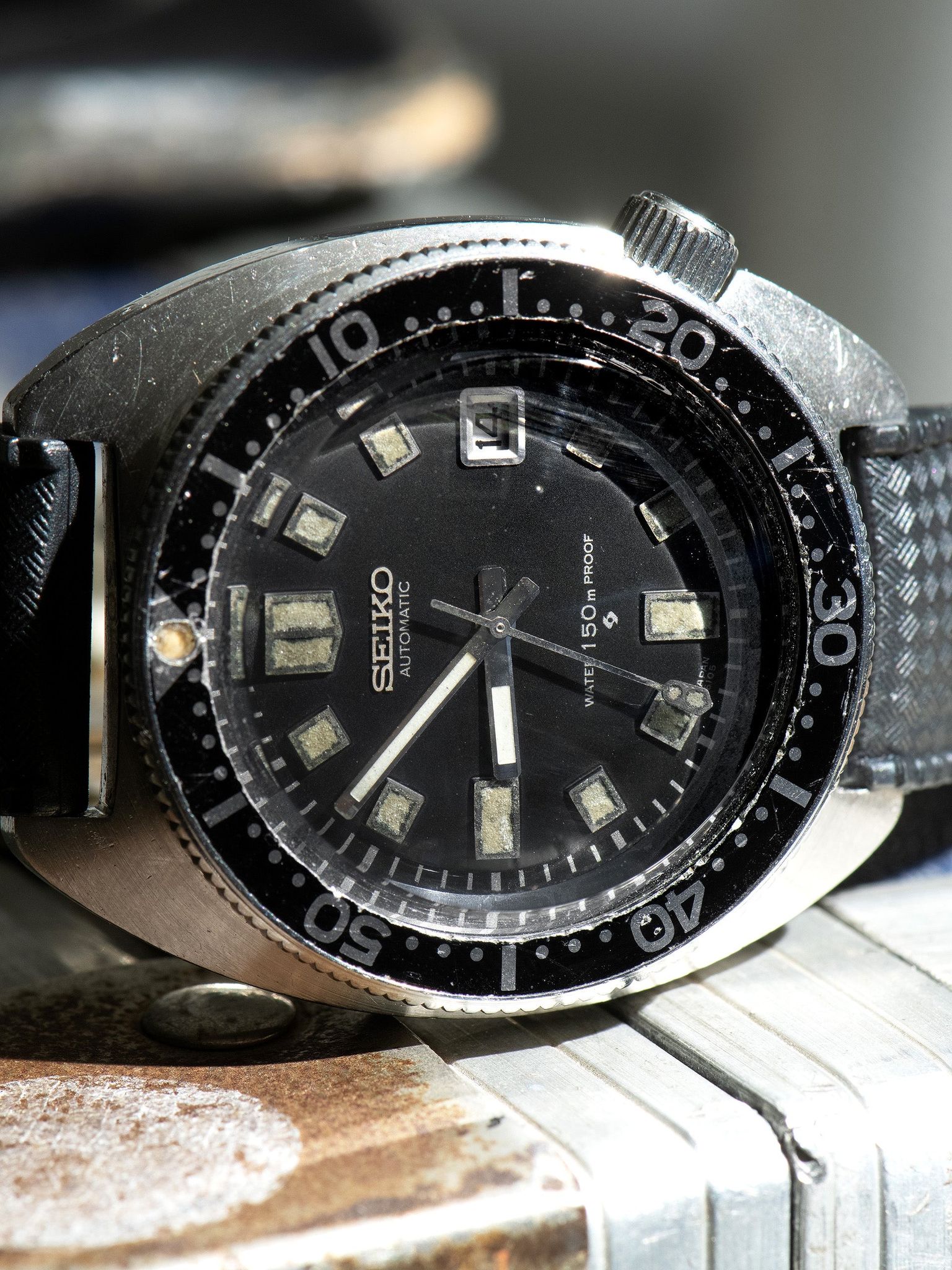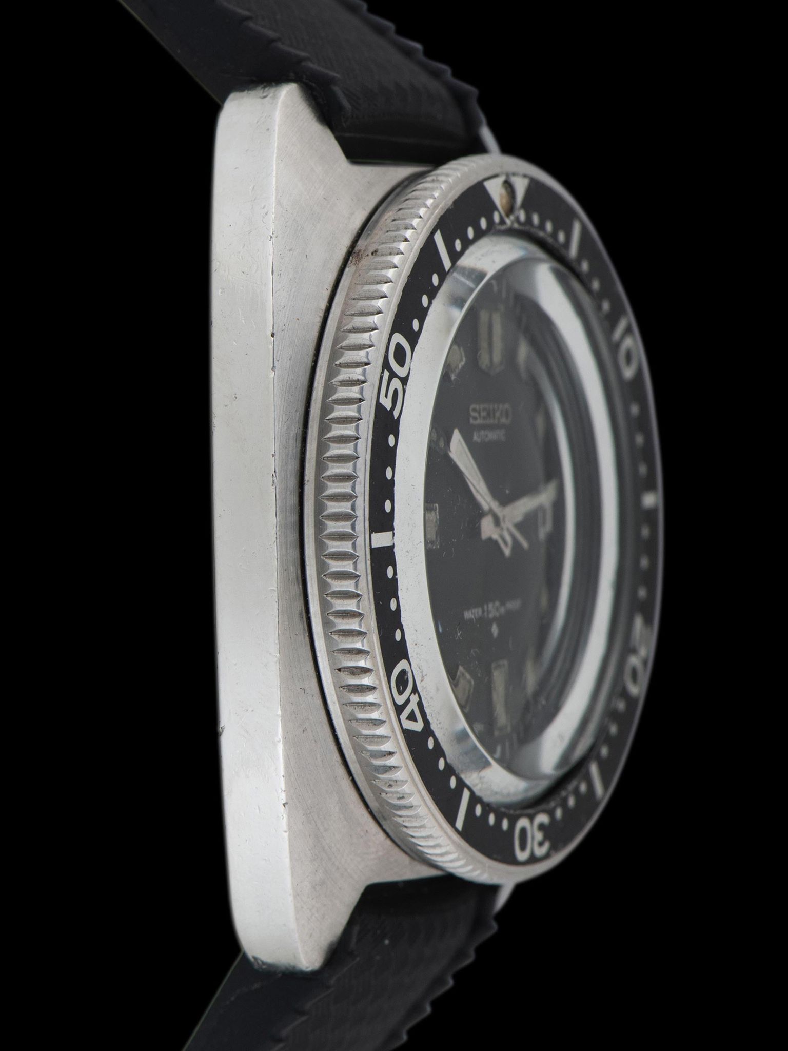 The C-shaped case measures 41 millimeters and is in excellent condition, showing signs of gentle polishing in the past and honest signs of use. It features a substantial steel crown set at the 4 o'clock position, moved from its usual spot to lessen the chance of its catching on anything. This deep black bezel exhibits honest wear, and the luminous pearl at 12 o'clock has patinated perfectly. The original "Water Proof" case back shows light signs of use with all of the factrot text and markings remaining present and in excellent condition. The watch will come supplied on an Uncle Seiko rubber tropic strap.