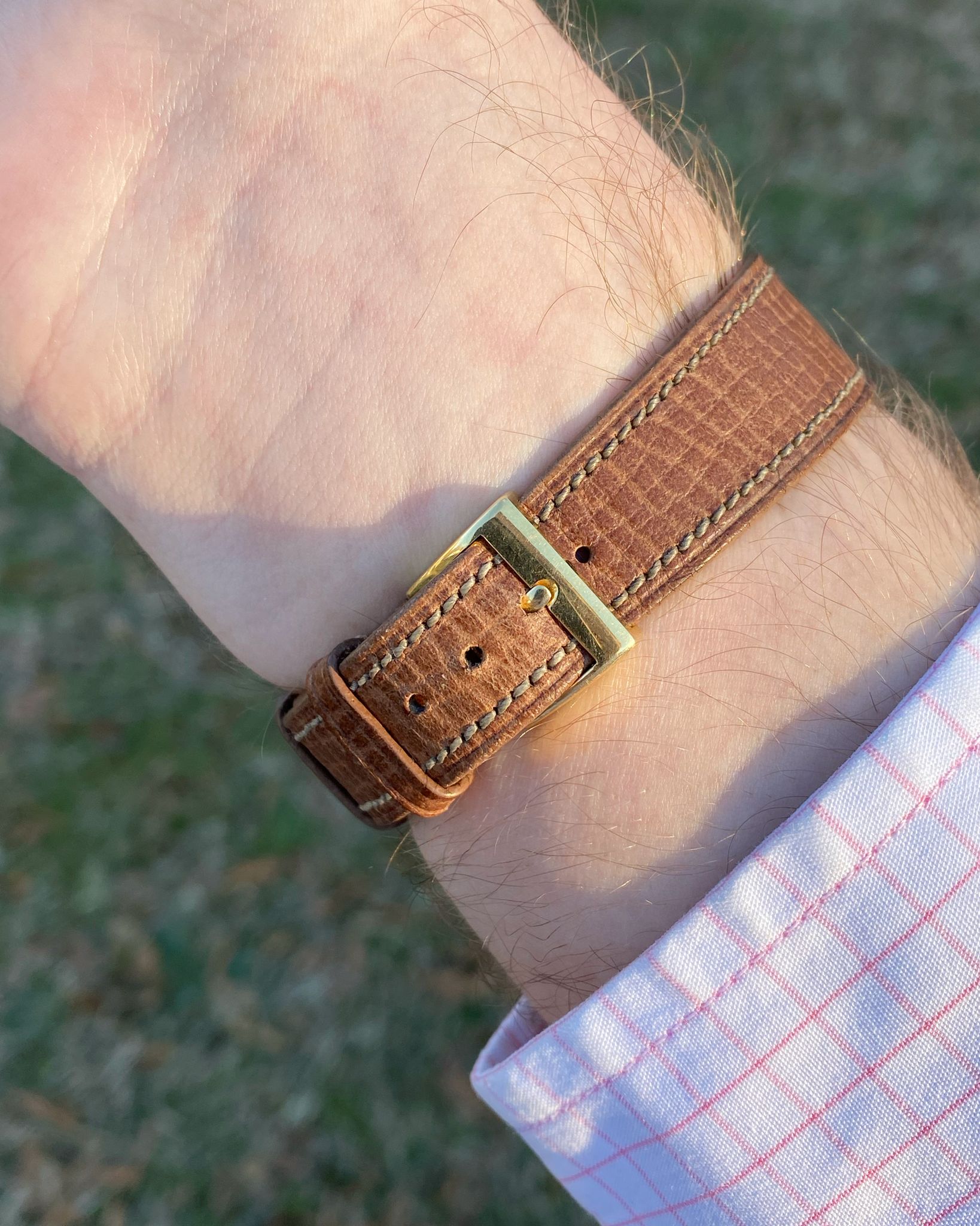 The Audemars Piguet features a brushed yellow gold “cushion” shaped tonneau case containing a cabochon sapphire crown. The Tonneau is mounted on a brown calfskin leather strap, which is secured by the watch’s original yellow gold AP signed Wenger tang buckle. The AP features a silver satin dial with black painted Breguet numeral hour markers and hand fired blued Breguet style hands. The movement used in the 5279BA is the Audemars Piguet caliber 2120, which is based on the ultra-thin Jaeger-LeCoultre Caliber 920, and is running flawlessly.