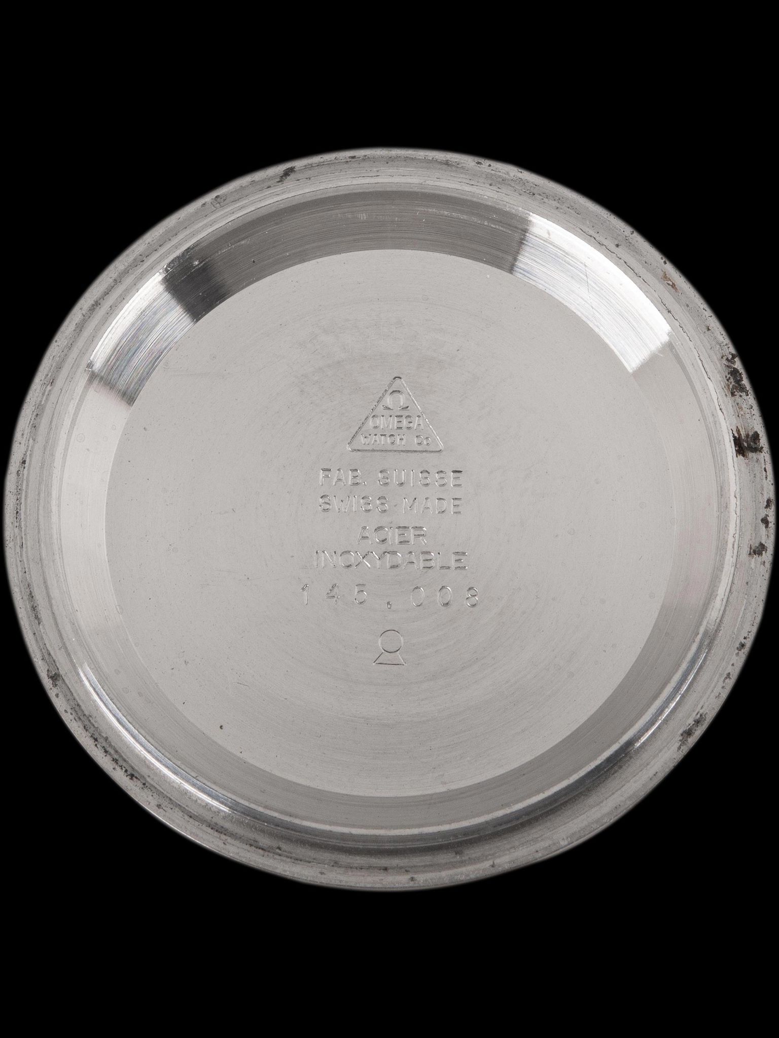 The handsome and robust tonneau style case retains crisp edges and factory finishing, with honest signs of previous use present. There is some oxidation on the top right lug though it is very subtle in natural light. The crown that operated the hands at 4 o'clock and the crown the operates the bezel at 11 o'clock are both original to the watch, as is the single pusher button at 2 o'clock. The case back retains its factory engravings in very crisp condition. The Omega 1170 bracelet with 625 end pieces retains 22 links that show light stretch and will fit up to a 7 3/4-inch wrist.
