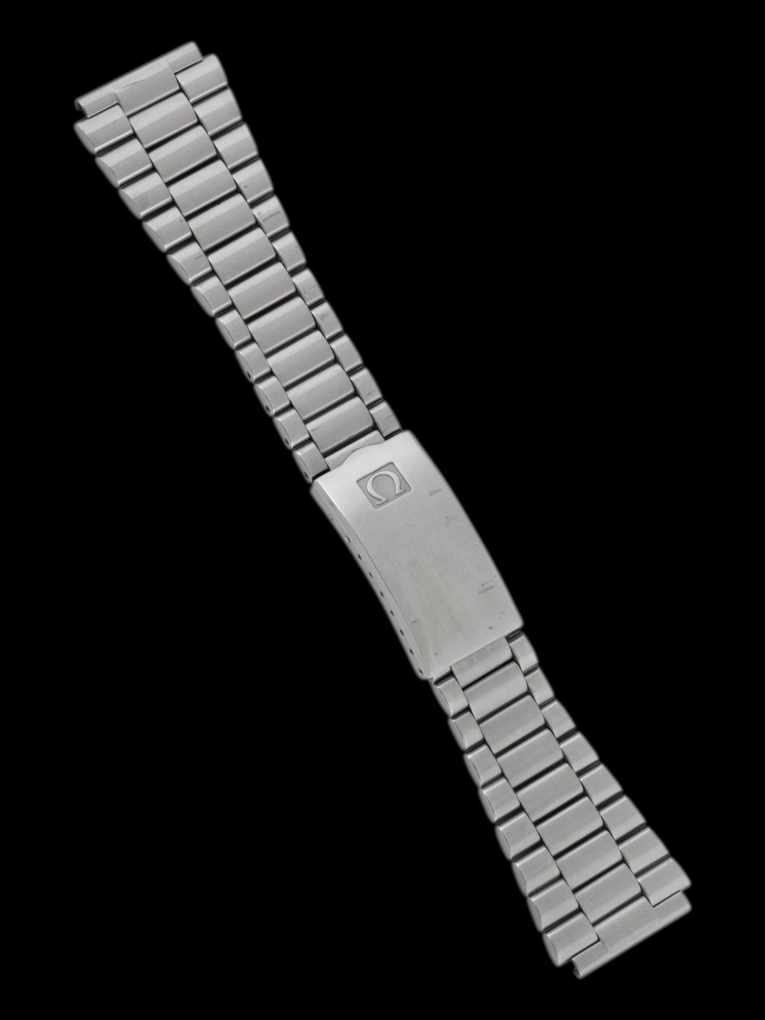 The classic barrel-shaped case remains in wonderful condition, exhibiting light evidence of previous polishing with honest signs of light use present. The original mineral glass crystal is in great condition overall with a very minor chip between 1 and 2 o'clock. The Omega signed crown and pump pushers are original to the watch. The original factory engravings on the case back remain fully present but have softened from wear and polishing. The original Omega 1159 bracelet with 154 end pieces retains 22 links that show light stretch and will fit up to a 7 3/4-inch wrist. The watch comes with an additional Omega 1162 / 173 bracelet.
