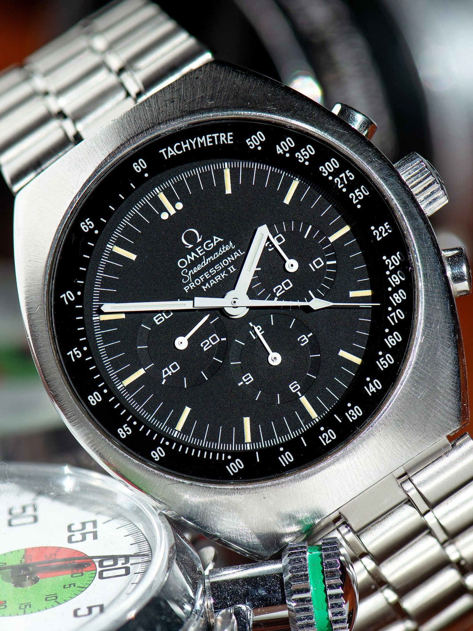 The Speedmaster MARK II came with the same Lemania-based movement as the original Speedmaster Professional "Moonwatch", reference 145.022. This watch contains Omega’s original caliber 861 movement and was in production from 1968 and lasted until 1996 when Omega introduced the Caliber 1861 movement. Unlike the Speedmaster Professional, the Omega Speedmaster MARK II has a barrel-shaped case that has polished chamfers and a brushed top and sides, giving it a different look from the standard Speedmaster Professional case worn by NASA Astronauts. The classic timing scale that the Speedmaster is known for is also different; it is under the mineral glass crystal and not externally located on the outside of the crystal as an external bezel, in essence, protecting the timing scale from scratches or disruption. Unlike modern timepieces with scratch-resistant sapphire crystals, pieces of this era were assembled with mineral glass crystals.