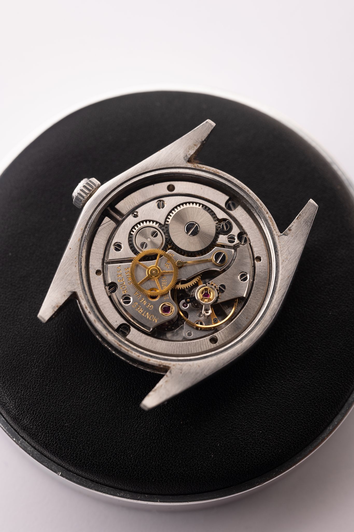 Description: The 6694 is a 34mm mechanical watch from Rolex. This silver dial is in excellent condition and has golden pumpkin plots 6694’s are lesser known as they are not automatic but instead their mechanical wound movement has been considered to be even more reliable due to its simplistic nature. This mint dial is also a mosaic / linen dial which is seldomly seen.