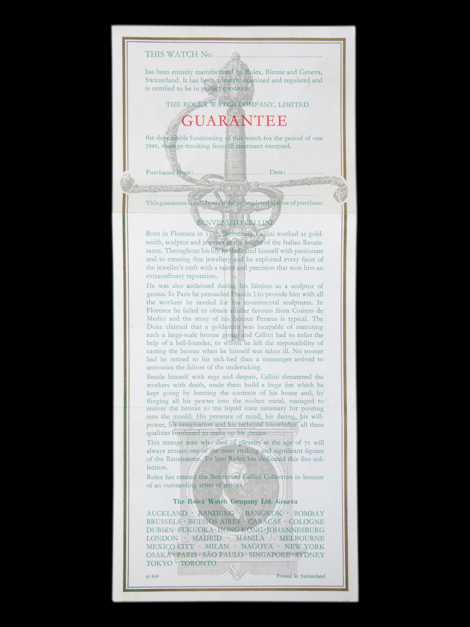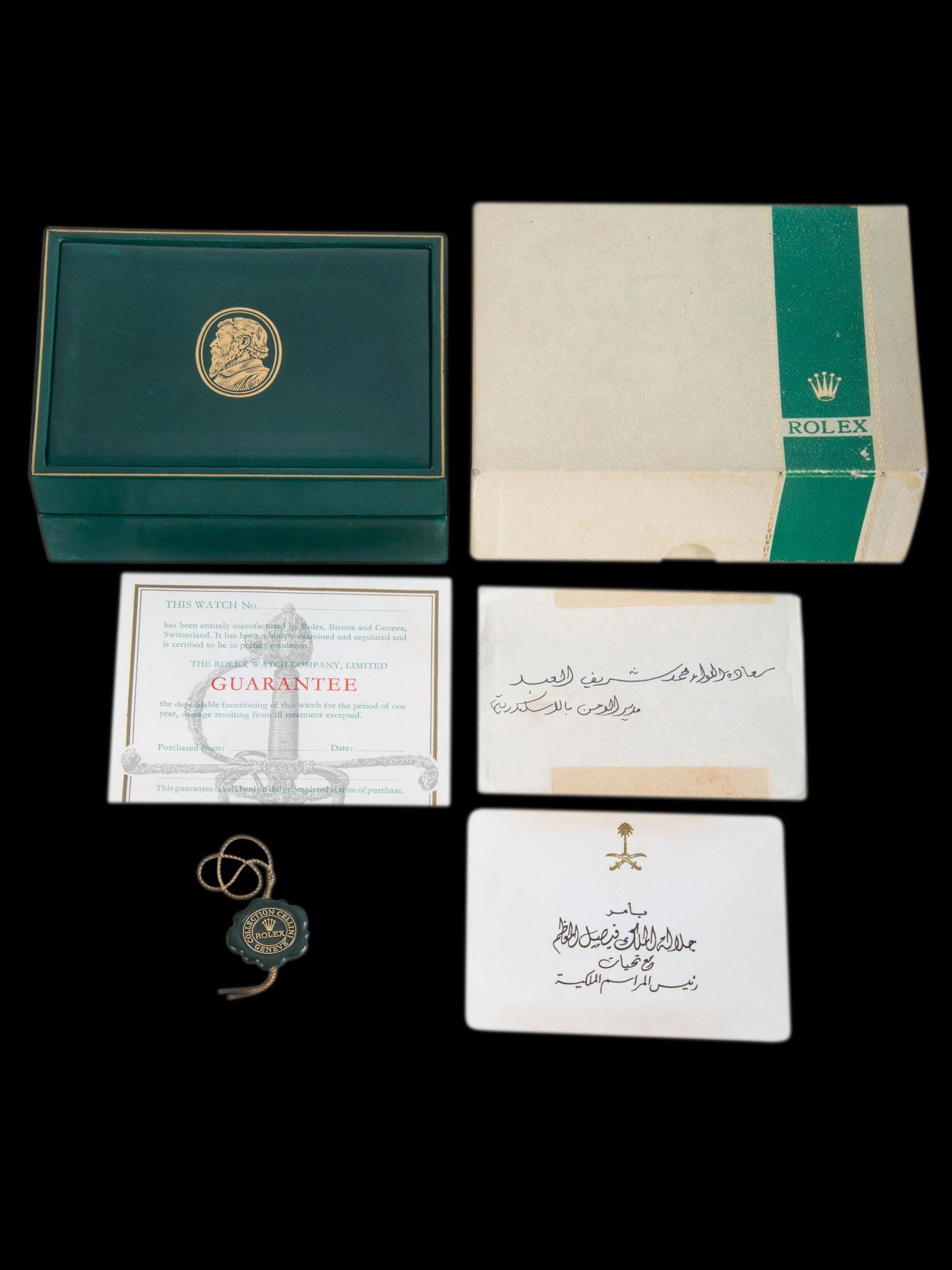 The watch comes with the original inner and outer boxes, Cellini hang tag, Rolex Guanatee pamphlet which remains unfilled out, and the gift envelope. The outside of the envelope reads "His Excellency, Dr. Muhammad Sharif Al-Eid, Director of Alumni in Alexandria" and the card reads "By Order of His Majesty King Faisal, with compliments, from the Chief of Royal Protocol. The watch is keeping time, but the service history is unknown. A movement service can be provided upon request.