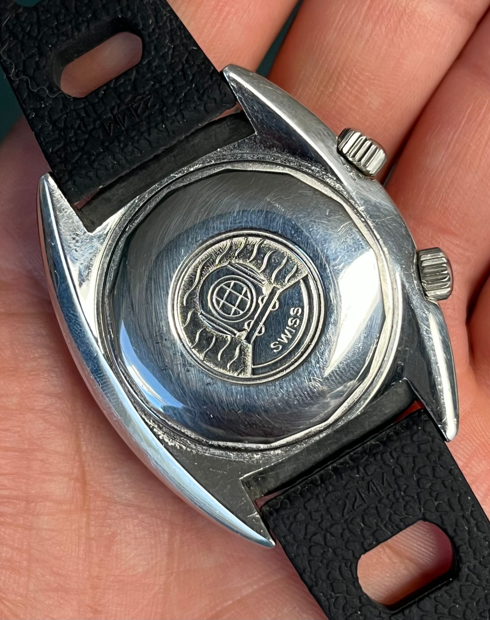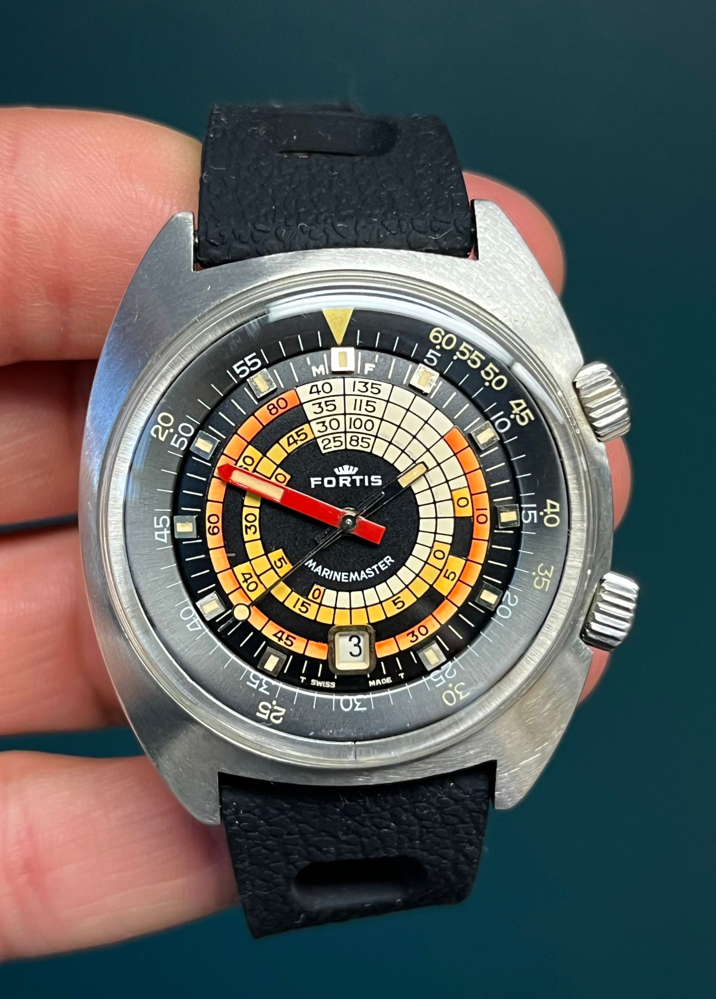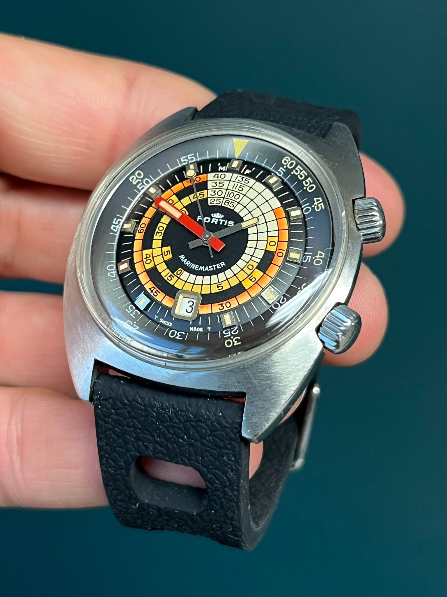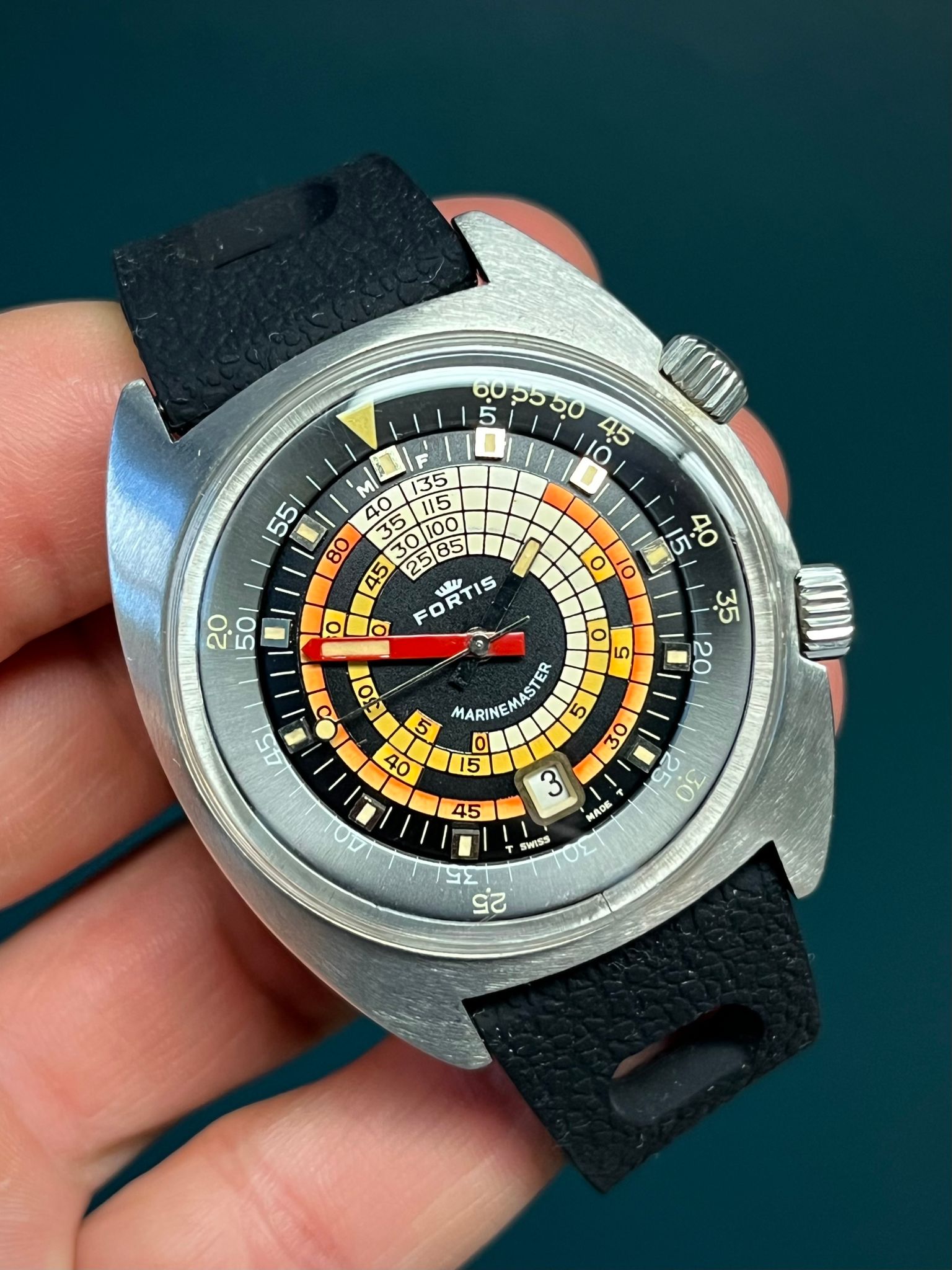 The Fortis Marinemaster Ref. 6237 from the 1970s is a true vintage diver’s gem, instantly recognizable for its bold decompression table dial rendered in vivid red, orange, white, and black. Housed in a rugged “super compressor” case by Ervin Piquerez S.A. (EPSA), it features dual crowns — the lower crown at 4 o’clock for setting the time, and the upper crown at 2 o’clock for operating the internal rotating bezel. The screw-down case back proudly displays the EPSA diving helmet logo along with the model’s details, underscoring its professional-grade heritage.