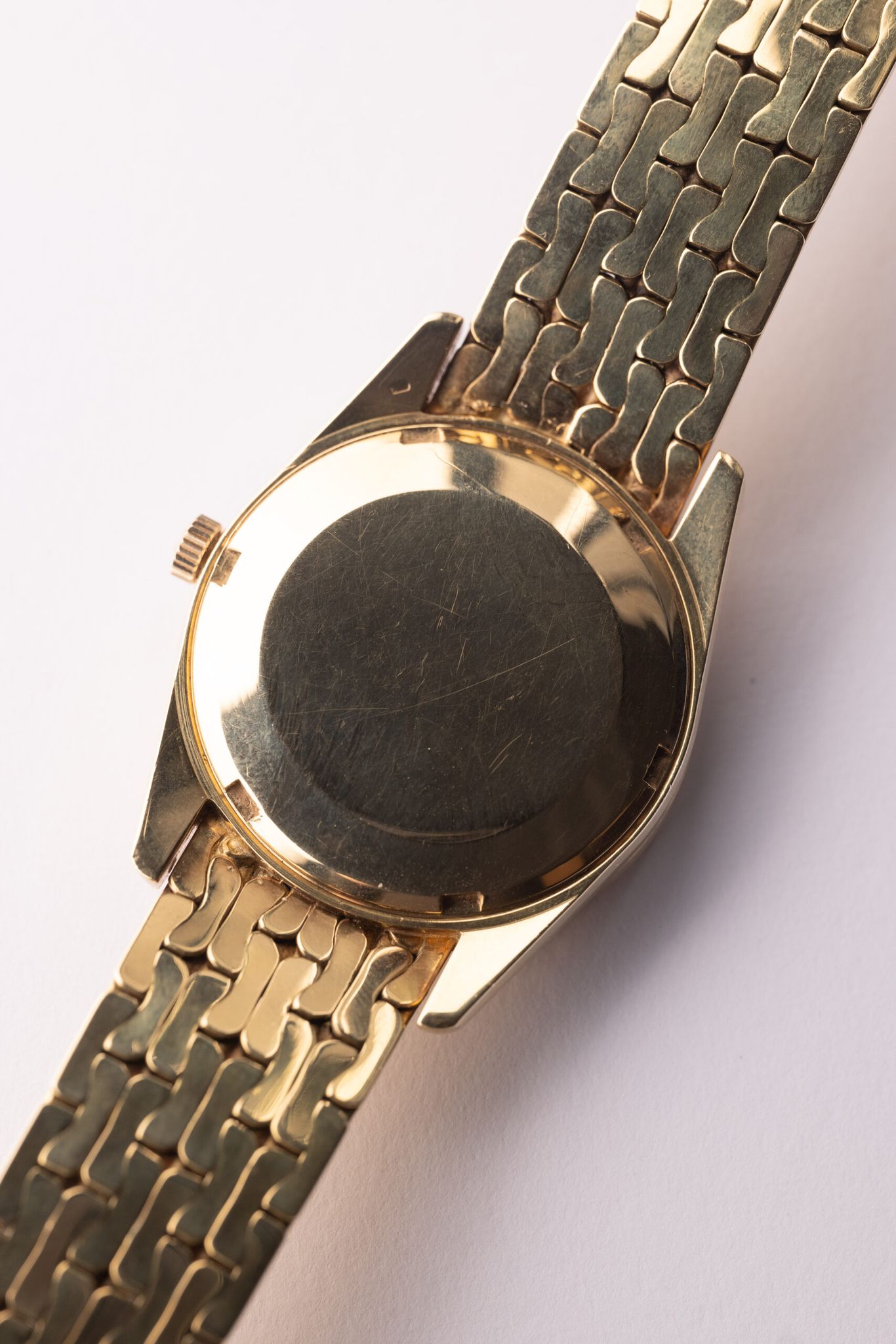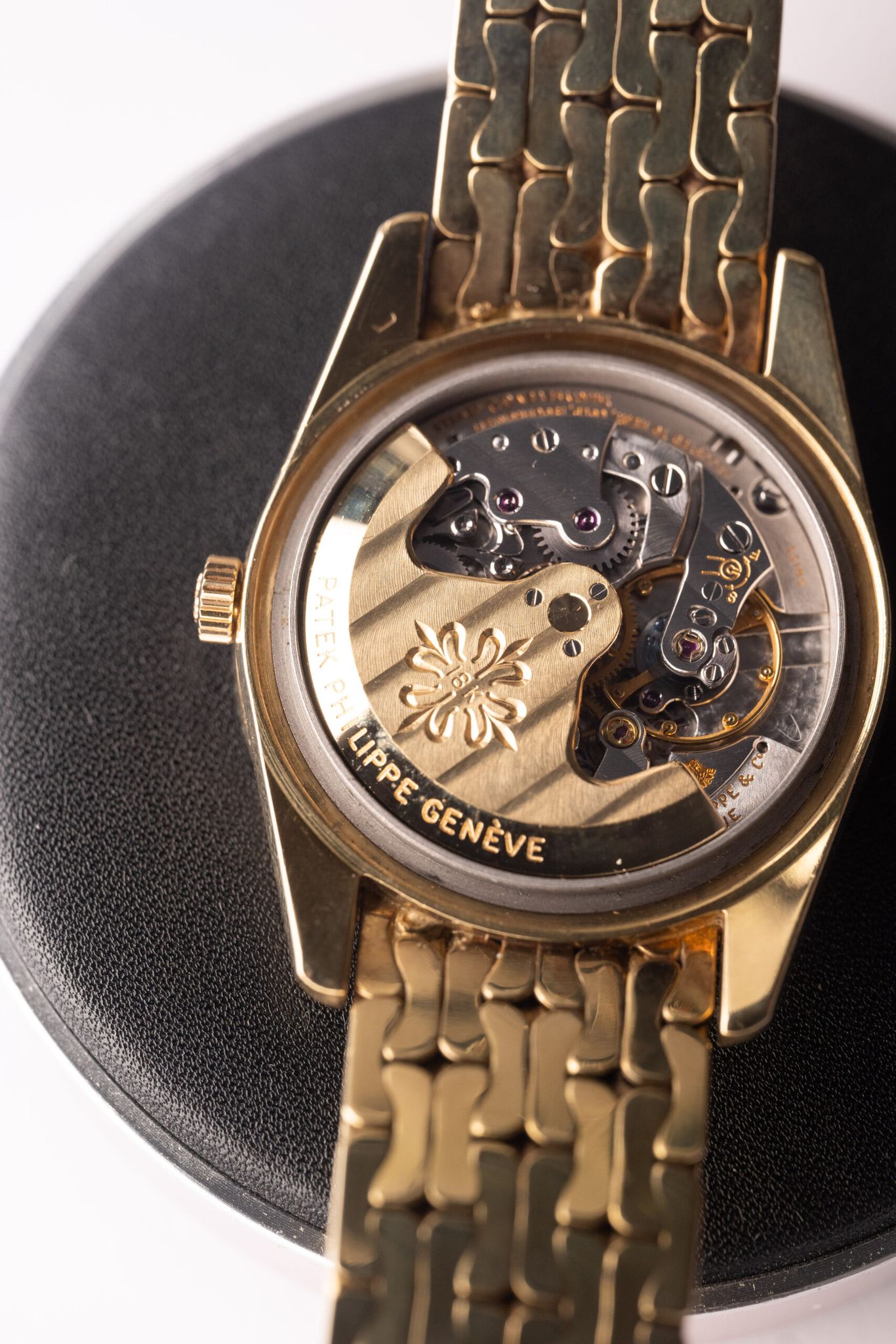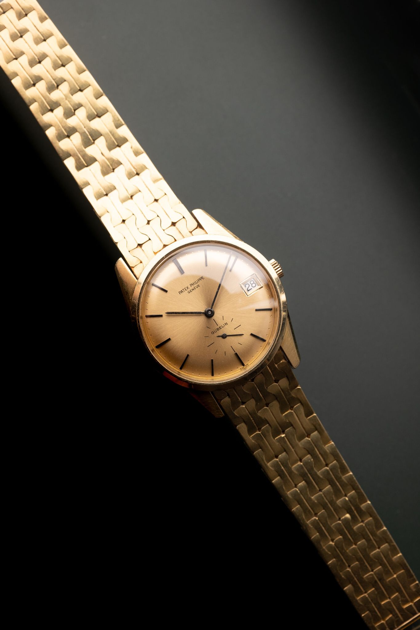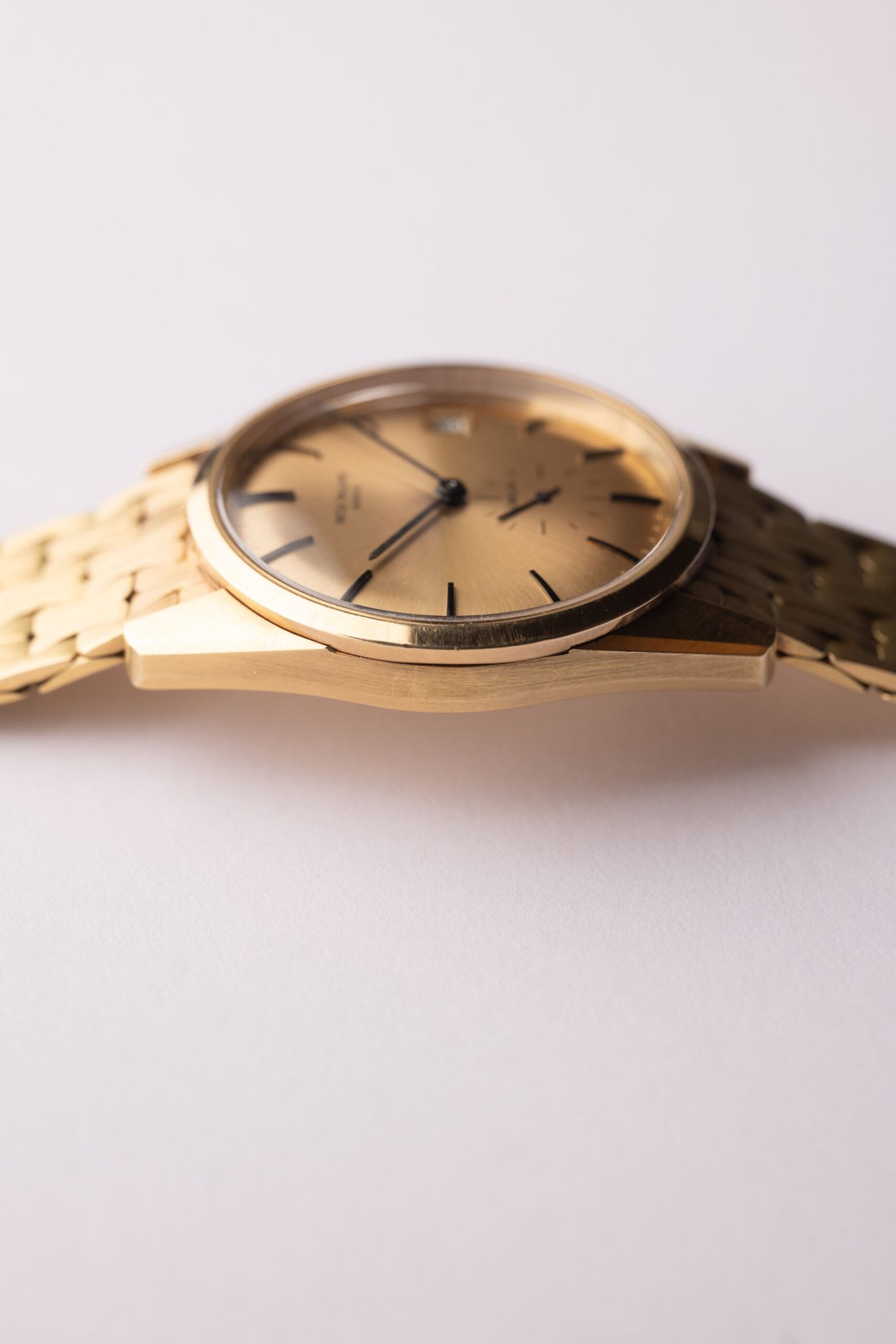 An iconic dress watch, the 3558 is a rare Calatrava reference whose Gübelin stamped variations make them rarer still. 18k yellow gold case, brushed gold face, finished with an integrated bracelet – timeless Bauhaus Patek Philippe physique.