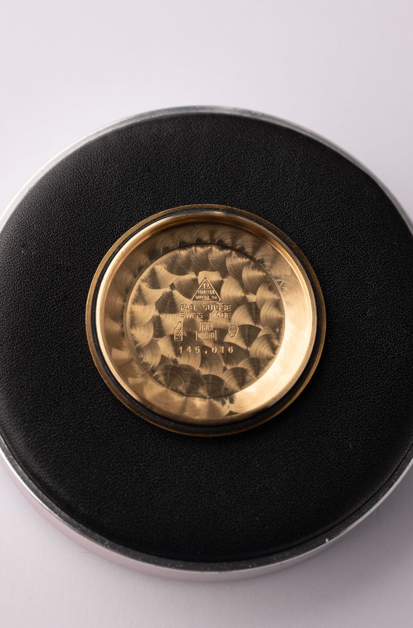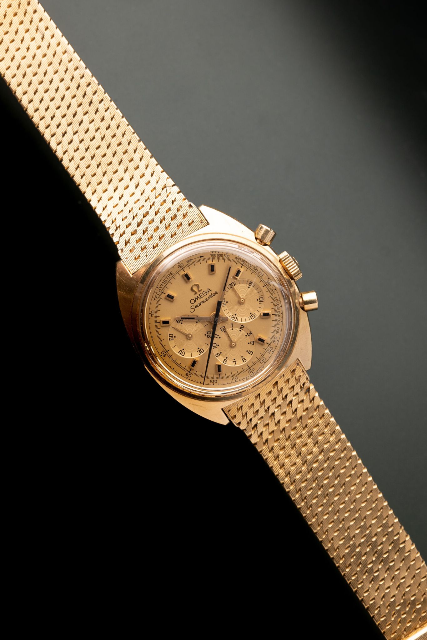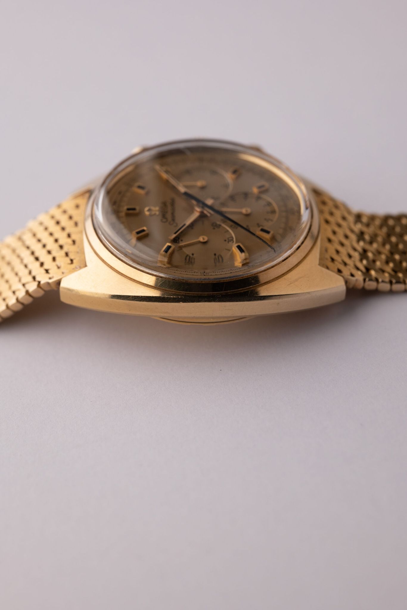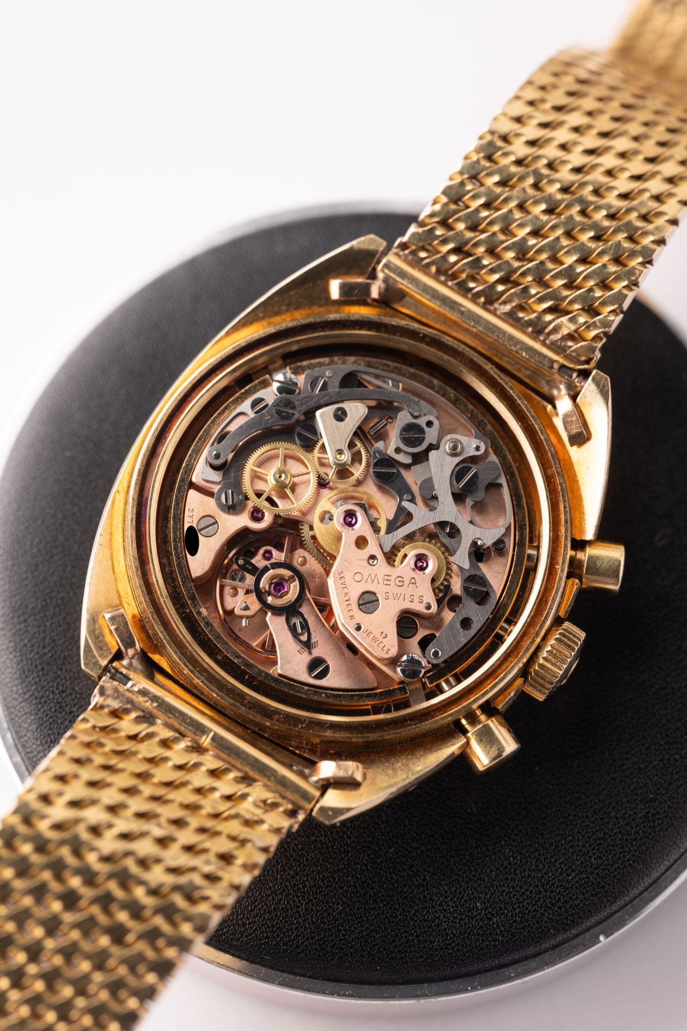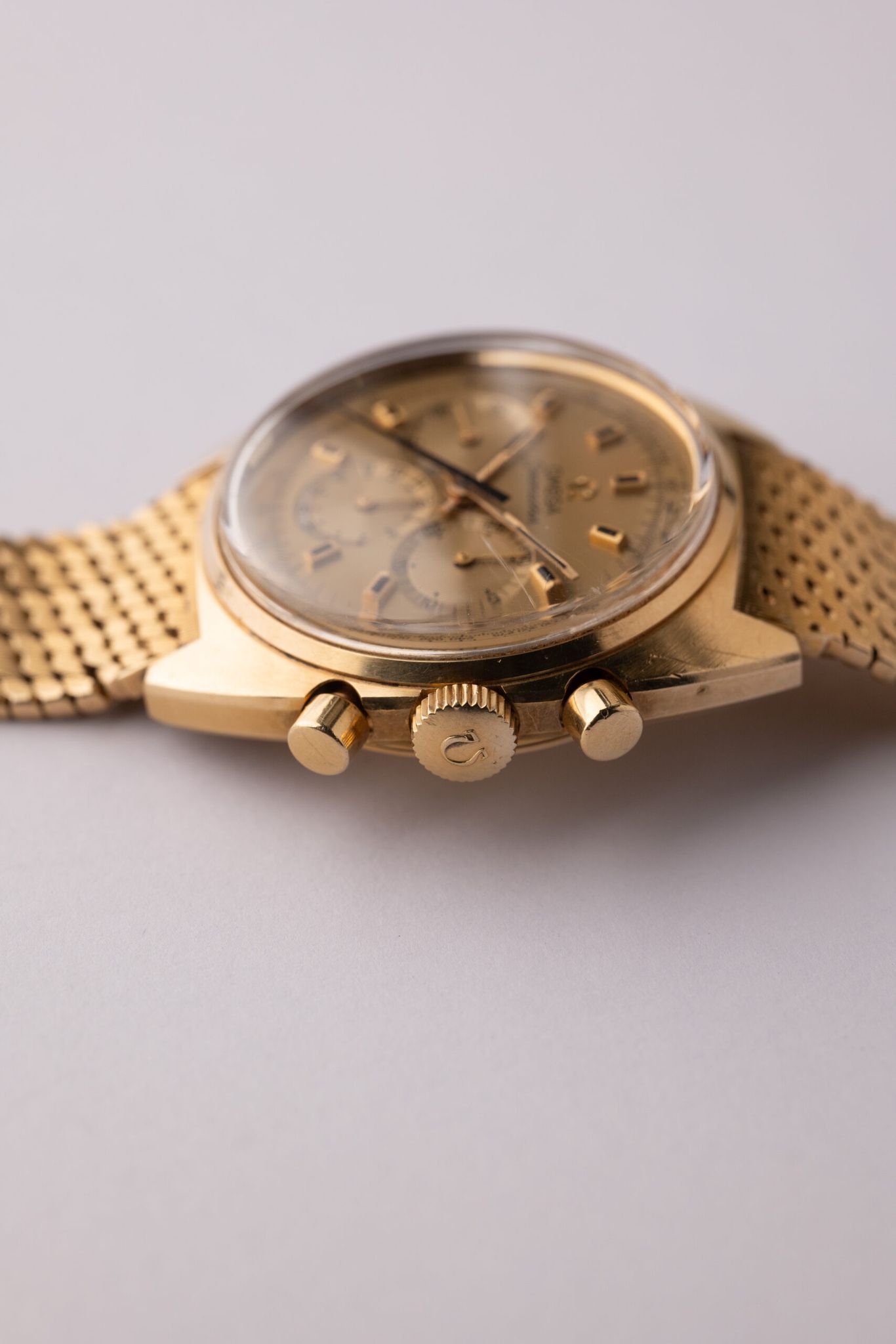 The 145.016BA retains a chronograph function despite not bearing the familiar Speedmaster name. Movement retains the 861 movement and the case is similar to a button case in 38mm. Bracelet is an excellent woven gold band.