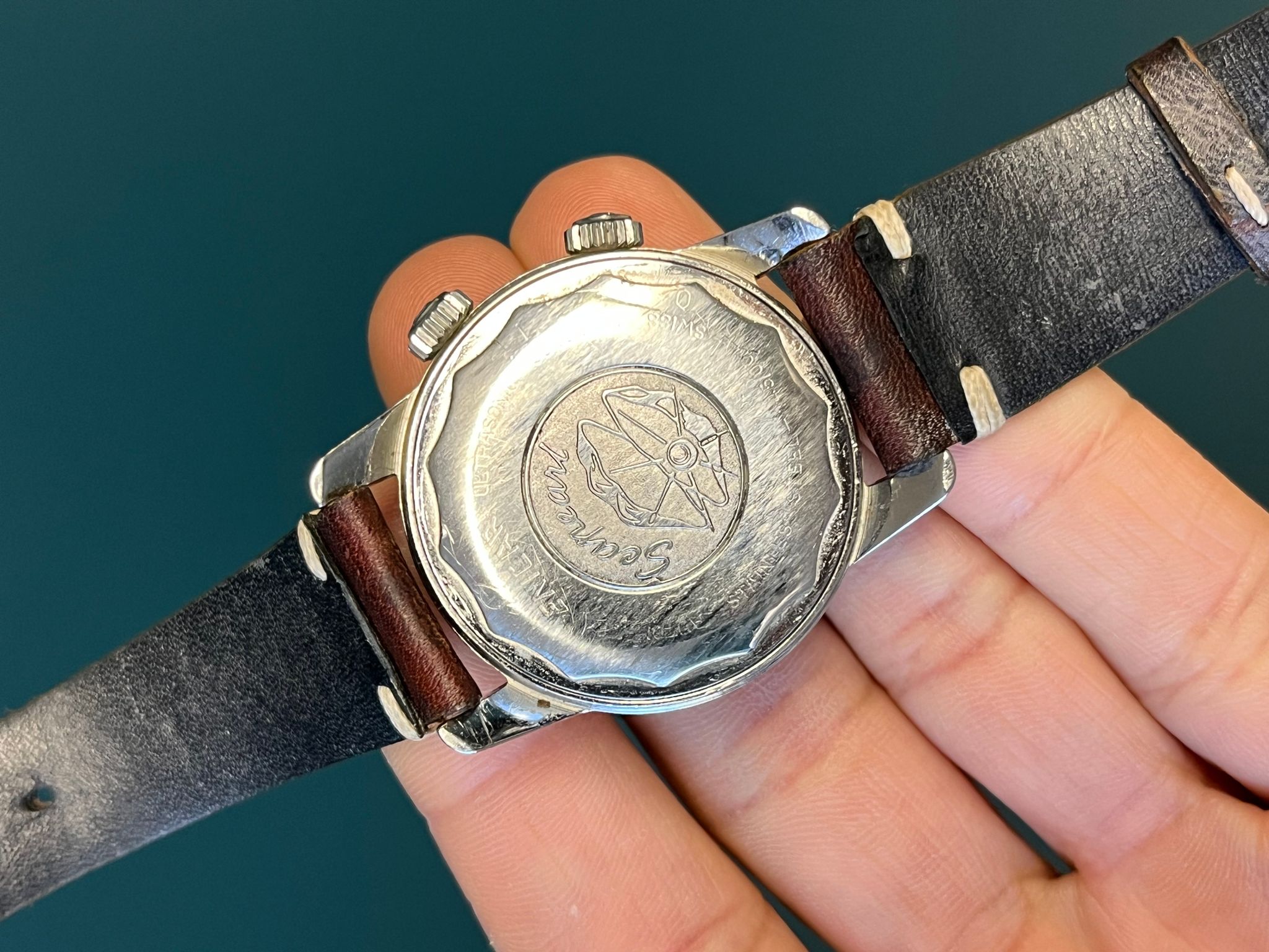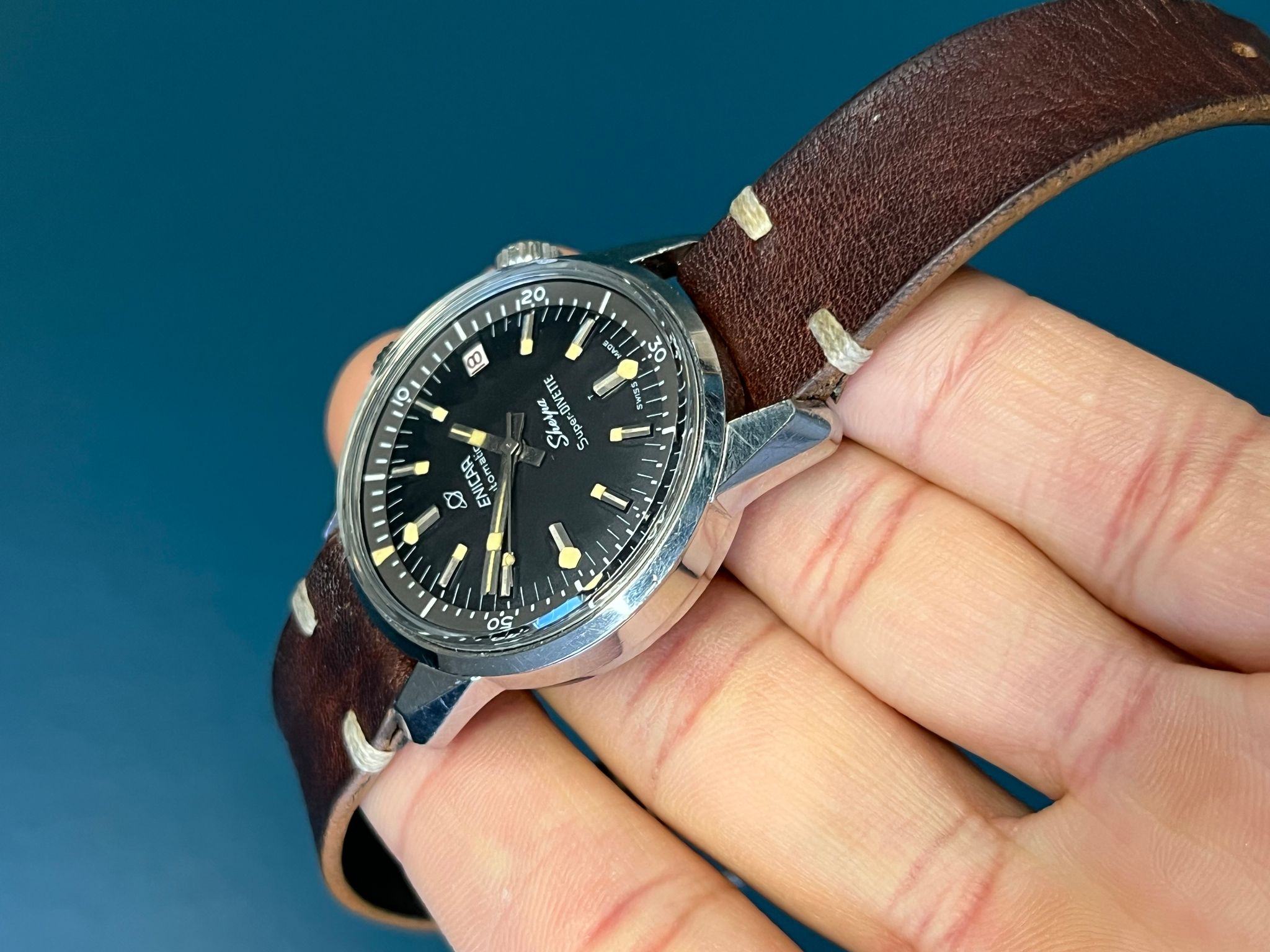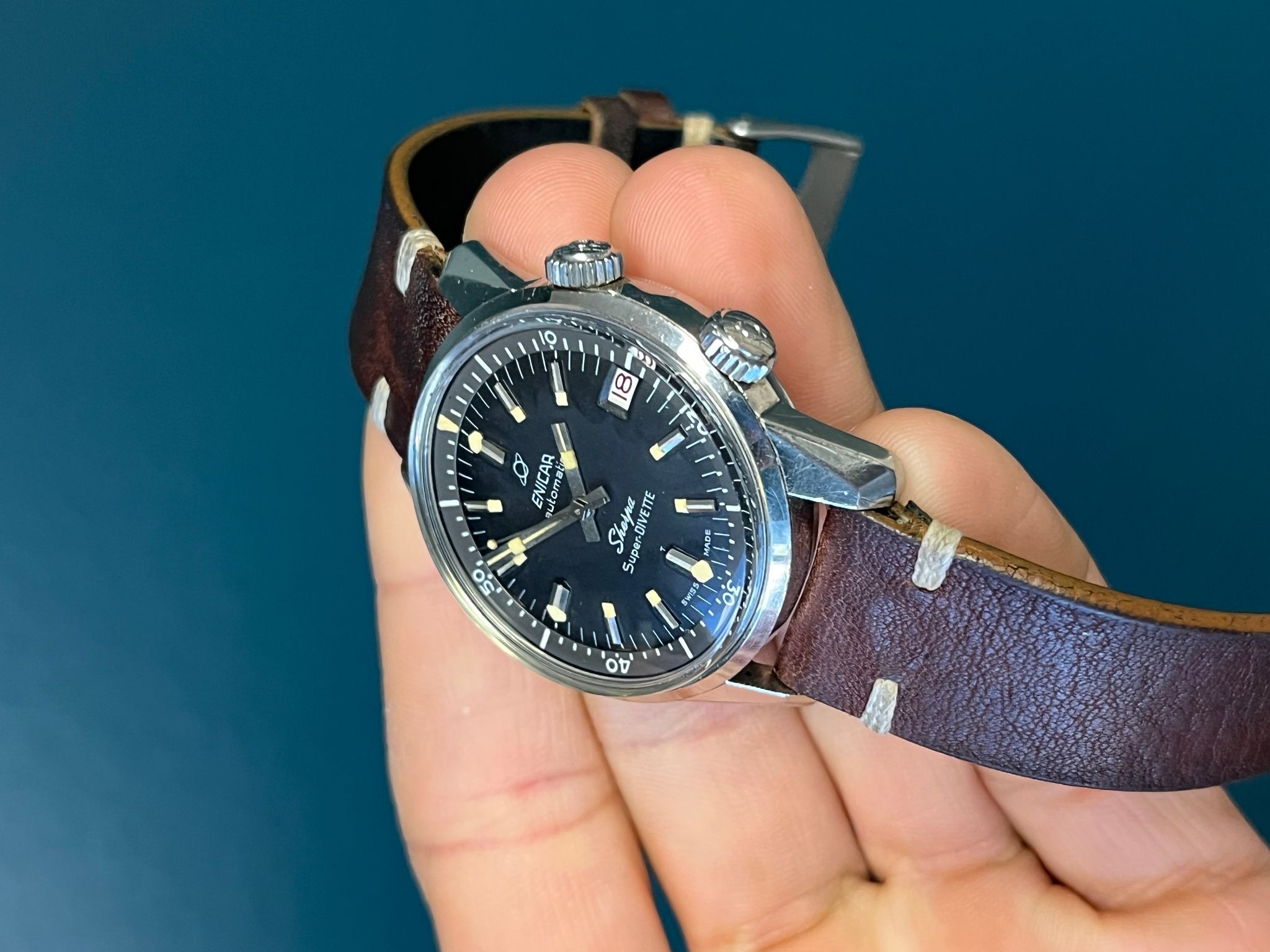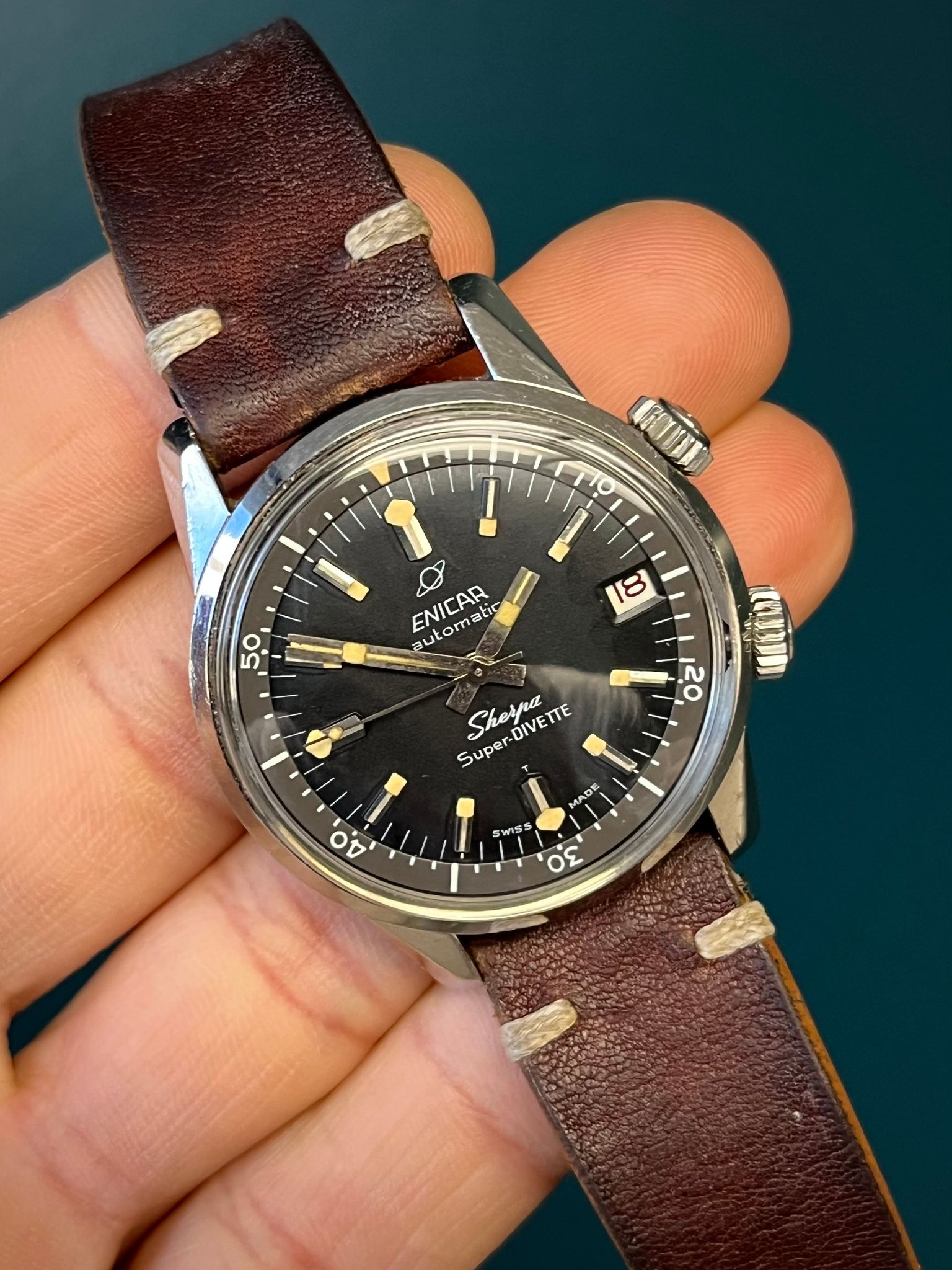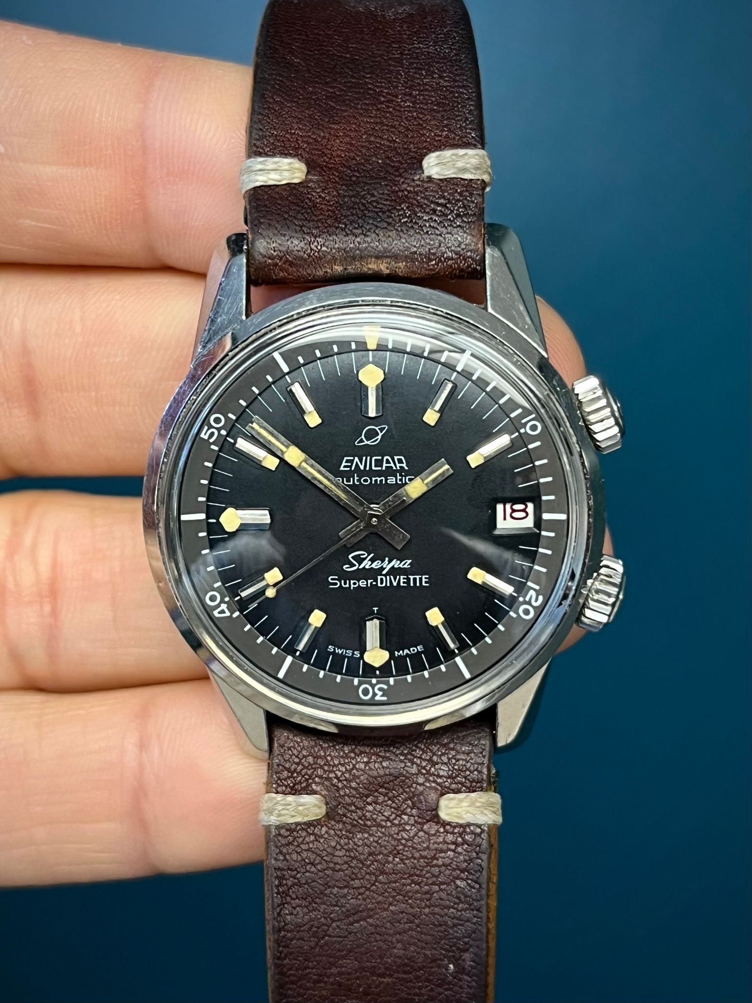 The Vintage Enicar Sherpa Super Divette Reference 145-004 is a highly sought-after diver’s watch, cherished for its robust design and rich history. This example, in excellent all-original condition, retains its untouched charm, featuring a striking black dial with all-matching yellow patina across the hour markers and hands, adding to its vintage appeal. The watch is equipped with Enicar’s signature dual-crown compressor case, ensuring water resistance and functionality, while the internal rotating bezel remains crisp and legible. The stainless steel case appears unpolished, preserving its original lines and character. Powered by a reliable automatic movement, this Sherpa Super Divette is a true collector’s piece, embodying the golden era of dive watches with both style and performance.