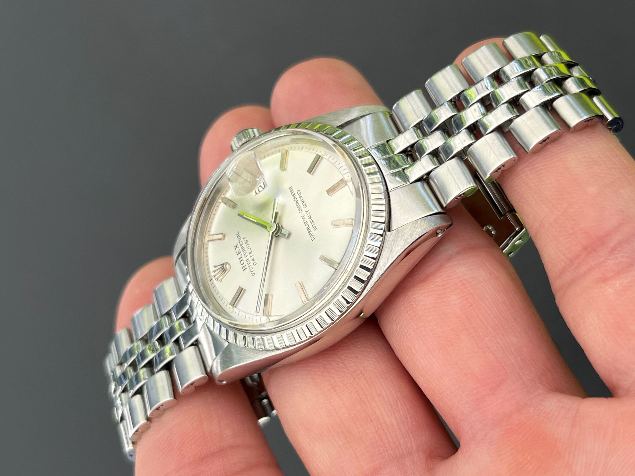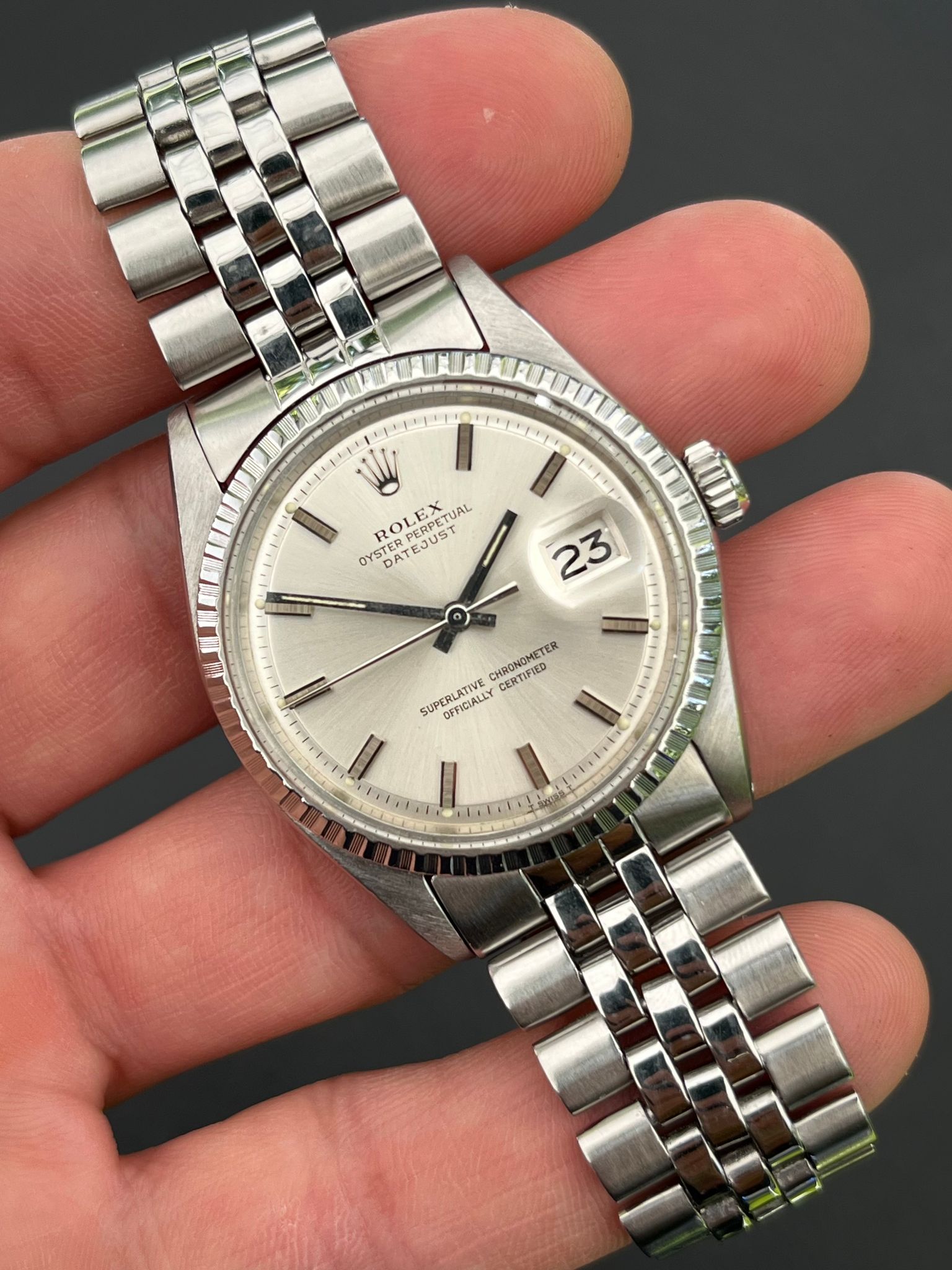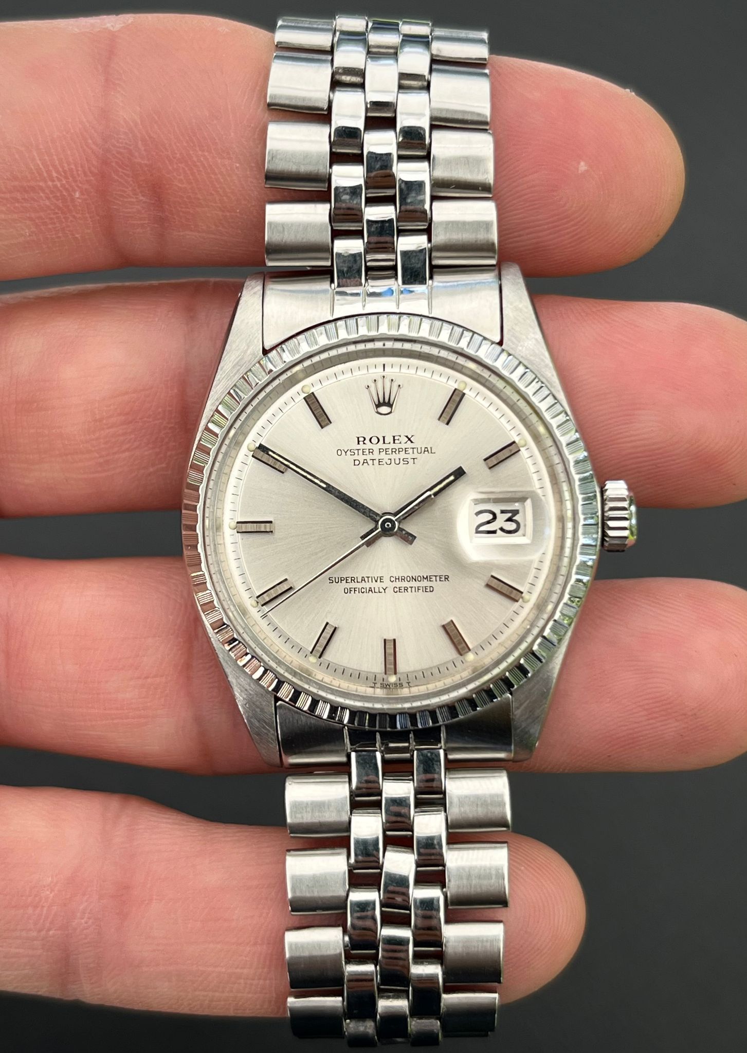 The Vintage Rolex 1603 Date just is an iconic watch known for its classic design, precision, and historical significance. With a stainless-steel case, a distinctive engine turned bezel, and a reliable automatic movement, this 36mm timepiece is a versatile choice suitable for both men and women. The watch's date function, with the signature Cyclops lens, adds to its practicality and aesthetic appeal. It's a piece of horological history, dating back to the early 1960s and early 1980s, showcasing Rolex's enduring commitment to craftsmanship and innovation.