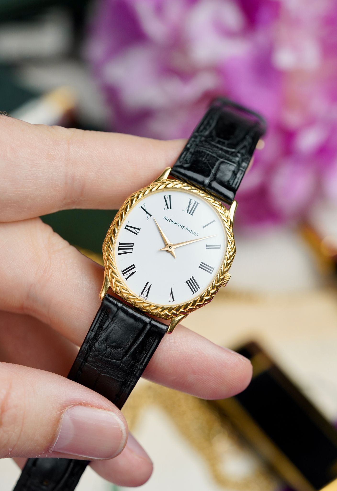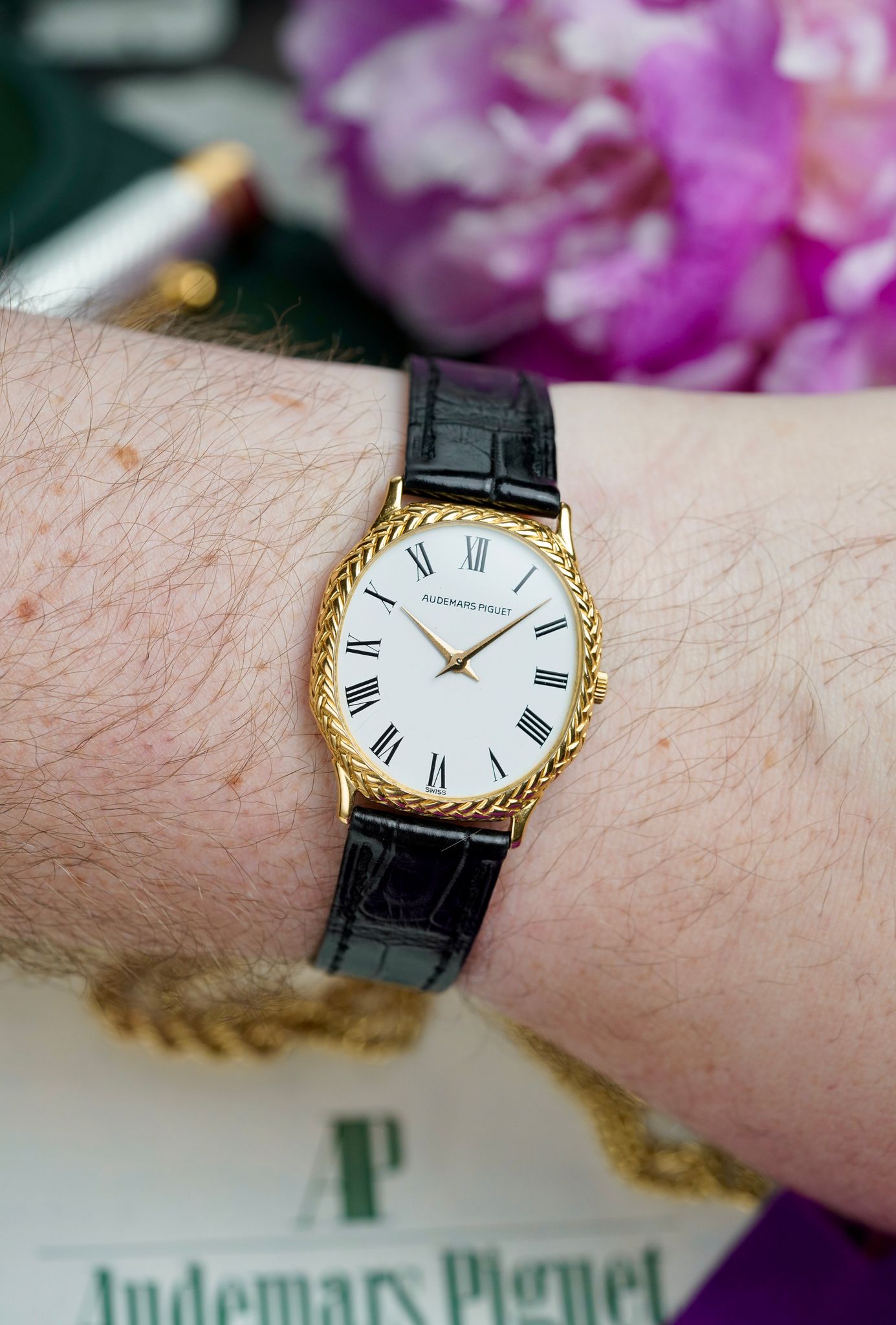 This absolutely stunning creation from the house of Audemars Piguet is exactly what we like to see with vintage dress watches from this brand. Classic with a twist - literally. Textured cases from AP are some of my favorites. Measuring 33mm top to bottom and 25mm across, this watch is bold on the wrist without being unwieldy.