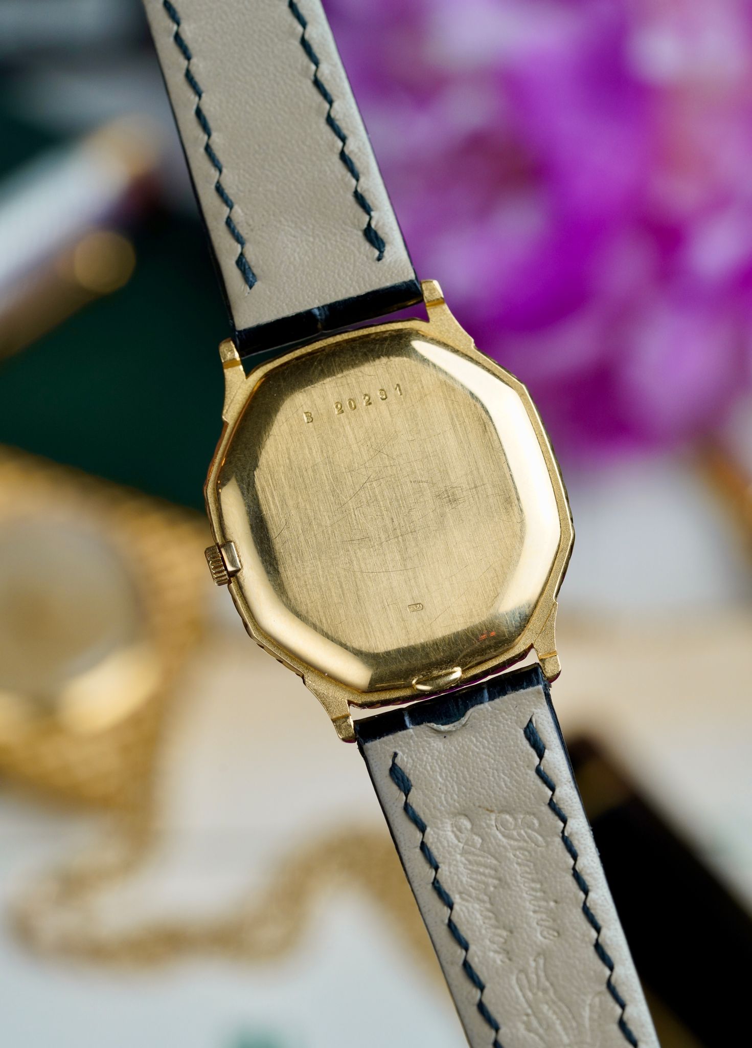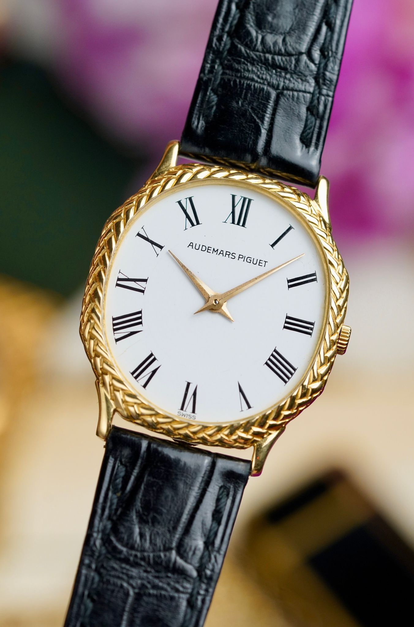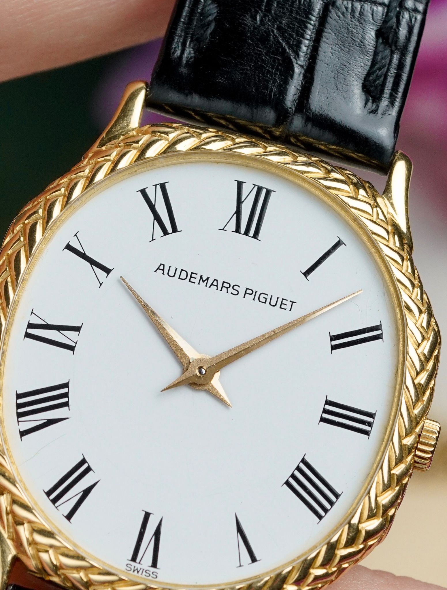 A gorgeous 1970s Audemars Piguet octagonal tank with an intricate braided 18K yellow gold bezel, a complete full set with original papers, folio, pouch and guarantee, powered by a manual wind caliber.