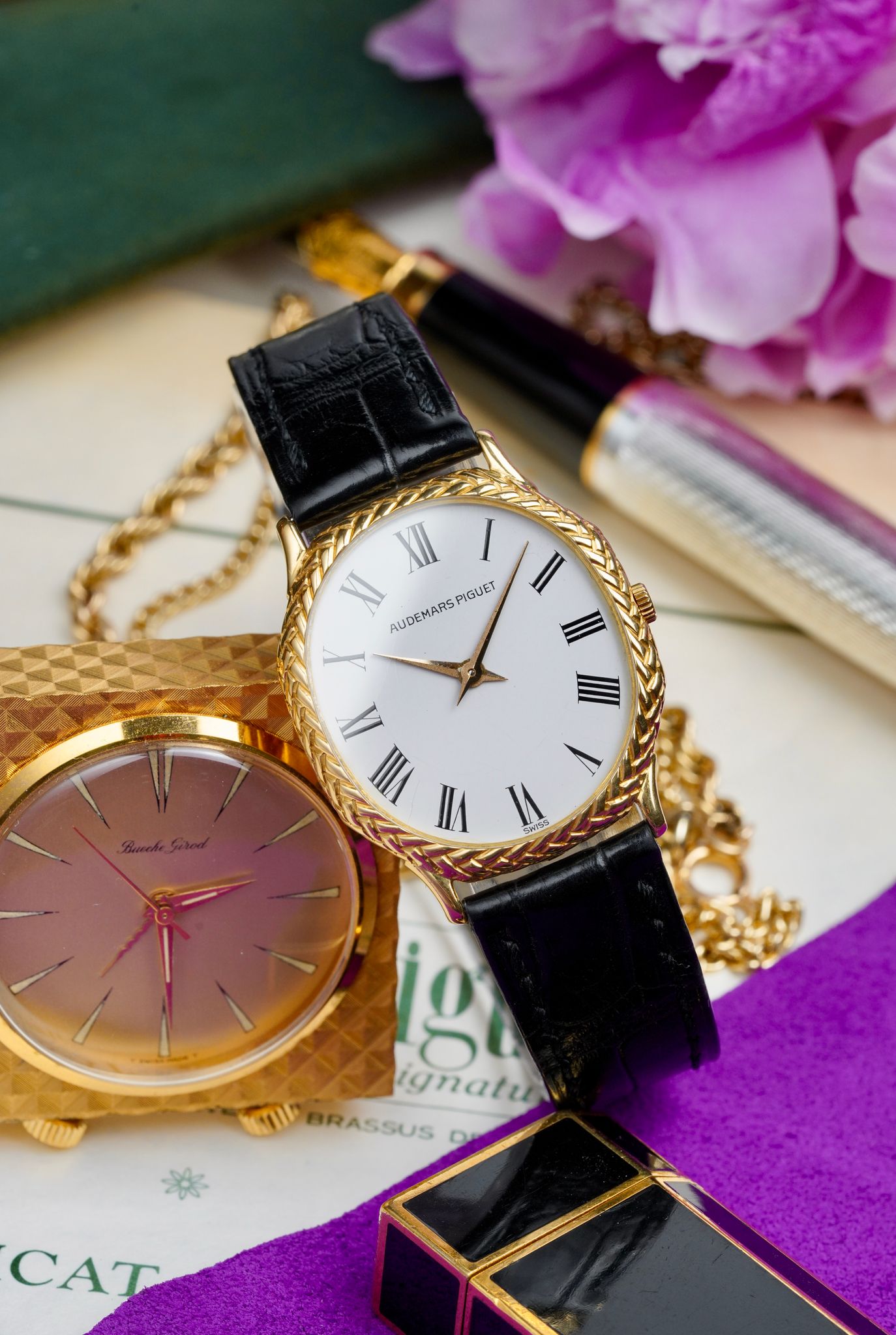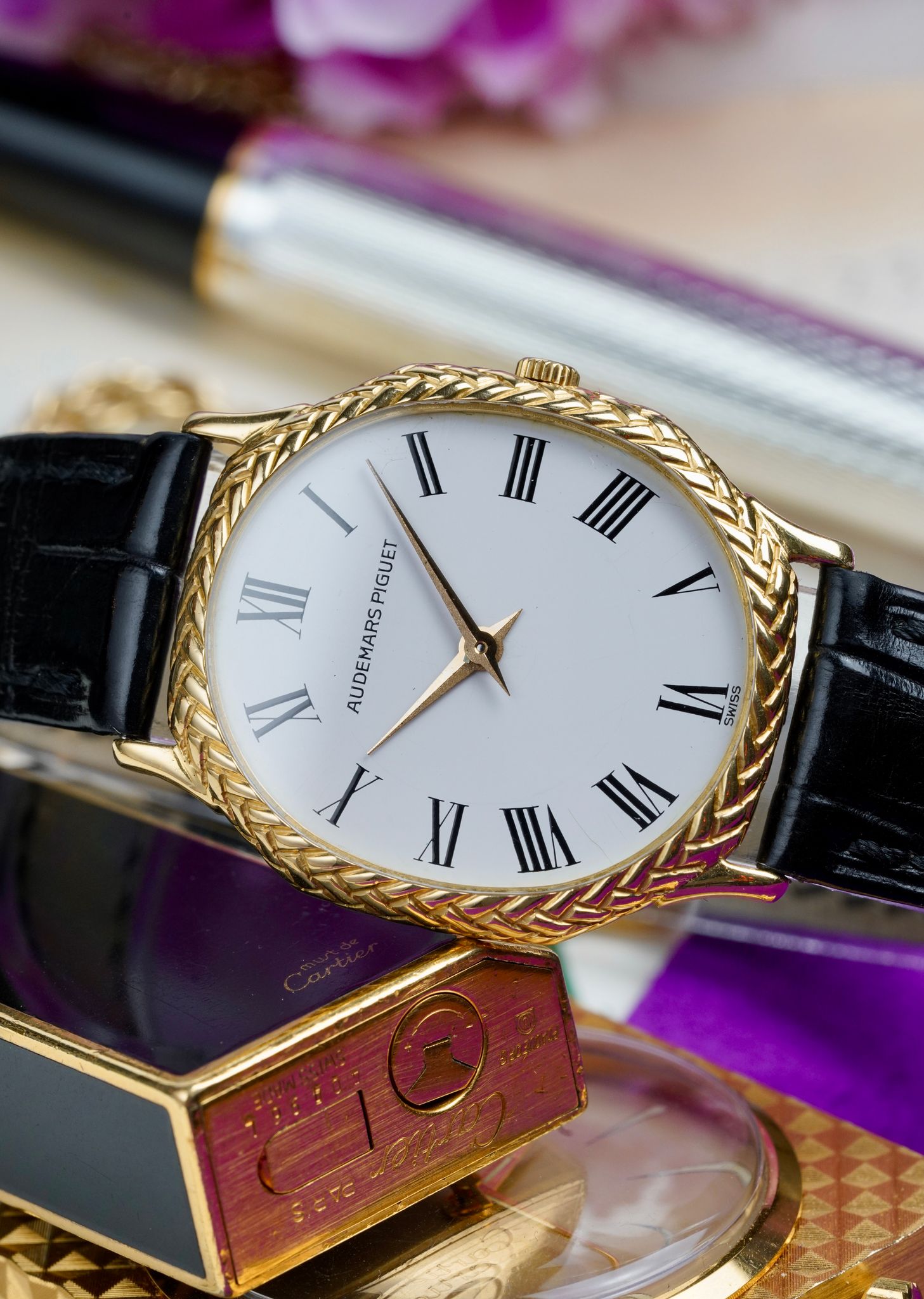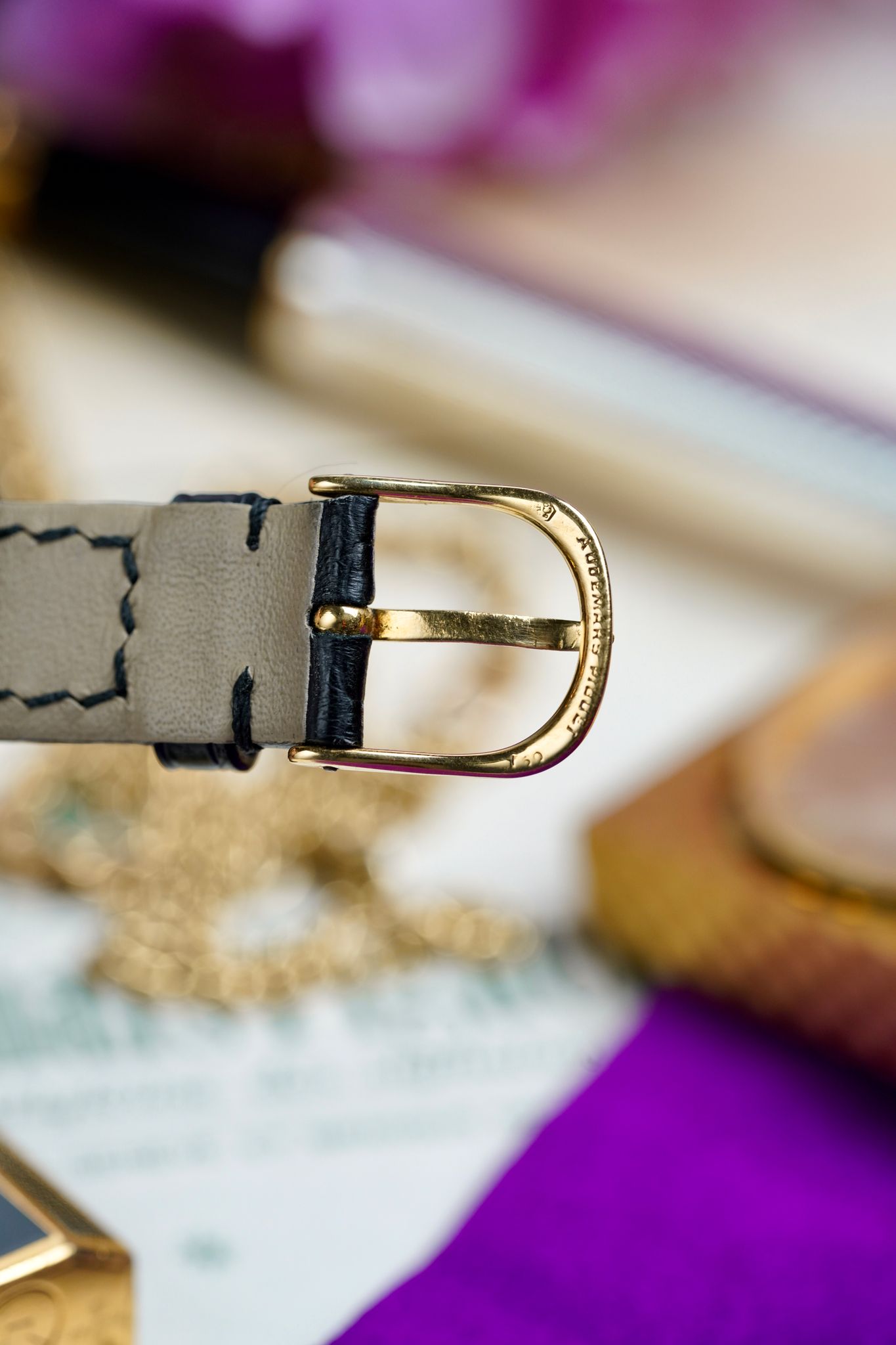 A gorgeous 1970s Audemars Piguet octagonal tank with an intricate braided 18K yellow gold bezel, a complete full set with original papers, folio, pouch and guarantee, powered by a manual wind caliber.