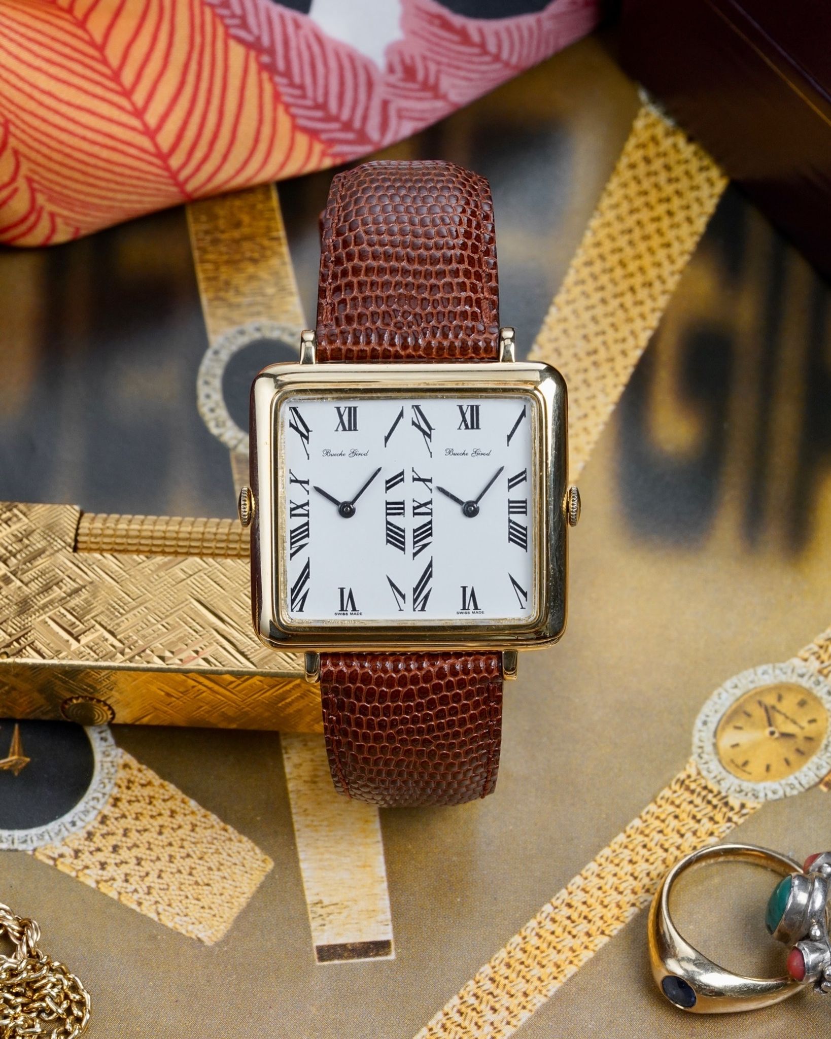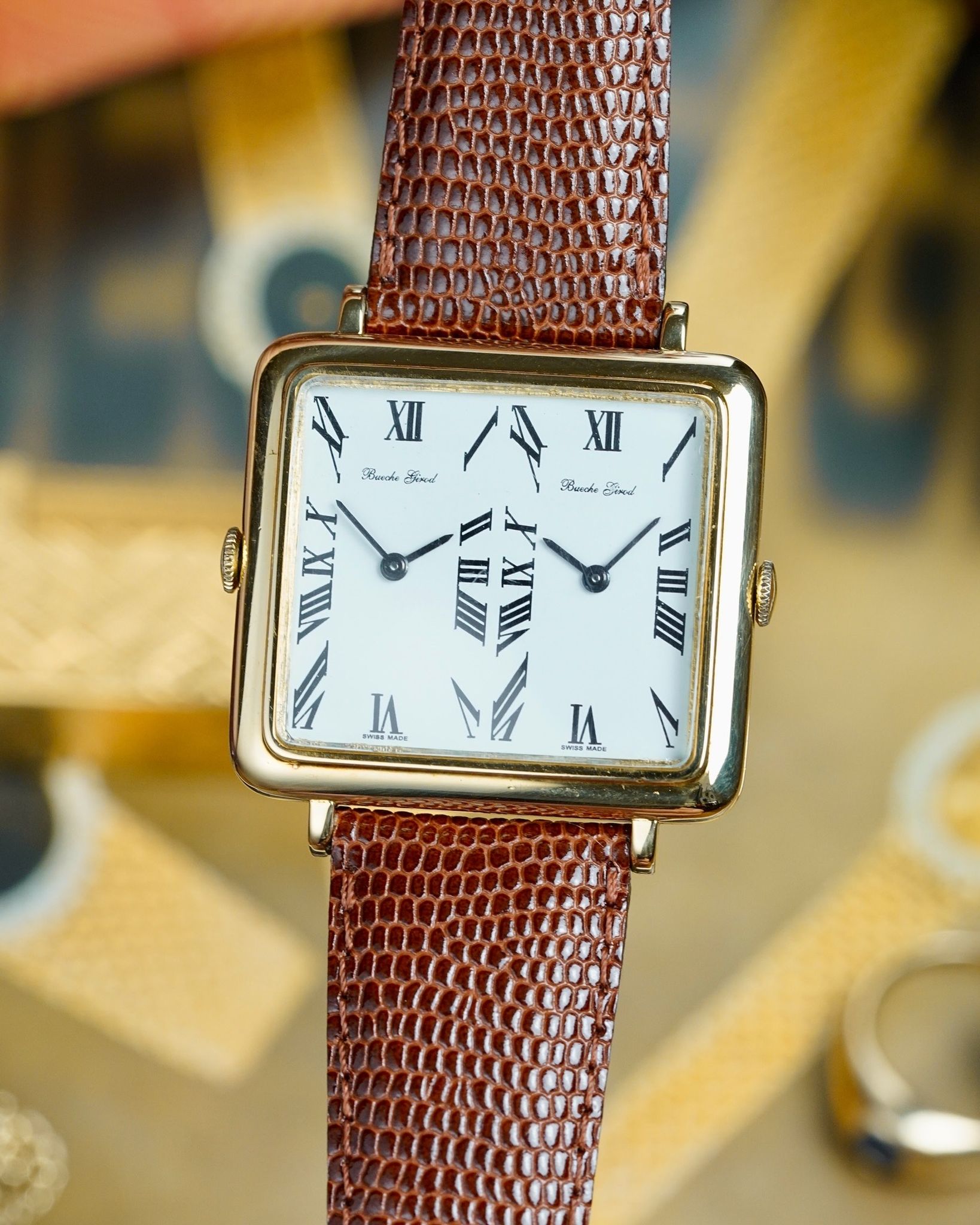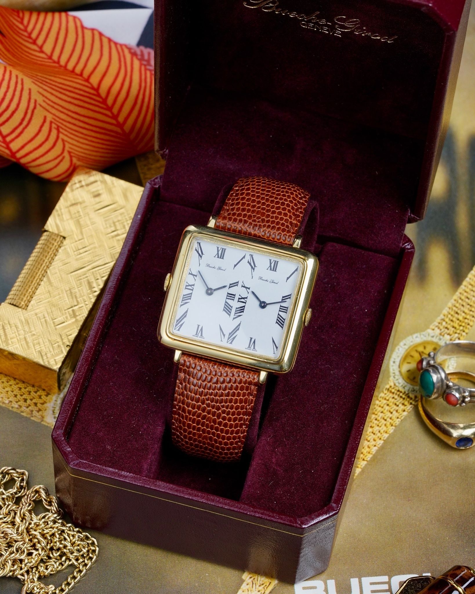A rare and absolutely insane Bueche Girod Duel Time in 18K yellow gold with two individual movements inside an impressive 37x31mm case with its period correct box and original AW signed buckle.