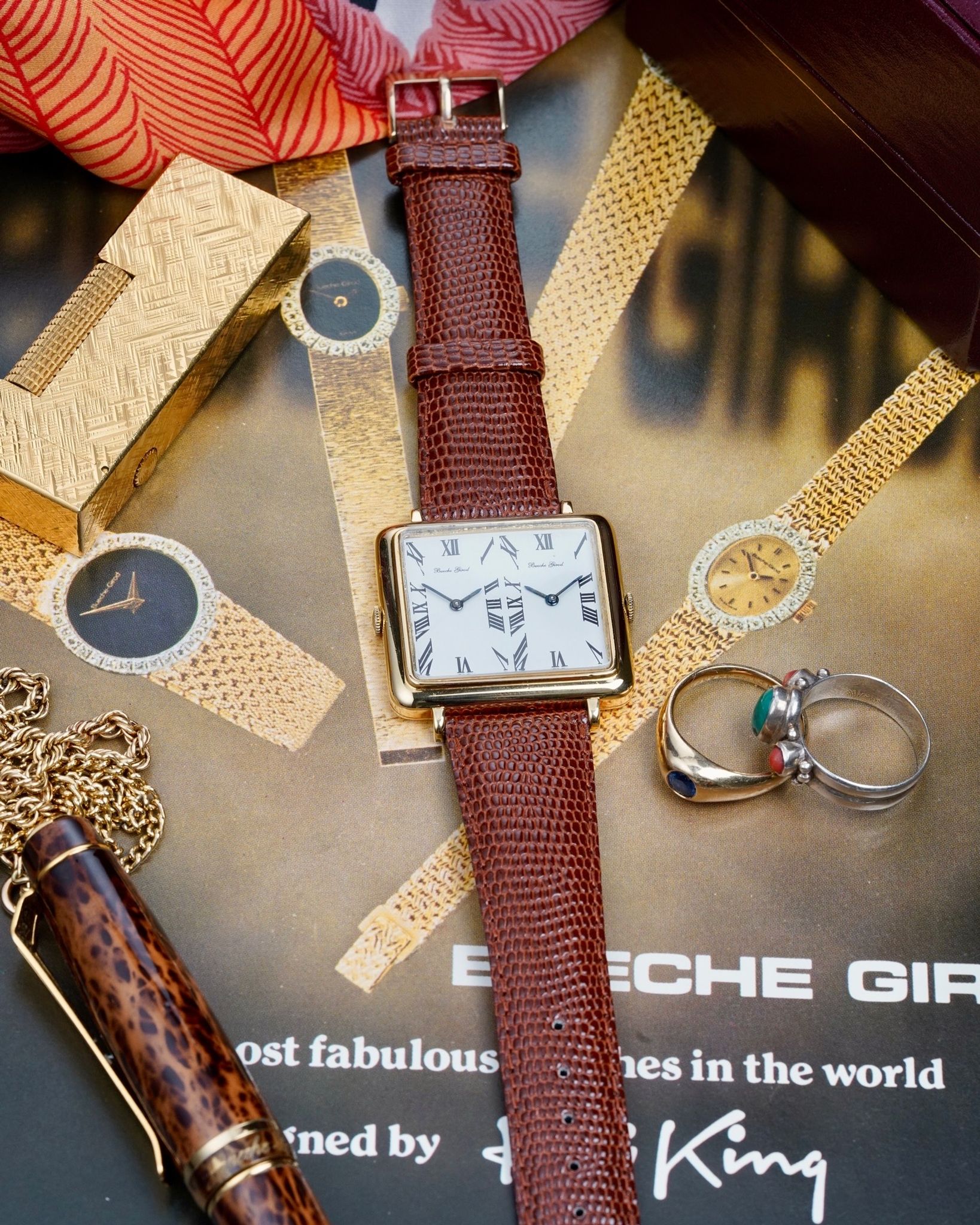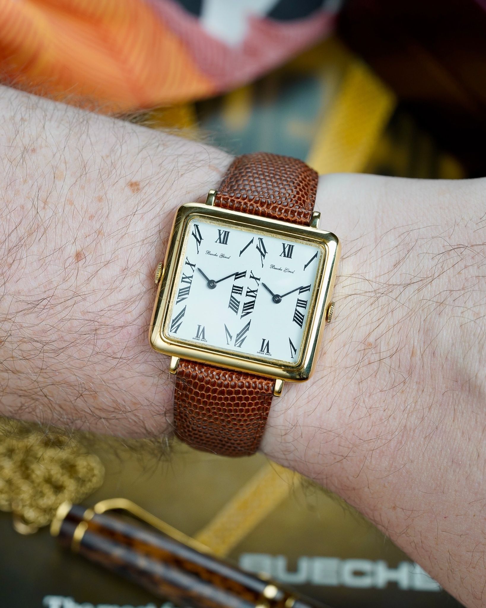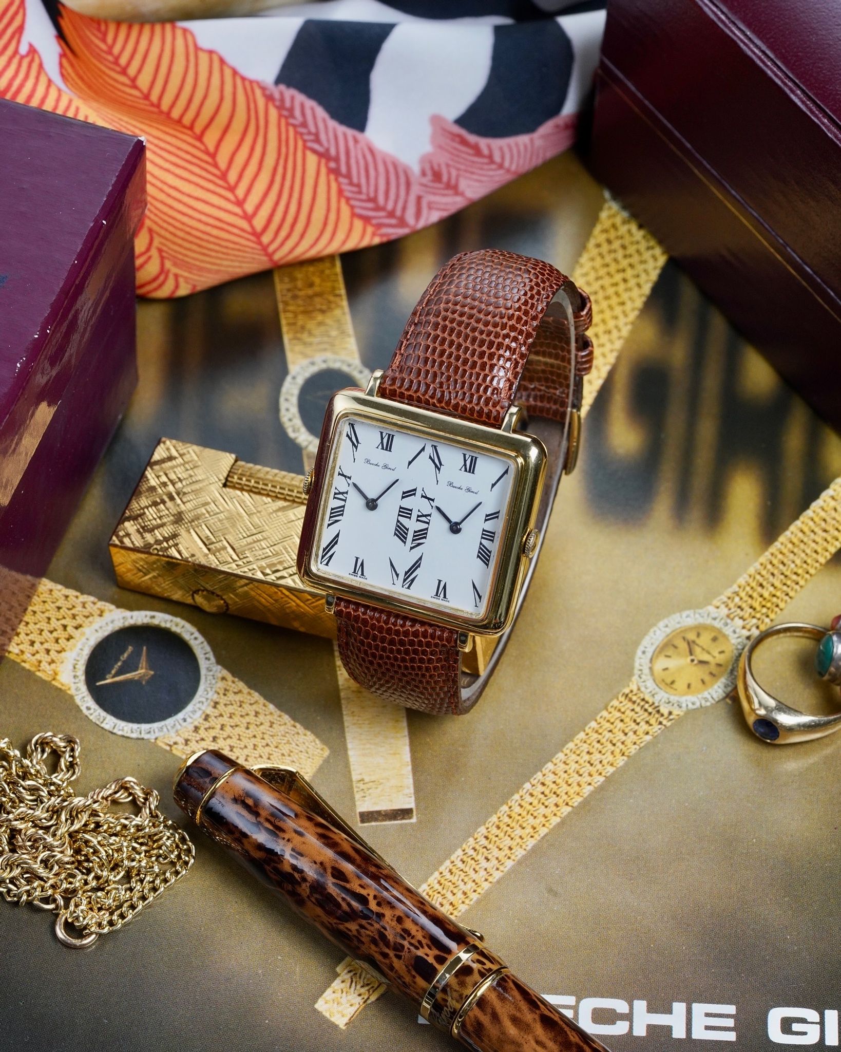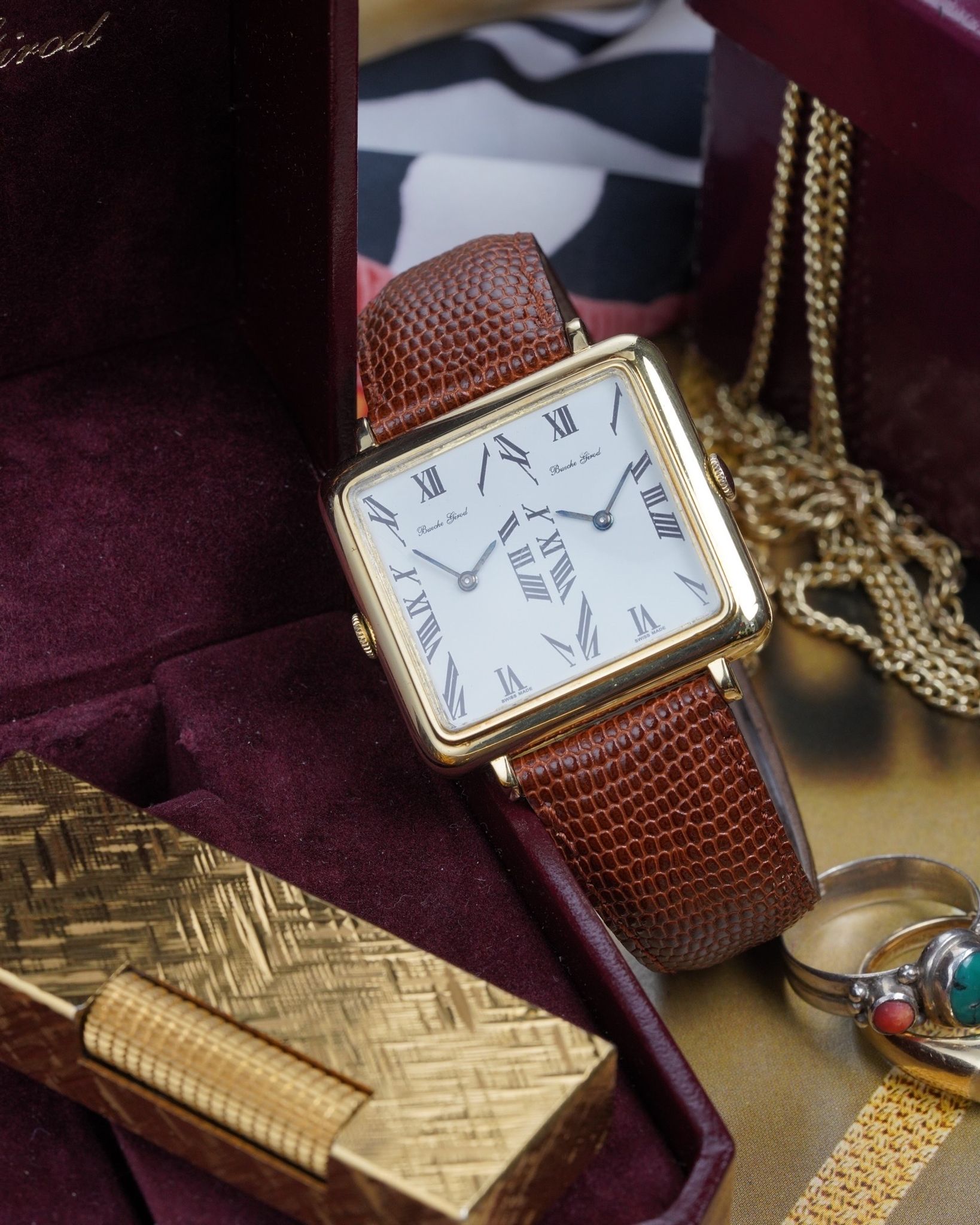 A rare and absolutely insane Bueche Girod Duel Time in 18K yellow gold with two individual movements inside an impressive 37x31mm case with its period correct box and original AW signed buckle.