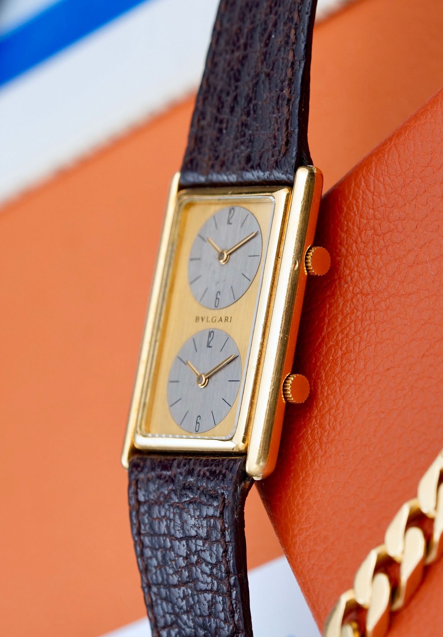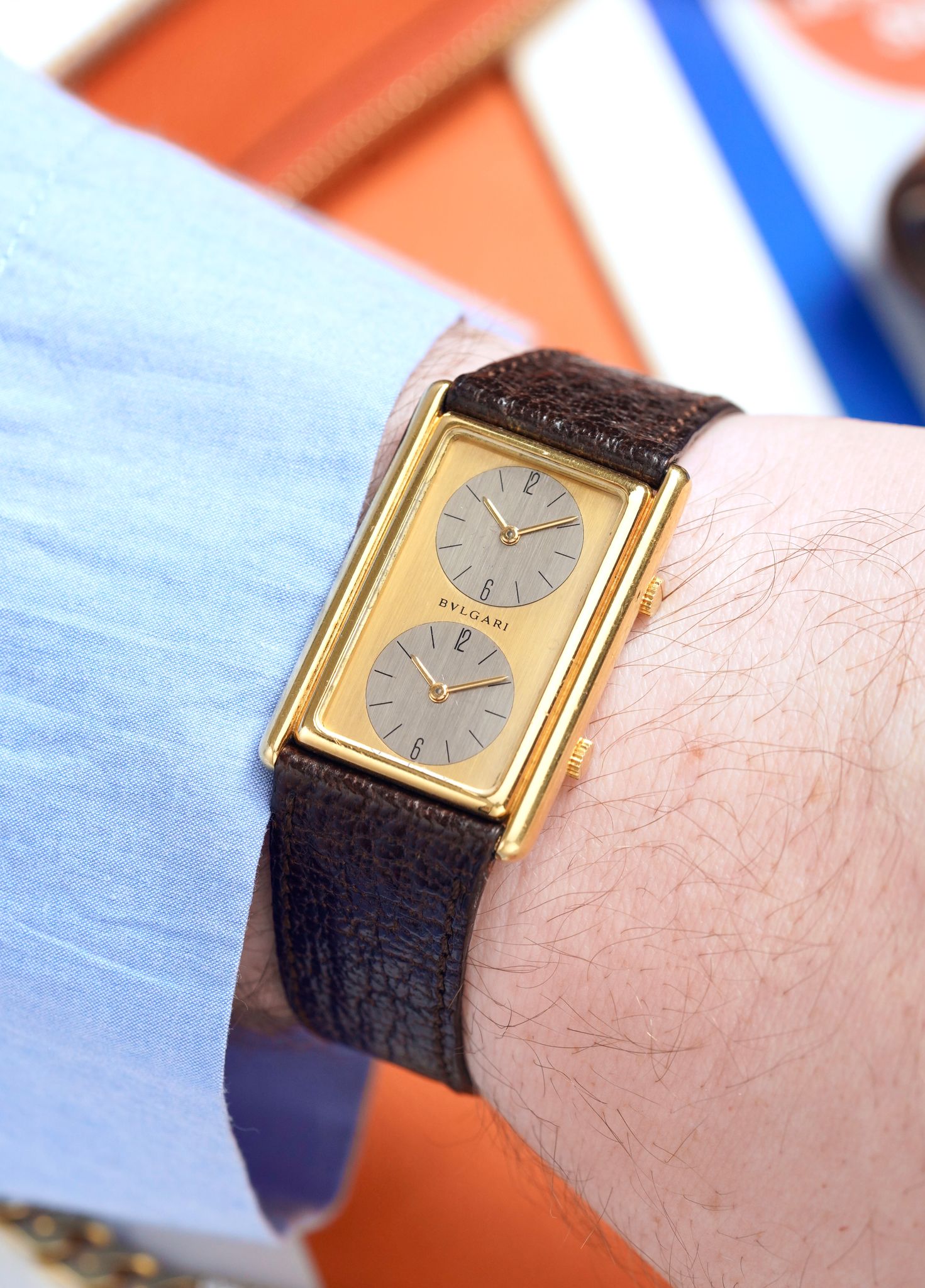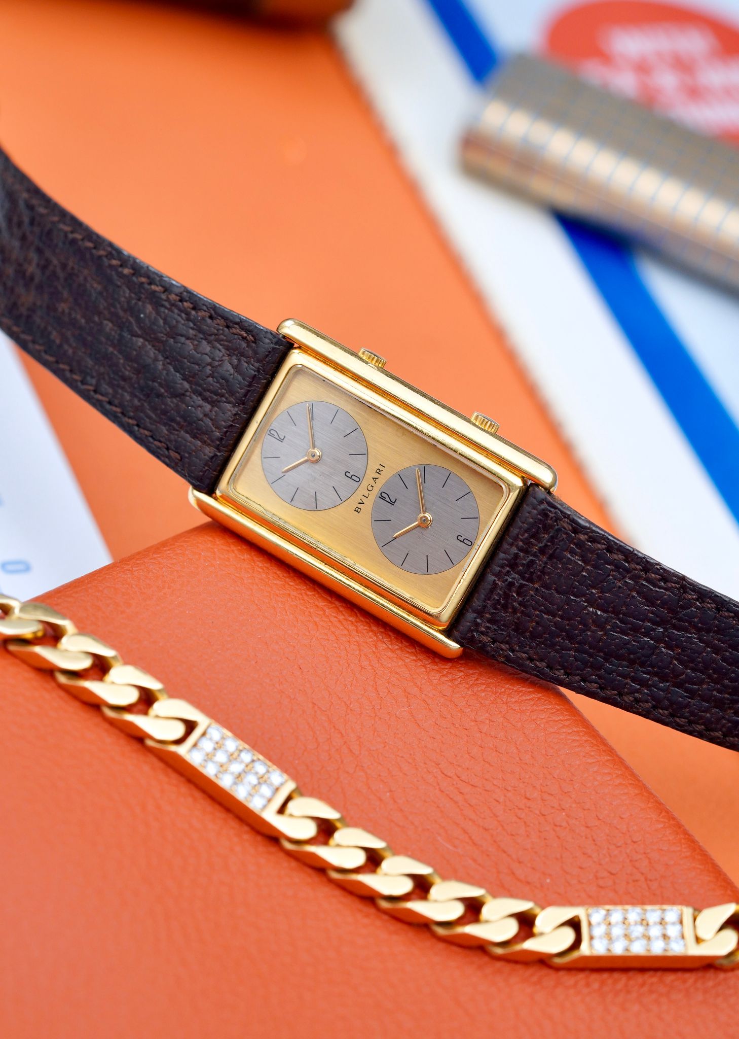 A breathtaking and uber rare statement from the Italian house of BVLGARI and mind of the famous Gerald Genta, this a 1970s Gemini Dual Time in a heavy solid 18K yellow gold 37mm x 25mm case leveraging two independent manually wound Genta signed Ebel calibers, correct Genta and "B" signed 18K