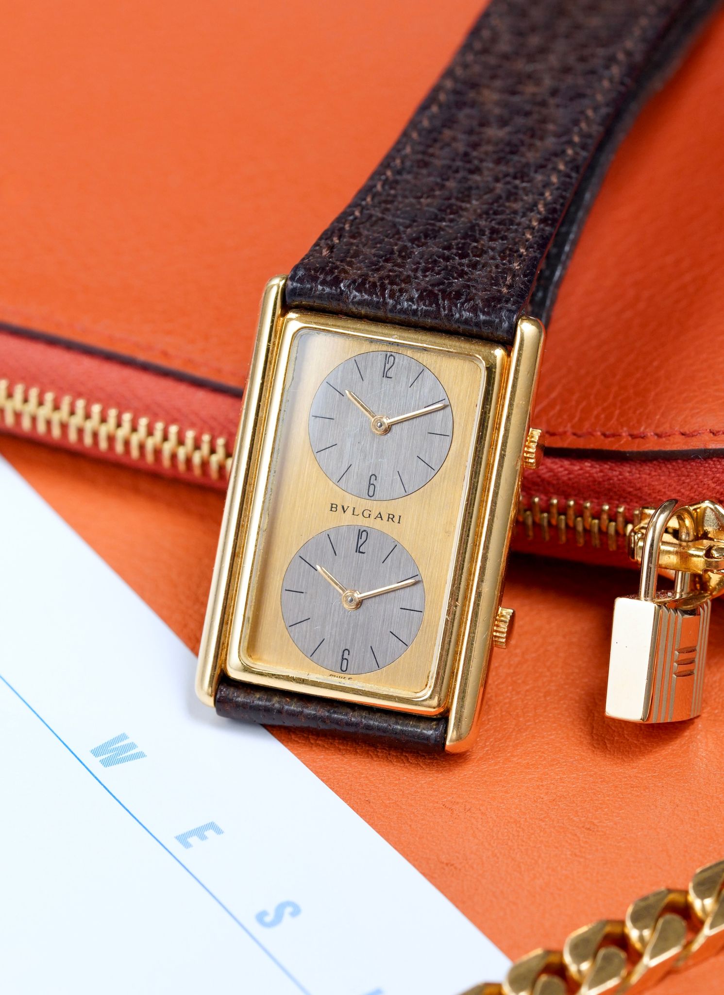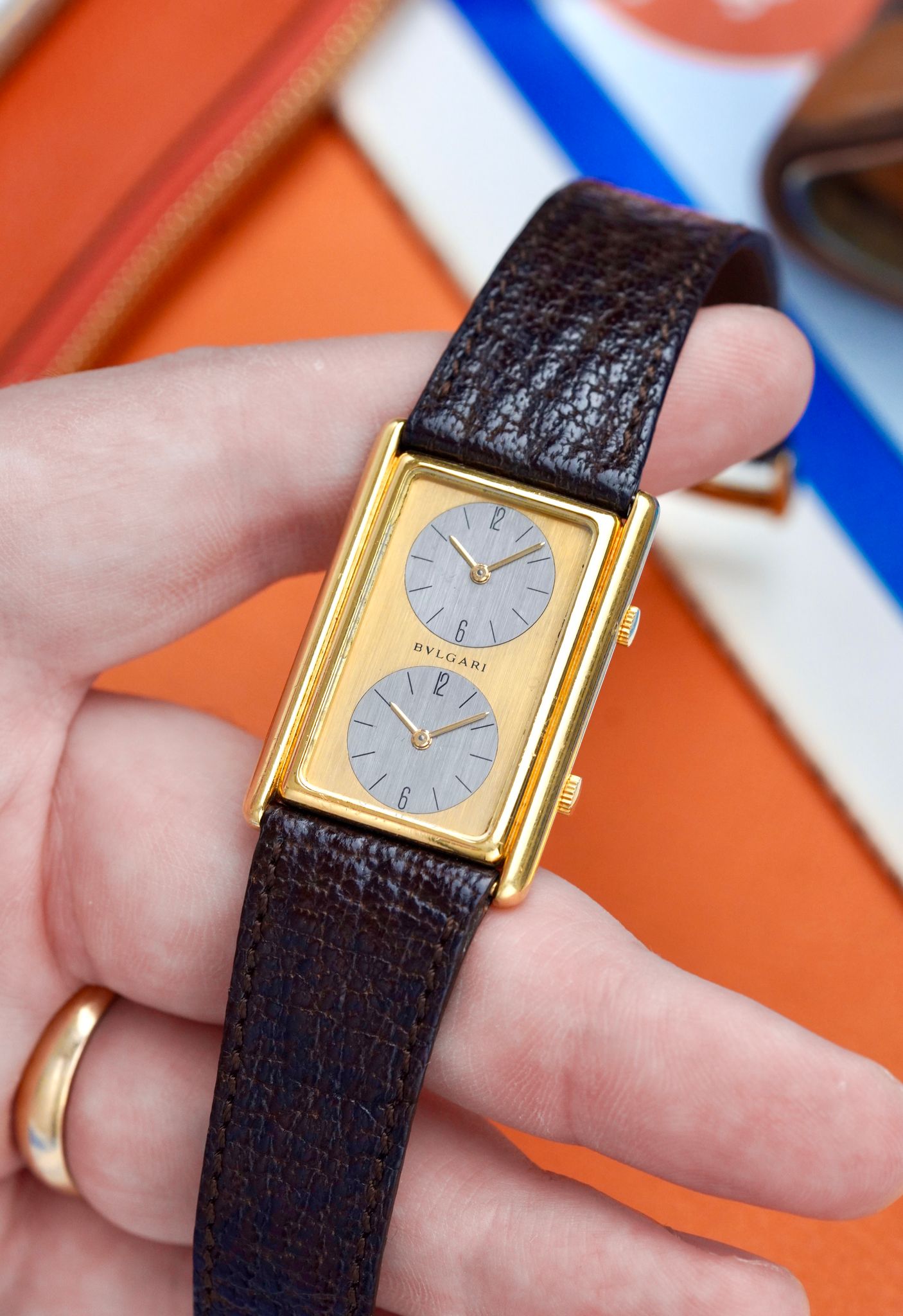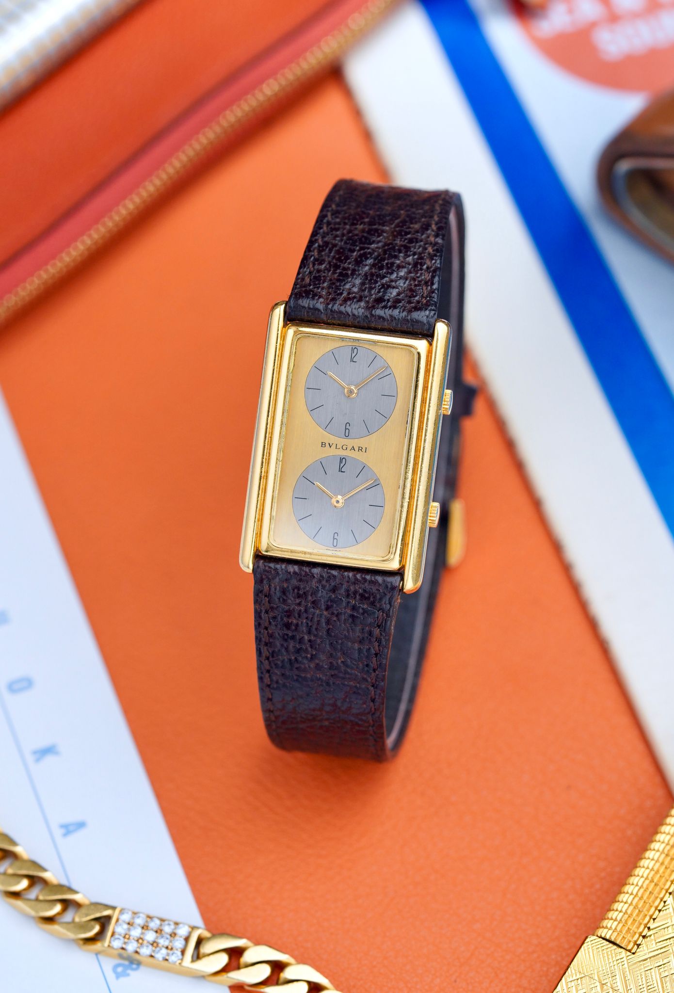 A breathtaking and uber rare statement from the Italian house of BVLGARI and mind of the famous Gerald Genta, this a 1970s Gemini Dual Time in a heavy solid 18K yellow gold 37mm x 25mm case leveraging two independent manually wound Genta signed Ebel calibers, correct Genta and "B" signed 18K