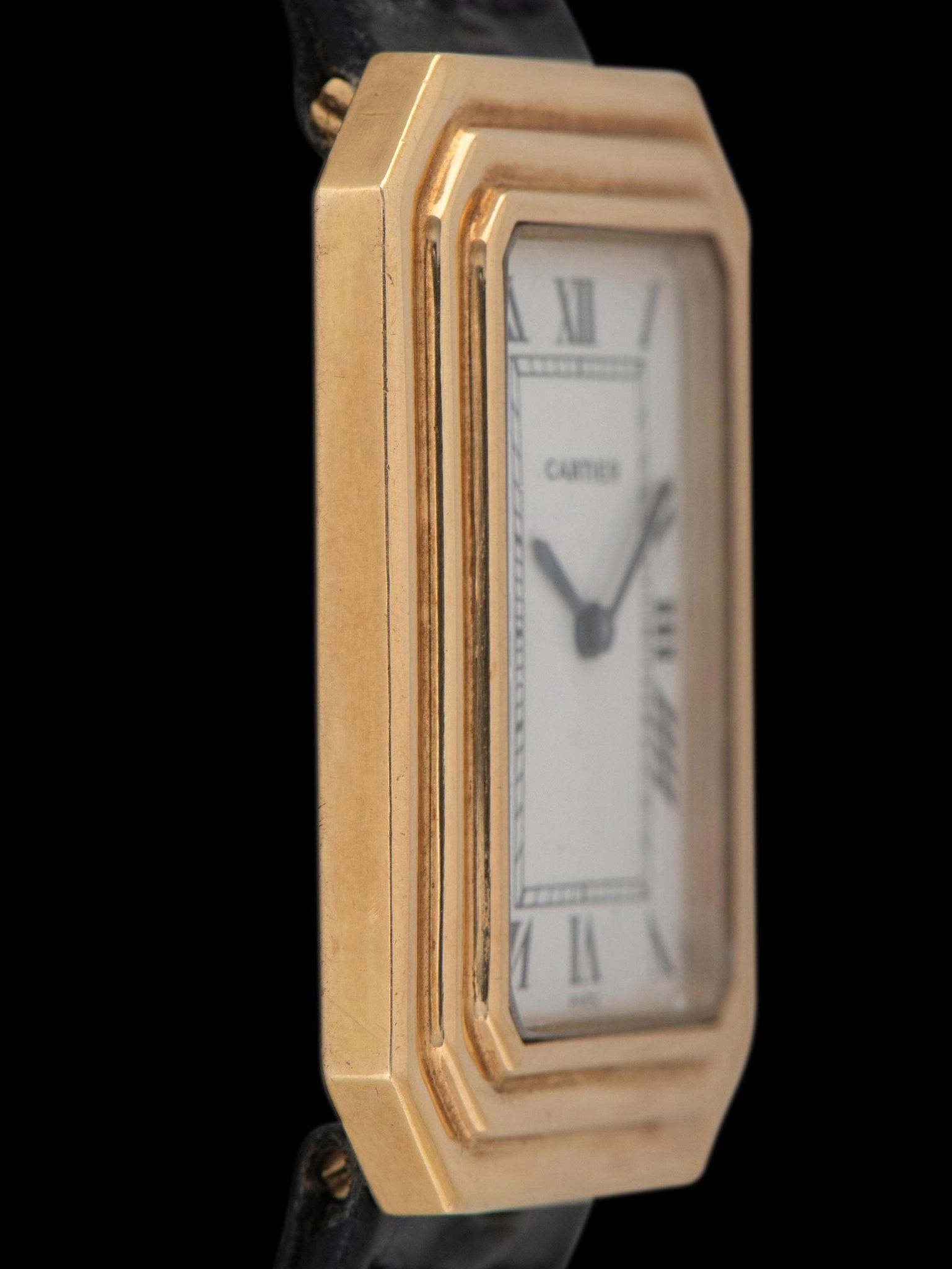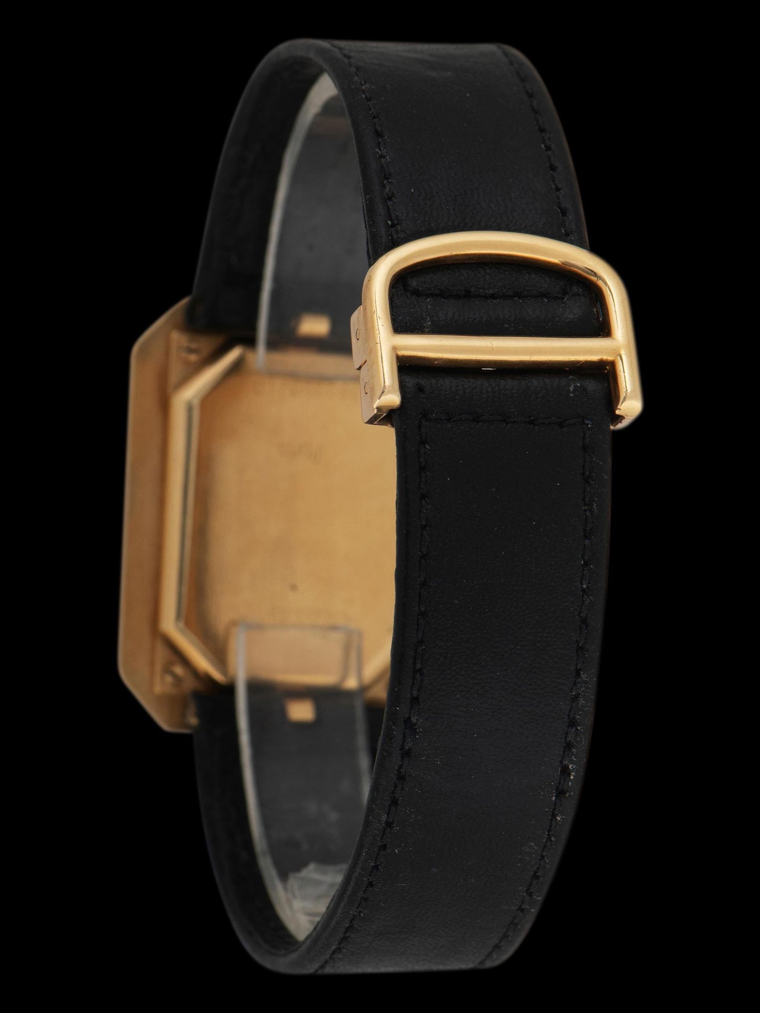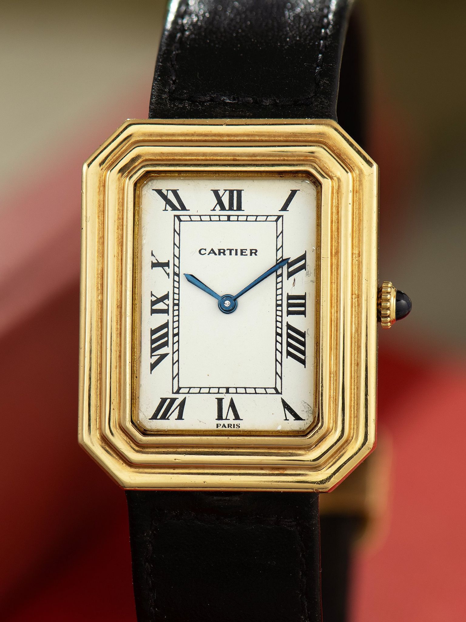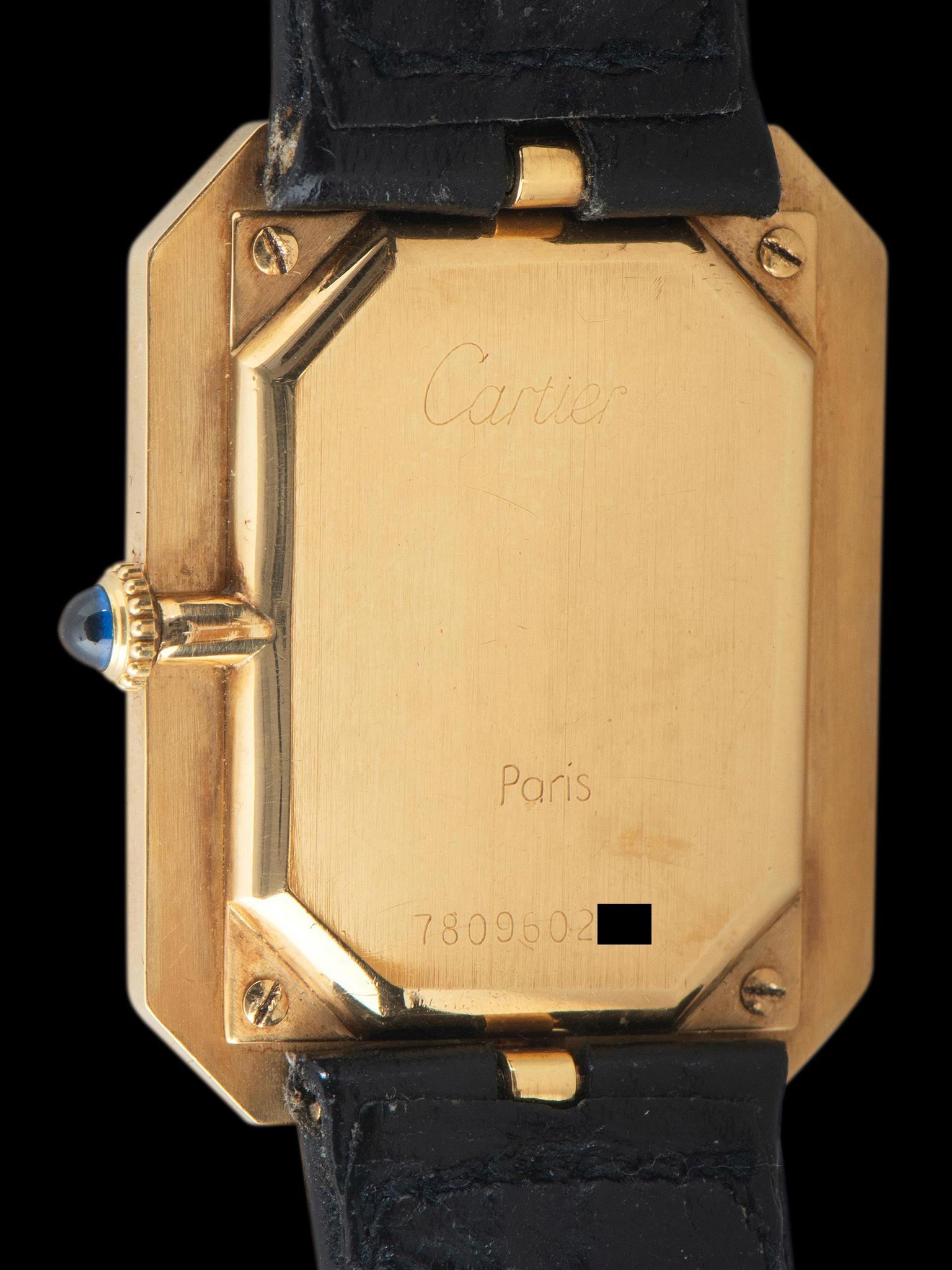 The large rectangular 18K yellow gold three-tier stepped case features hidden lugs underneath the case and remains in well-preserved condition, showing honest signs of gentle use and evidence of only being lightly polished in the past. The watch retains its original blue sapphire cabochon crown. The case back retains all of its factory engravings in fully present and legible condition. The watch comes supplied on a 2-piece black leather strap with an 18K yellow gold Cartier deployant buckle.