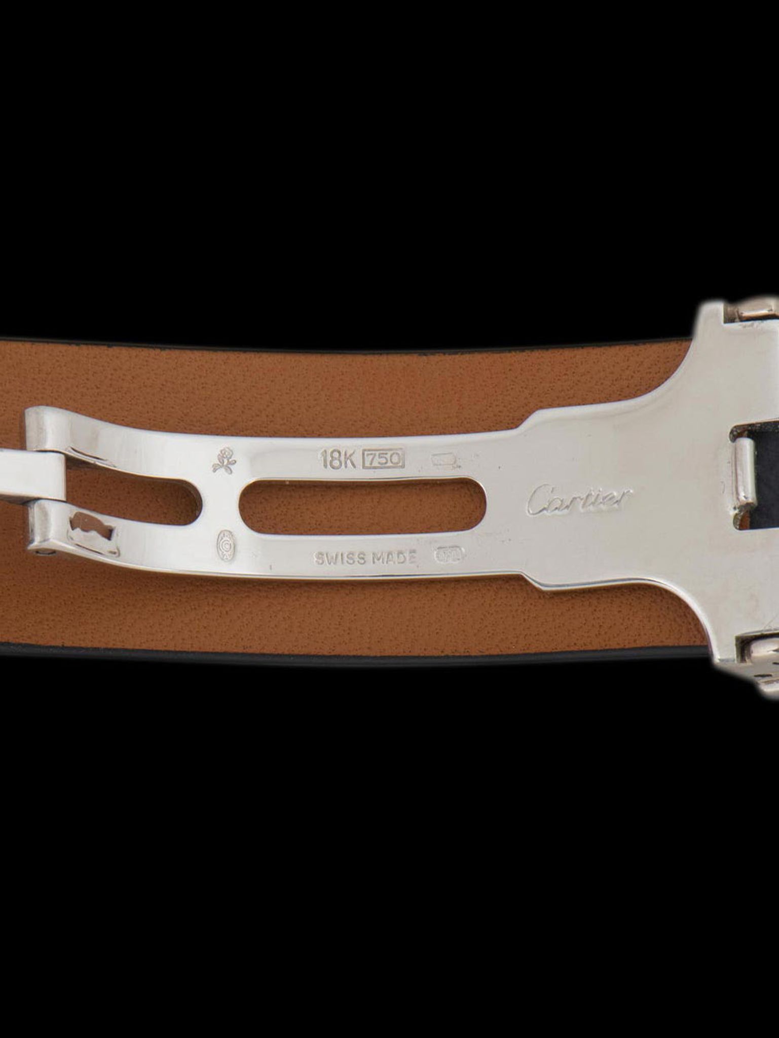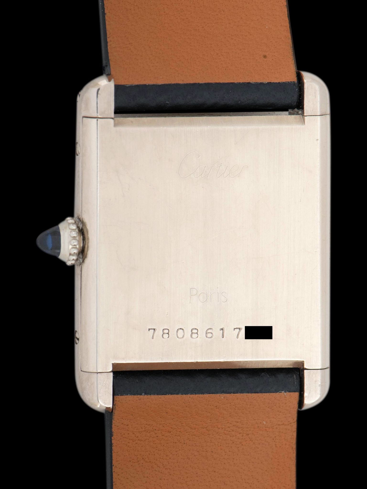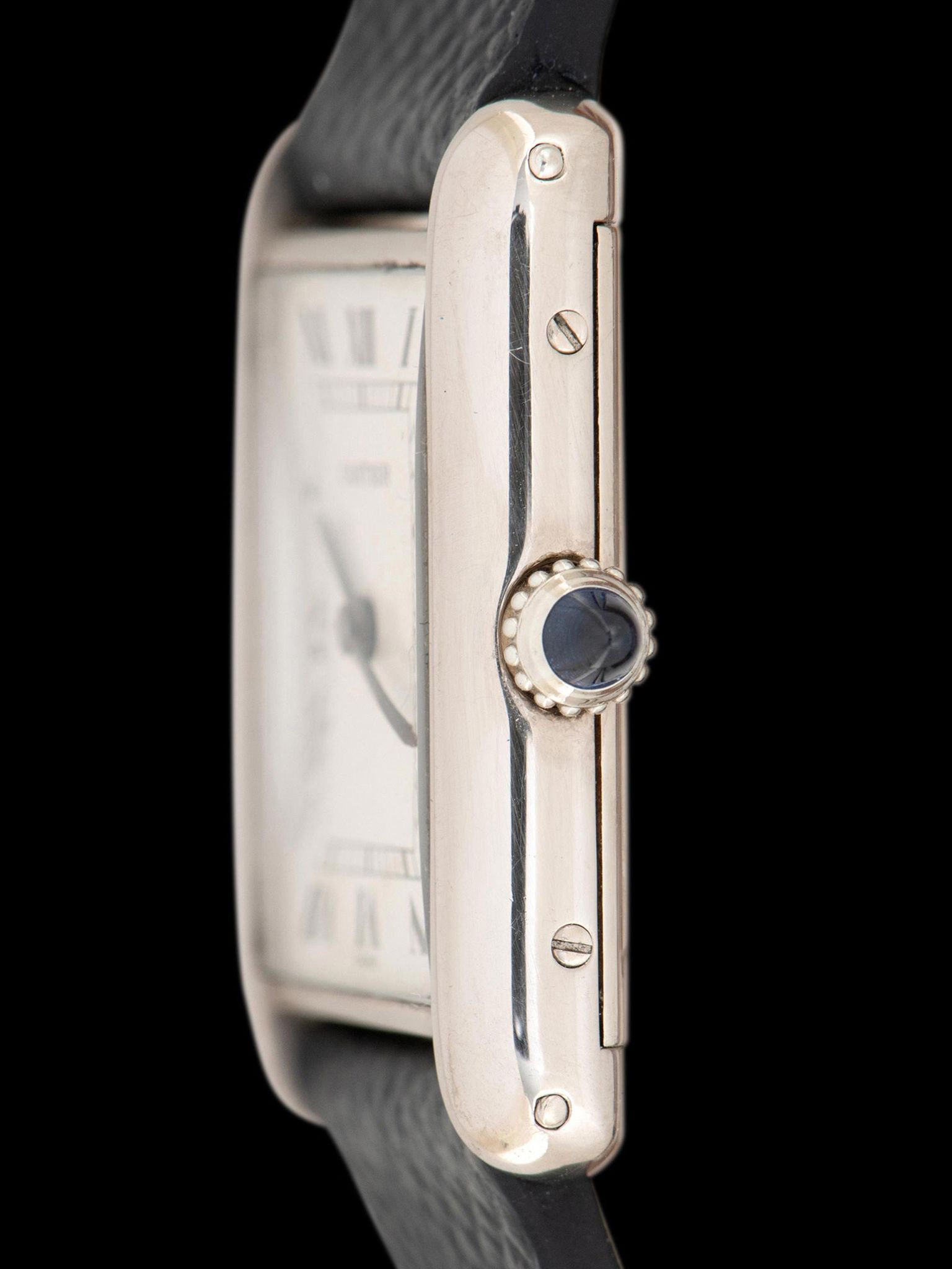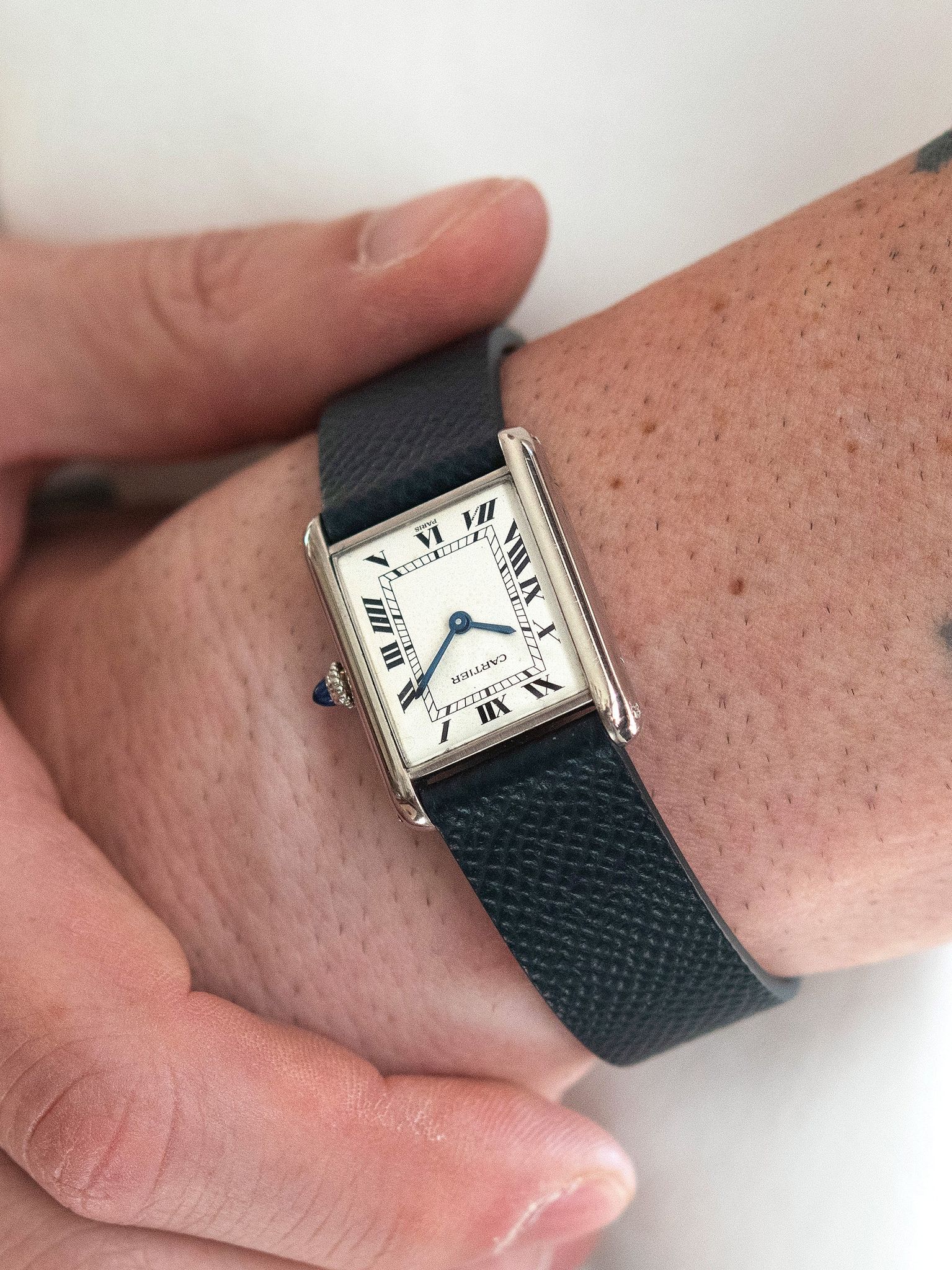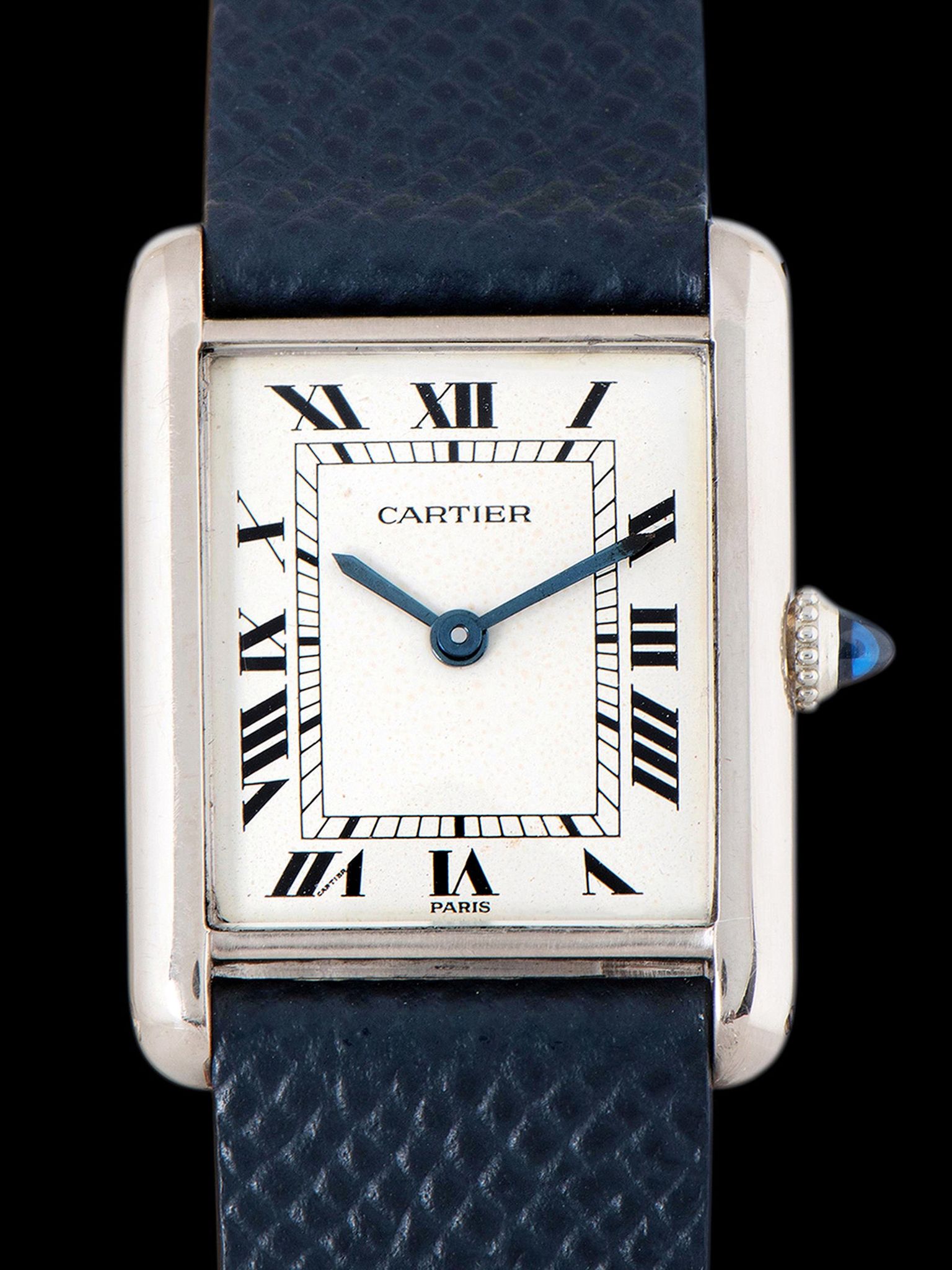 The iconic square case cast in 18K white gold is in excellent condition, featuring all of its original hallmarks and factory markings, with gentle signs of use and minimal evidence of prior polishing present. The watch retains its original blue sapphire cabochon crown. The watch comes supplied on a custom blue saffiano leather strap with a later Cartier 18K white gold deployant clasp, the strap is sized to fit a 7-inch wrist.