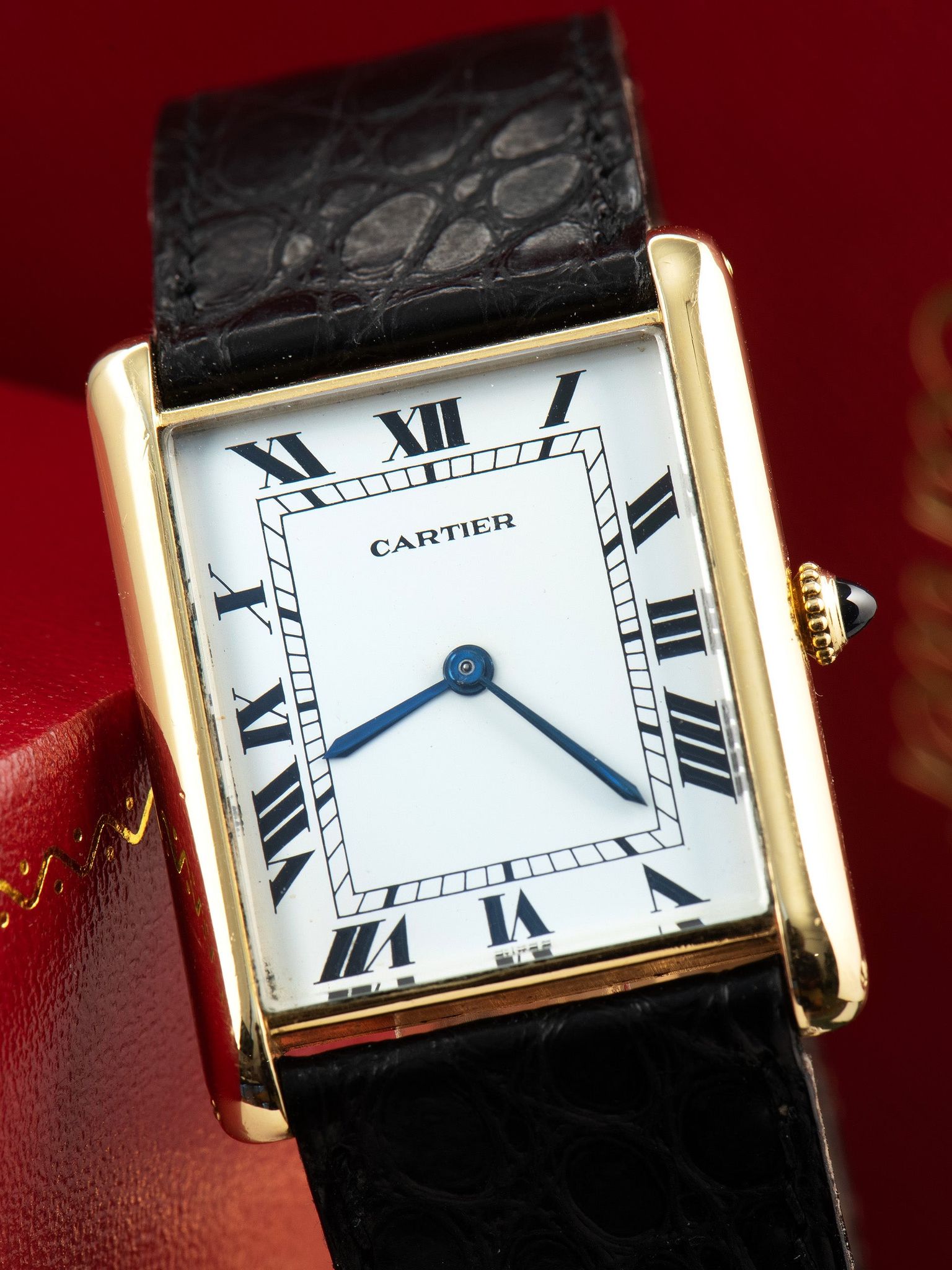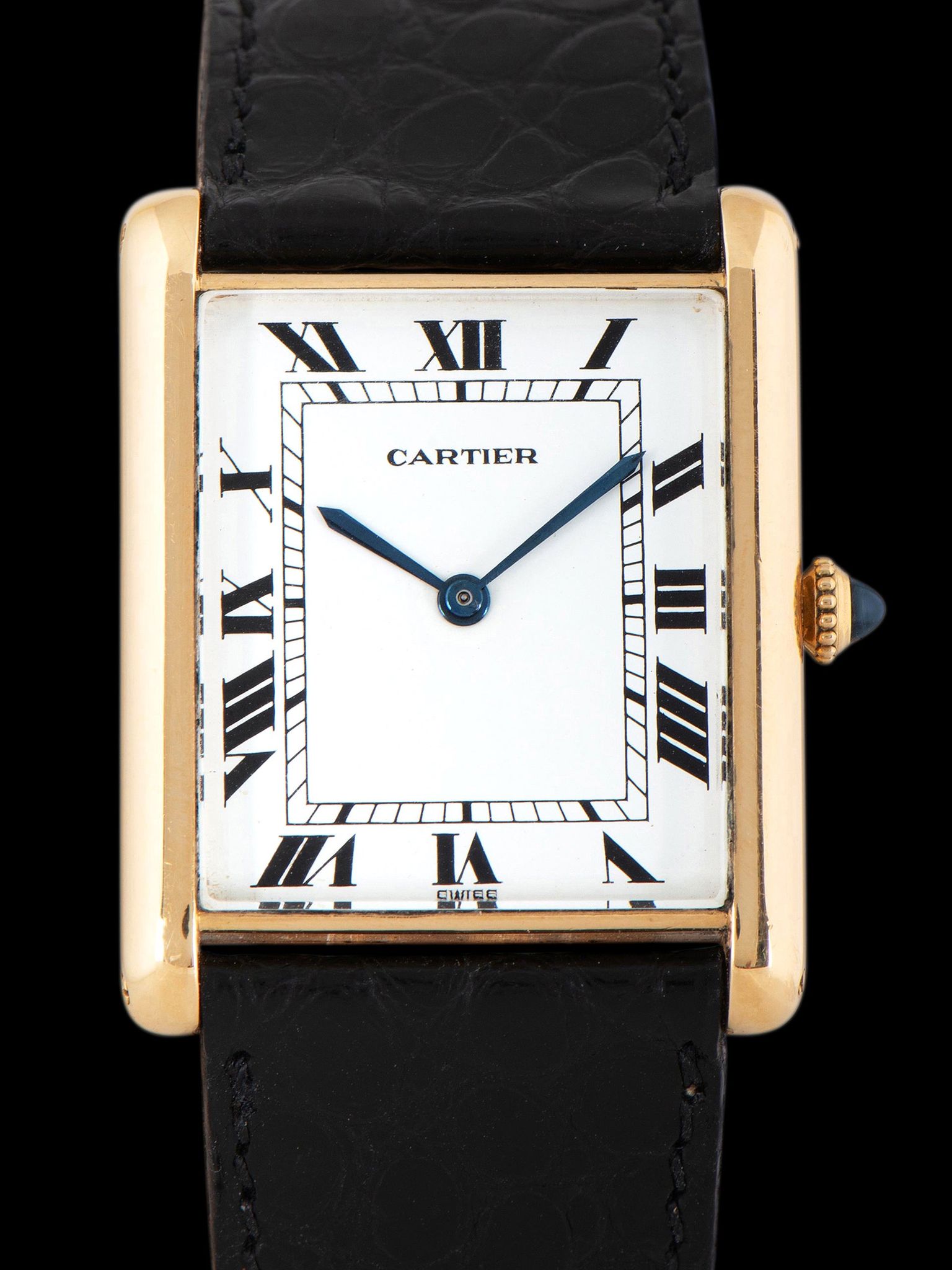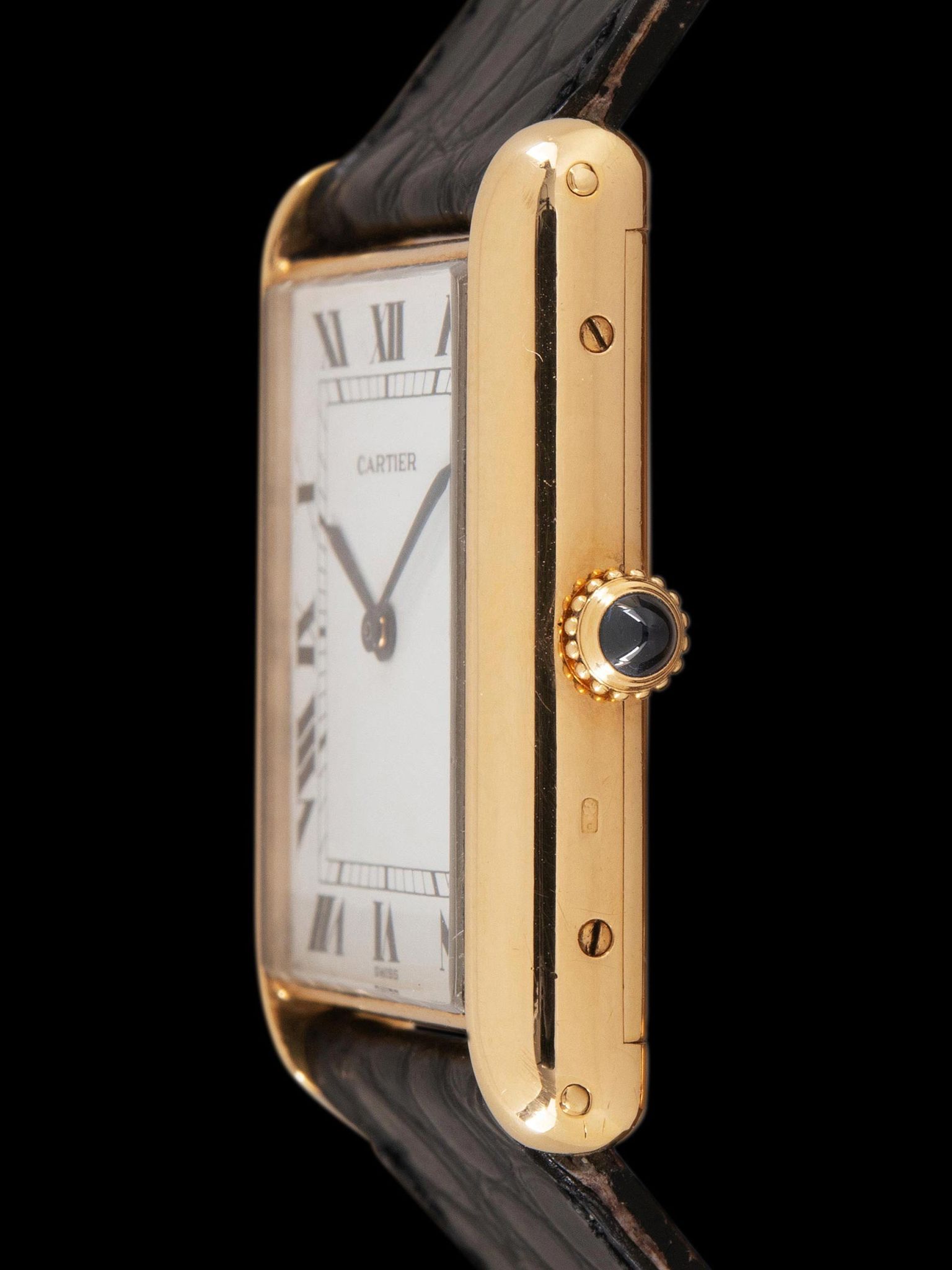 The excellent and elegant 18K yellow gold "Jumbo XL" Tank case retains strong dimensions with the original hallmarks present. The crystal is a flat glass replacement which is common to see in early Carter Tanks. The case retains its original and classic blue sapphire cabochon crown. The back of the case exhibits light signs of previous polishing and showcases the "movement bubble" with the original factory markings and engravings remaining intact. The watch comes supplied on a 2pc Cartier black crocodile leather strap that will fit a 7-inch wrist and comes with the original 18K gold Cartier deployant buckle.