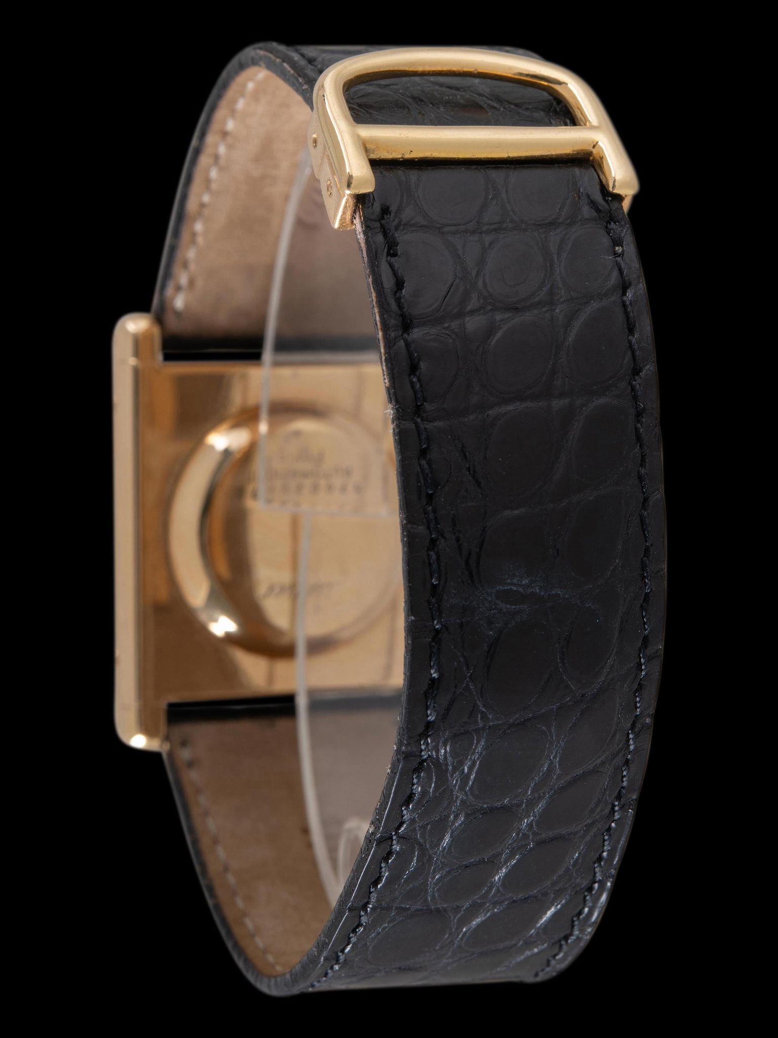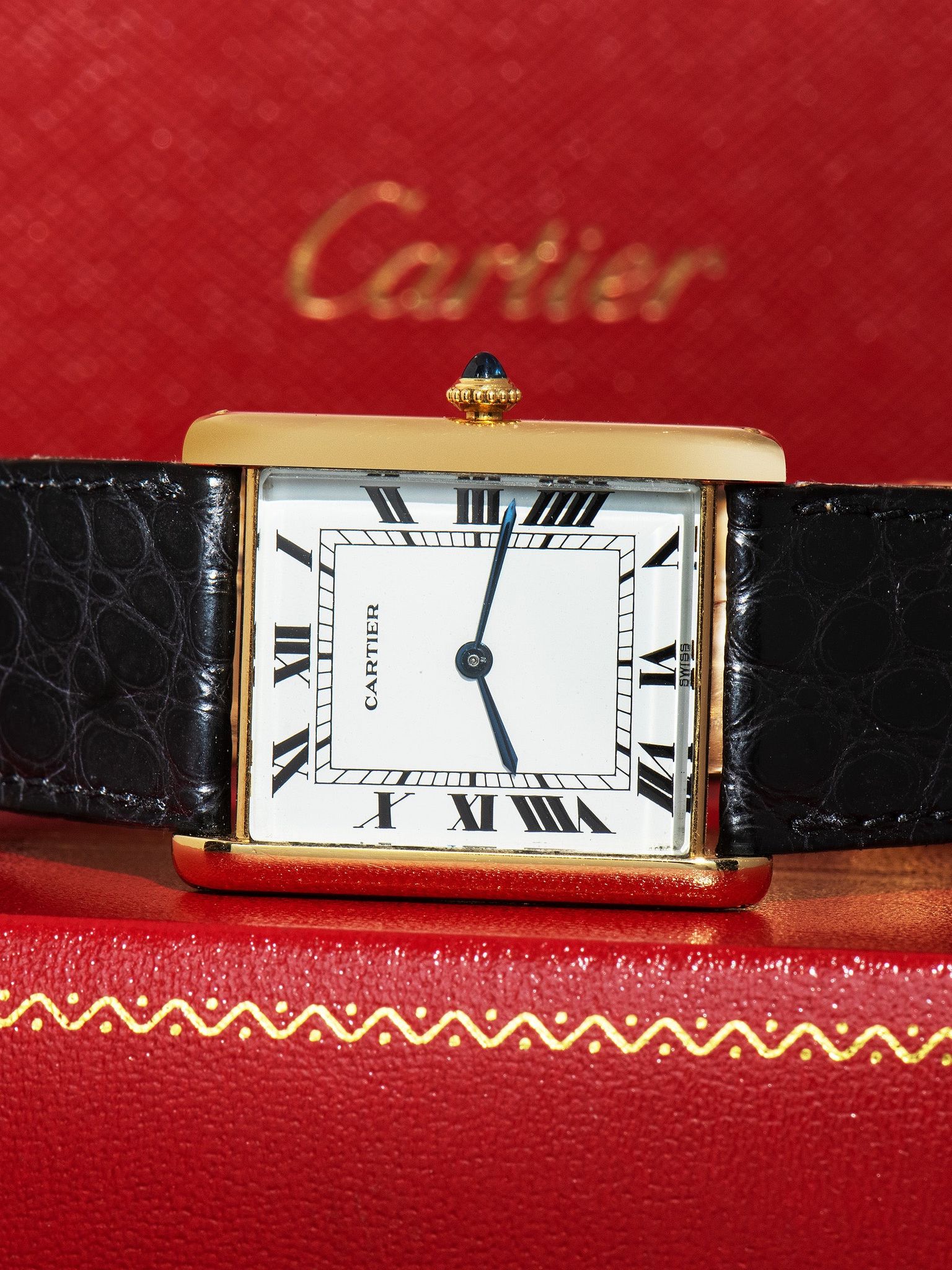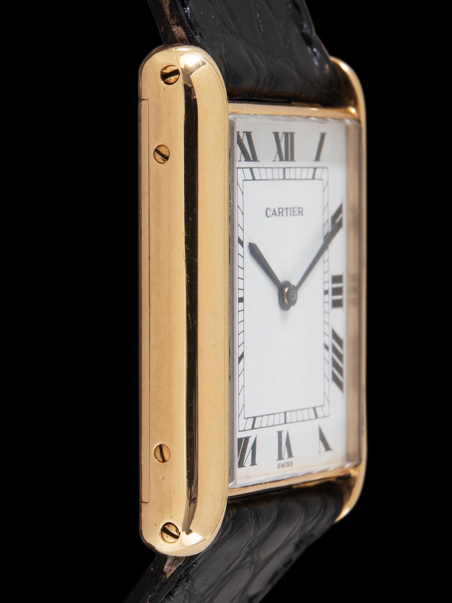 The excellent and elegant 18K yellow gold "Jumbo XL" Tank case retains strong dimensions with the original hallmarks present. The crystal is a flat glass replacement which is common to see in early Carter Tanks. The case retains its original and classic blue sapphire cabochon crown. The back of the case exhibits light signs of previous polishing and showcases the "movement bubble" with the original factory markings and engravings remaining intact. The watch comes supplied on a 2pc Cartier black crocodile leather strap that will fit a 7-inch wrist and comes with the original 18K gold Cartier deployant buckle.