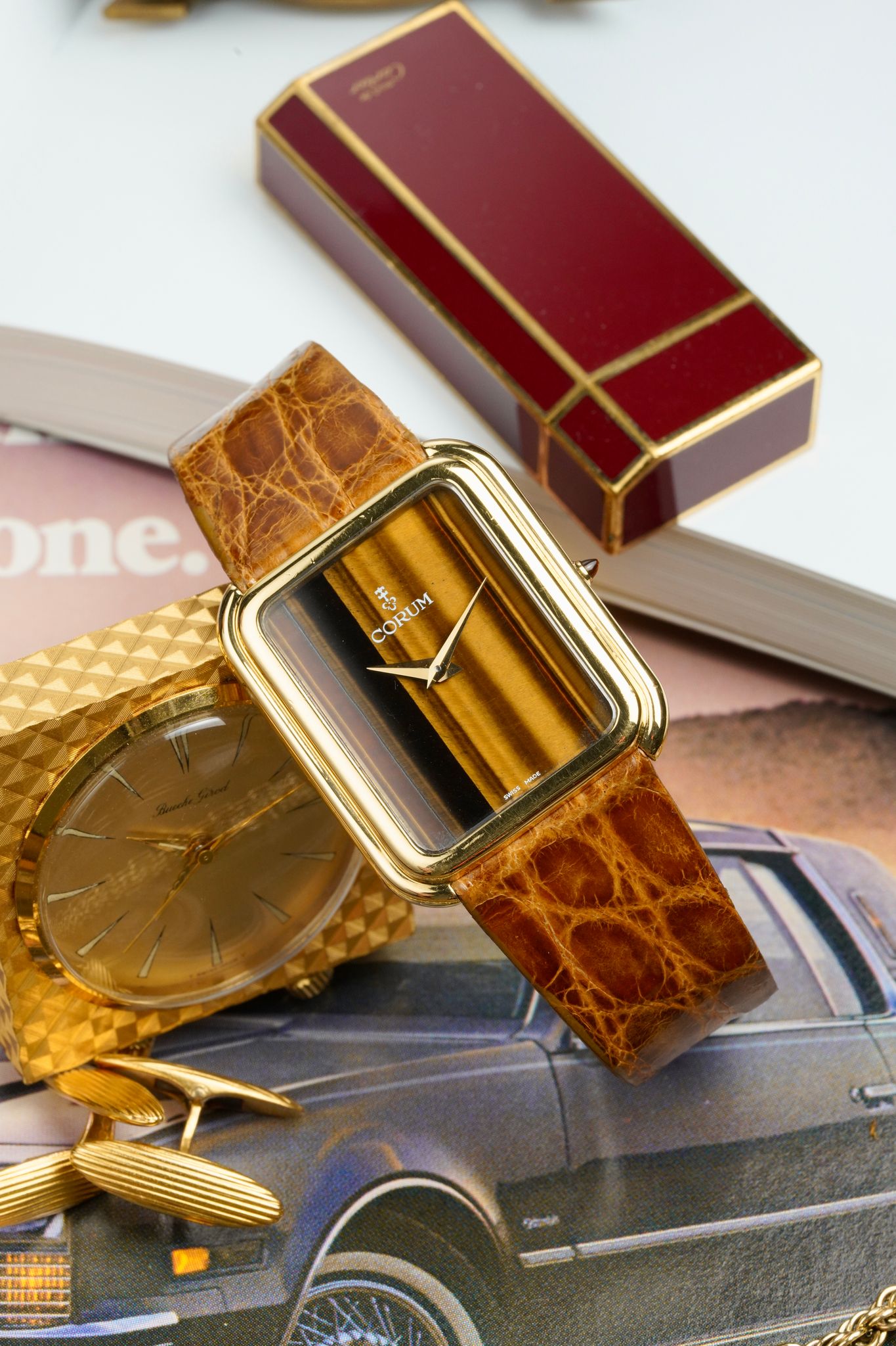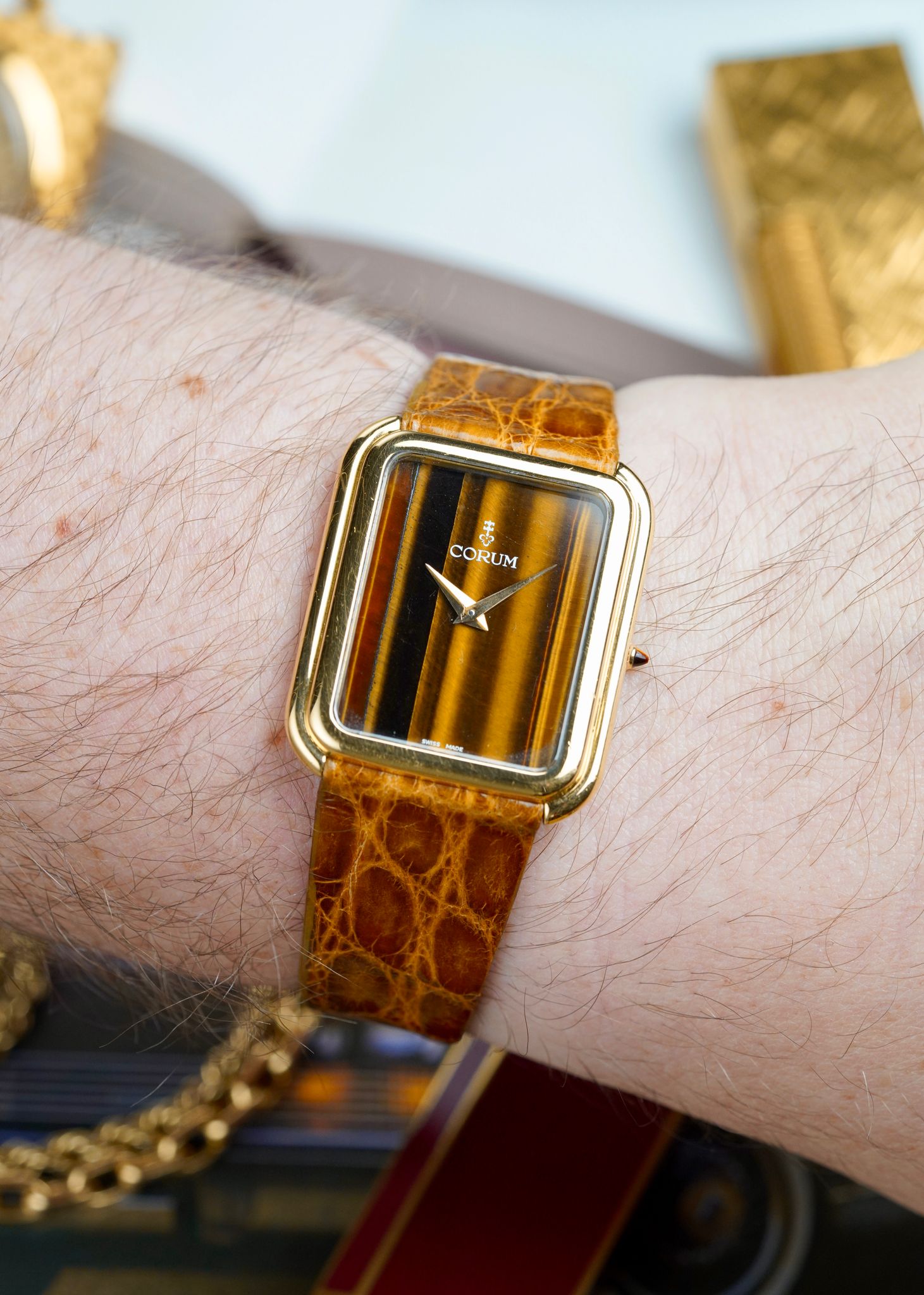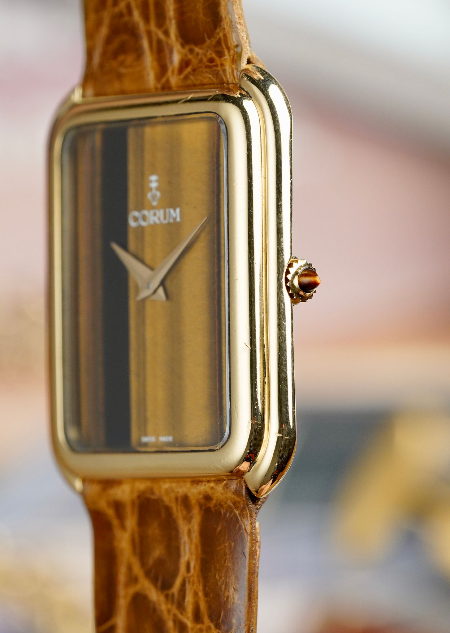 A wild 1970s Corum "Jumbo" tank with a double stepped 18K YG case and beautifully striking tiger eye stone dial, powered be a manual wind movement.
