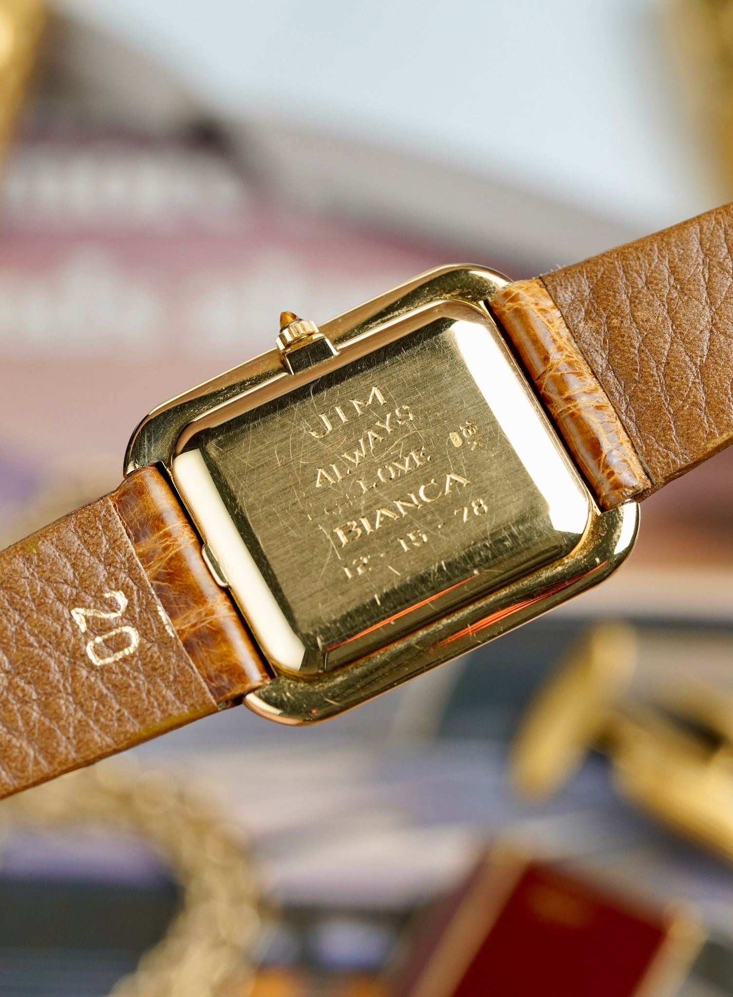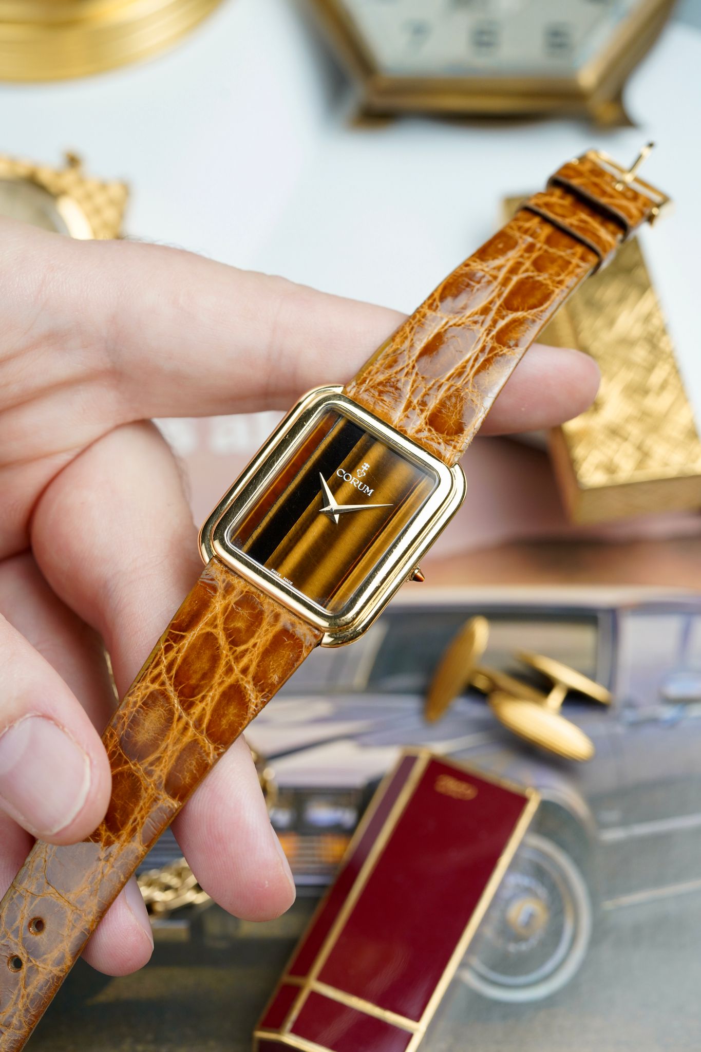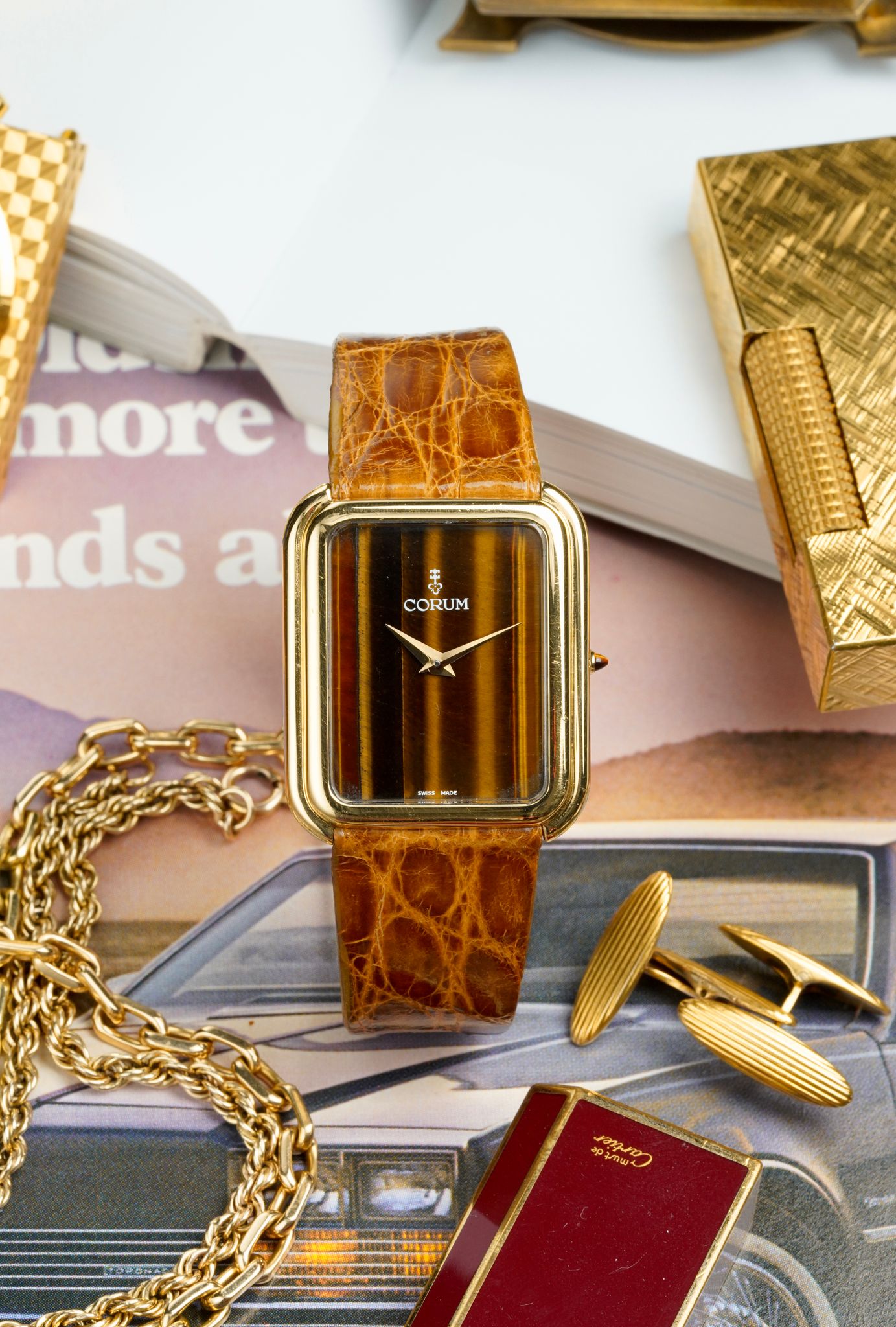 A wild 1970s Corum "Jumbo" tank with a double stepped 18K YG case and beautifully striking tiger eye stone dial, powered be a manual wind movement.