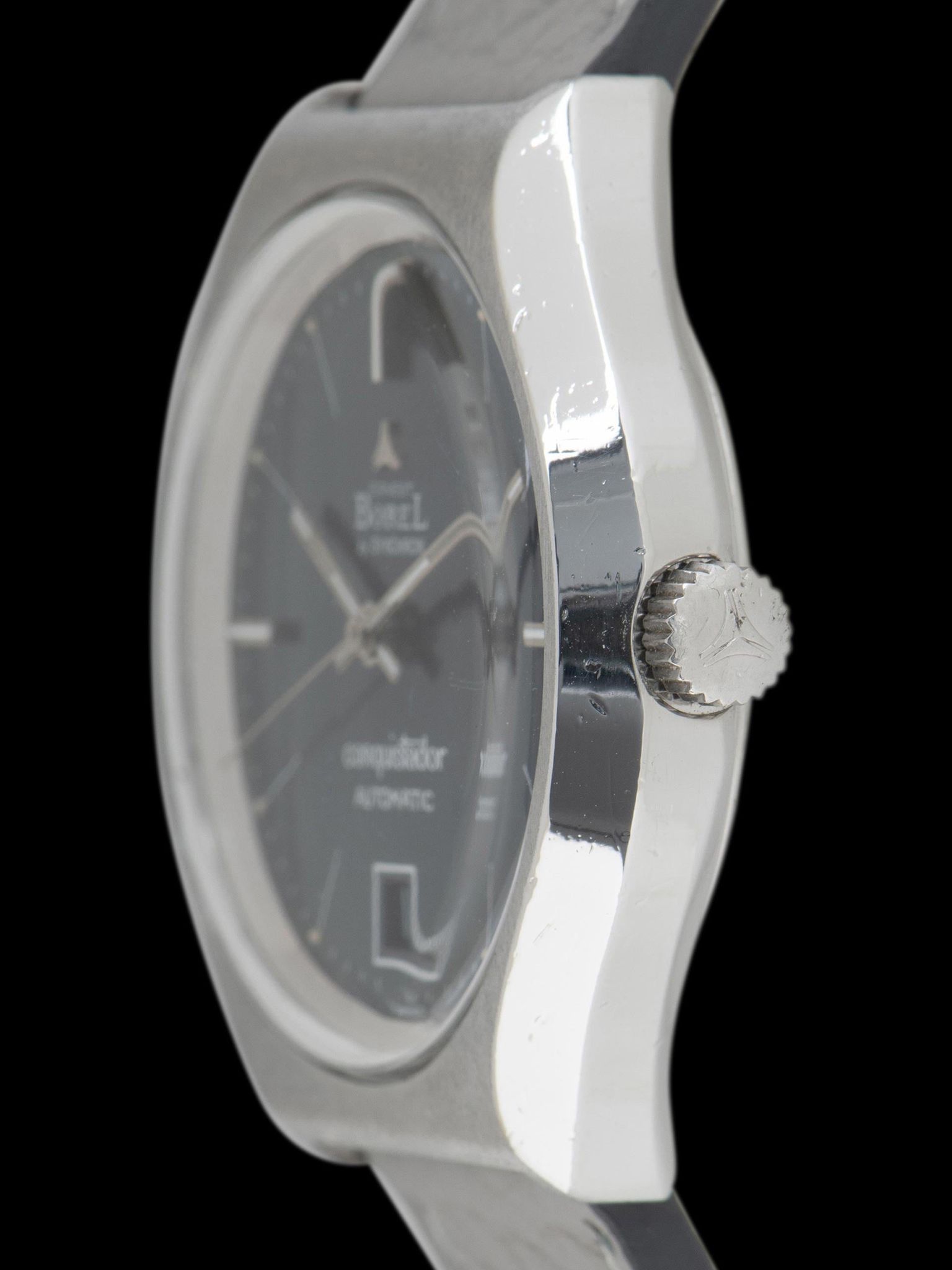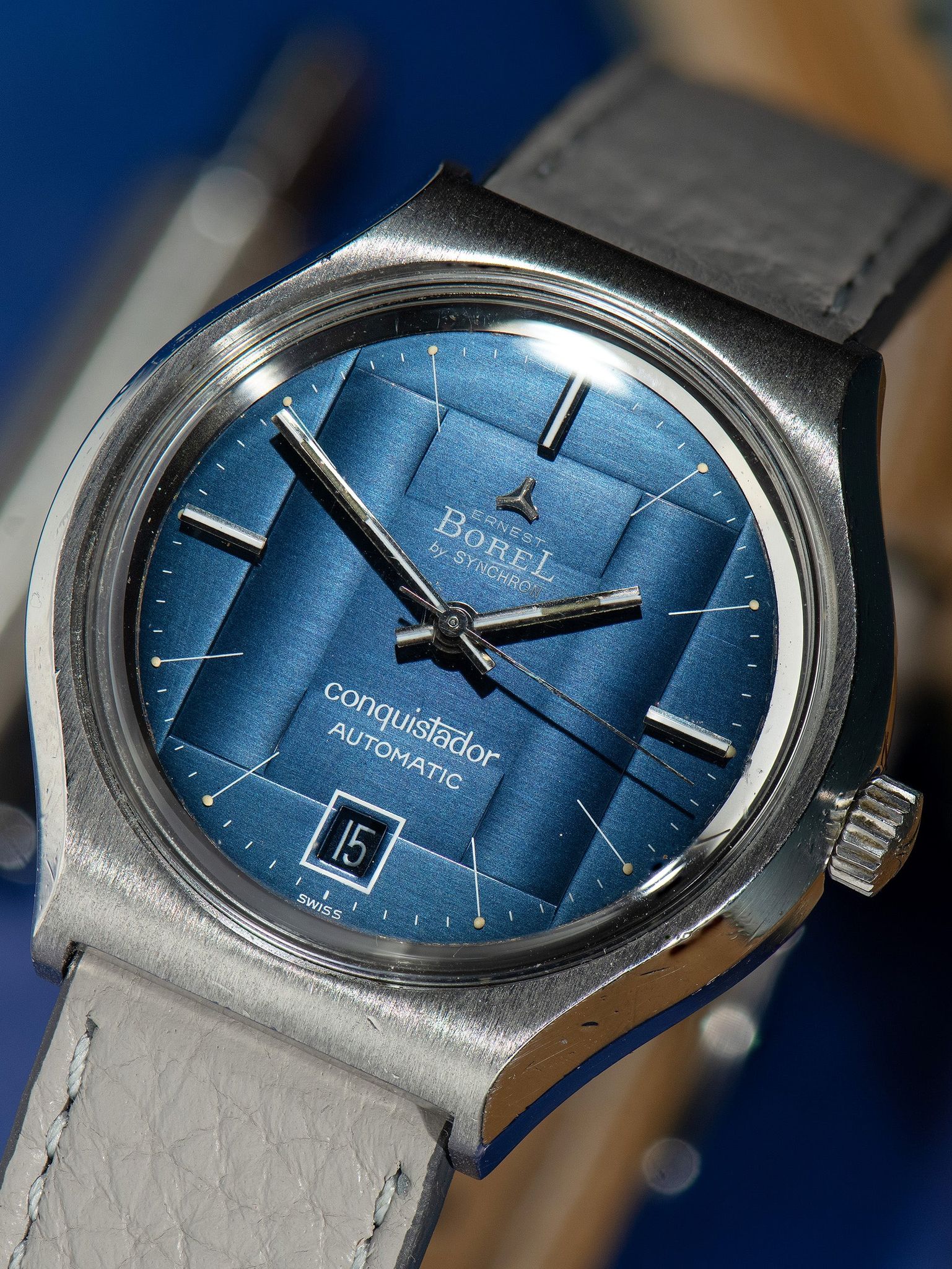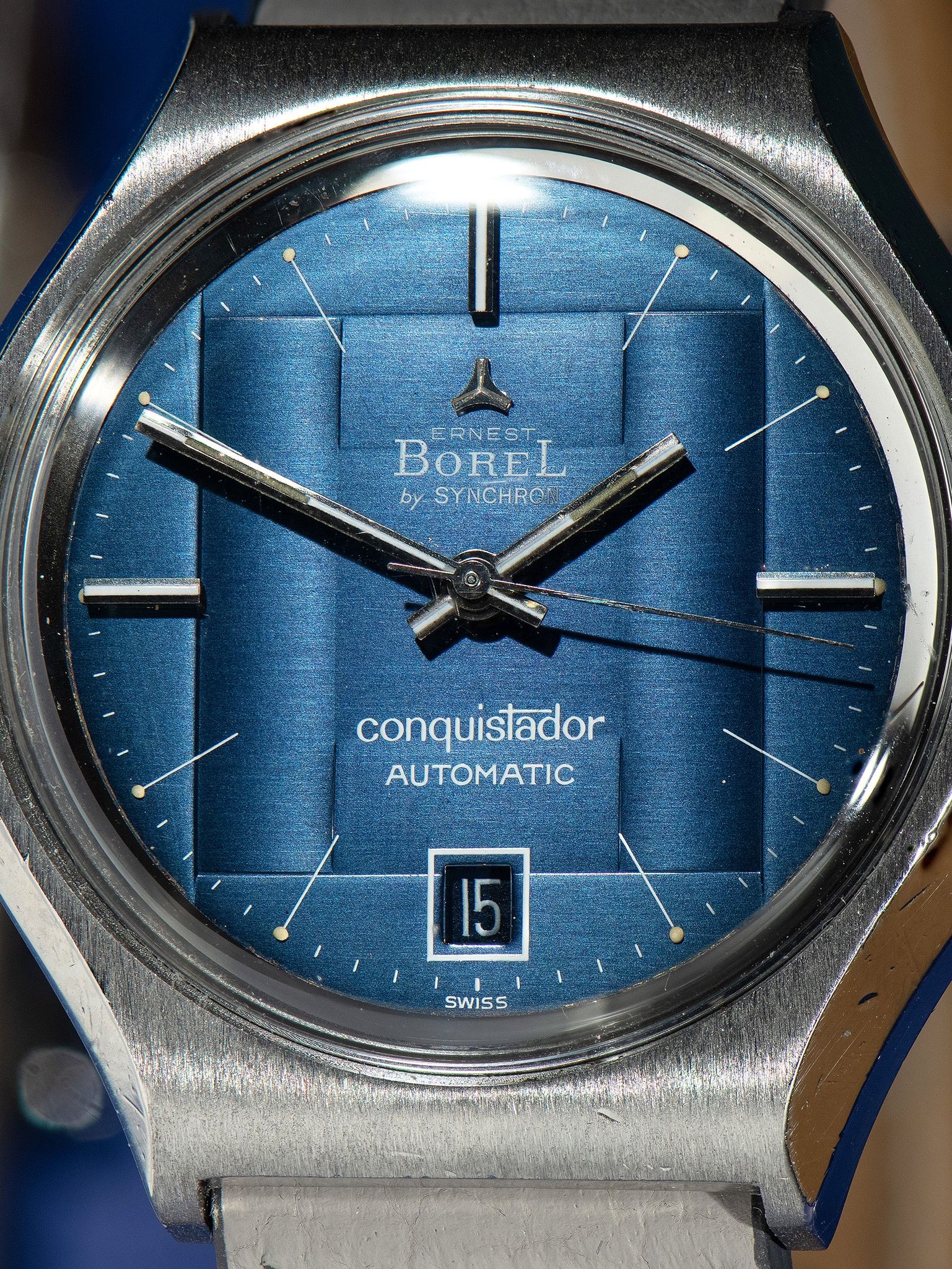 Offered here is a 1970s Ernest Borel Conquistador, produced during the brand’s brief but notable period under the Synchron group, alongside Doxa and Cyma. This example stands out with its striking blue fumé dial, a hallmark of the era that adds depth and vibrancy to its vintage charm. A lesser-seen model with a bold aesthetic, the Conquistador is a great representation of Synchron’s design-forward approach during this time.