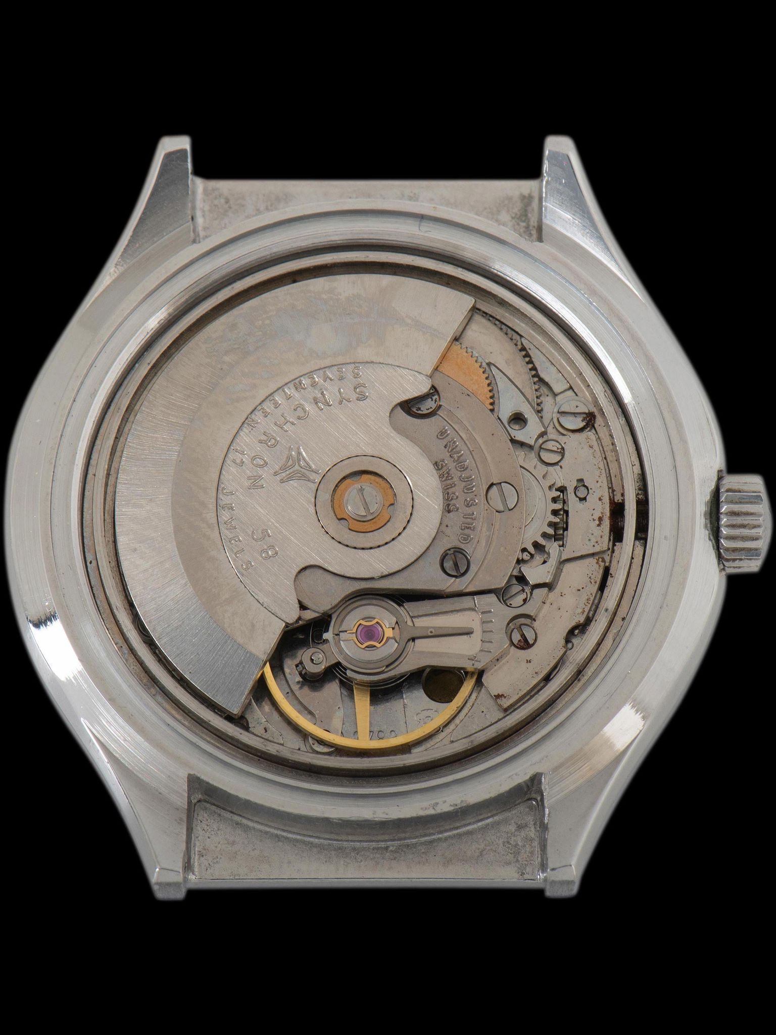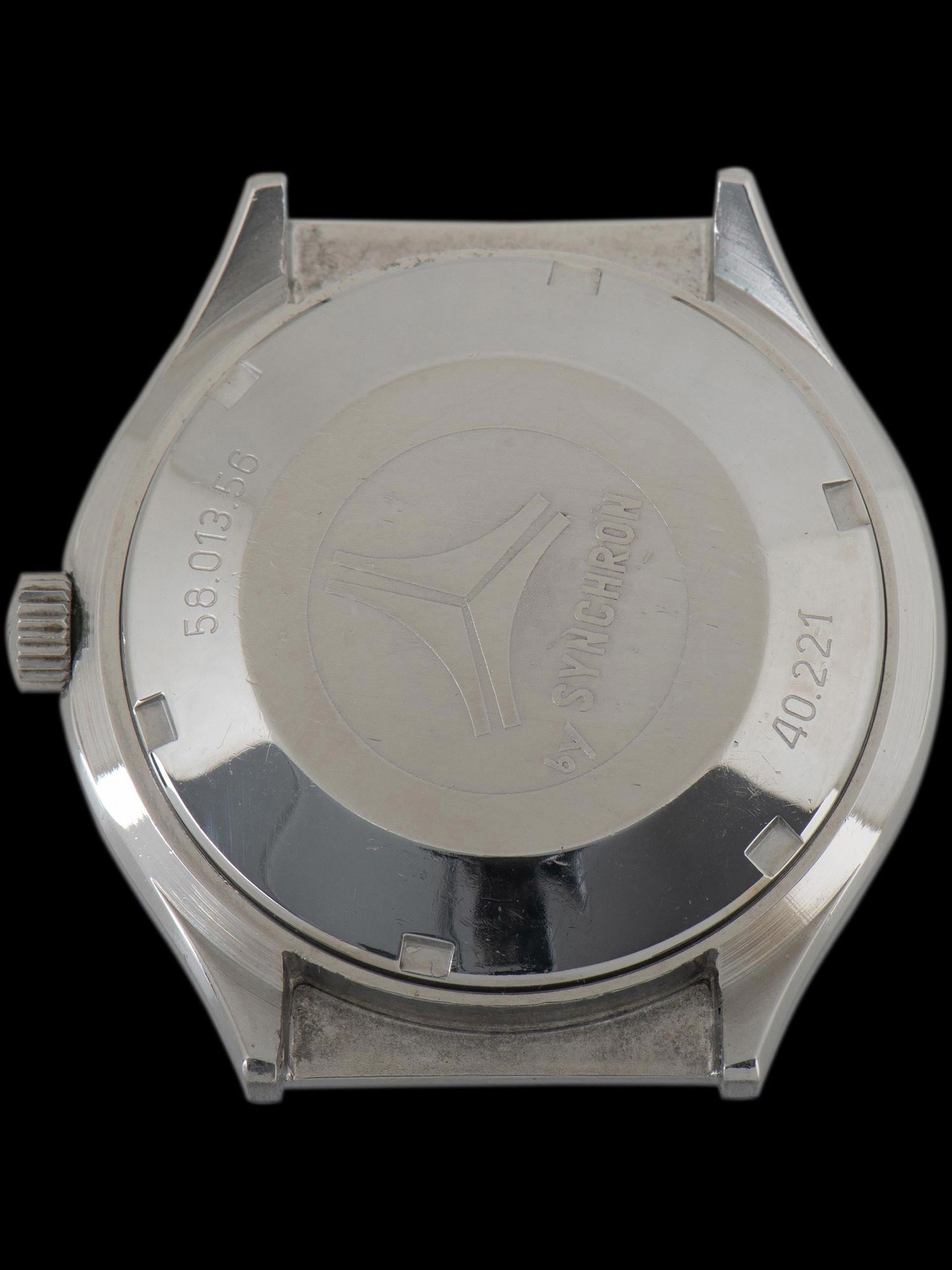 The unique and handsome stainless steel case is in excellent condition overall, showing crisp finishing and bevels throughout, with light signs of use and minimal evidence of being previously polished present. The case retains its original crown adorned with the Synchron logo. The case back retains all of its original factory markings. The watch comes supplied on a 2pc leather strap.