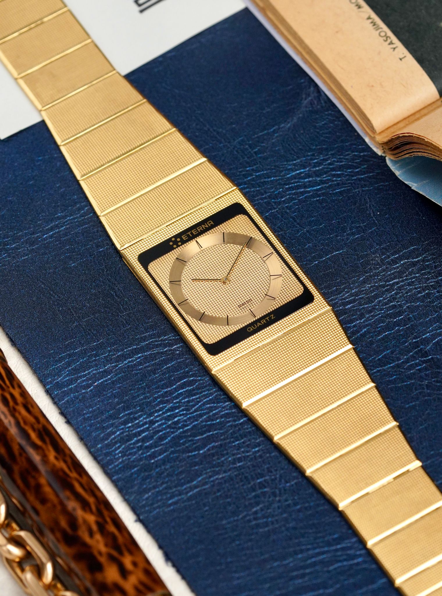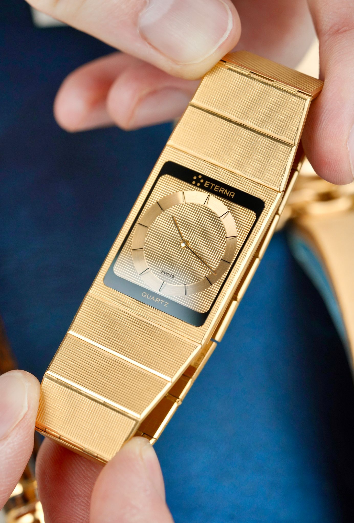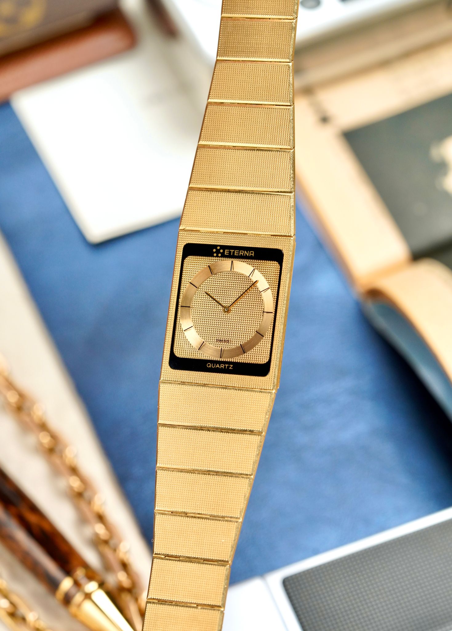 A sensational and very rare late 1970's Eterna Delierium, the watch that set the record for the thinnest in the world at 1.8mm thin, in solid 18K yellow gold, it's dial and case completely finished with the finest hobnail pattern l've seen, powered by the ultra thin ETA quartz caliber 999, this watch is running well and sized to fit a 6.75 inch wrist.