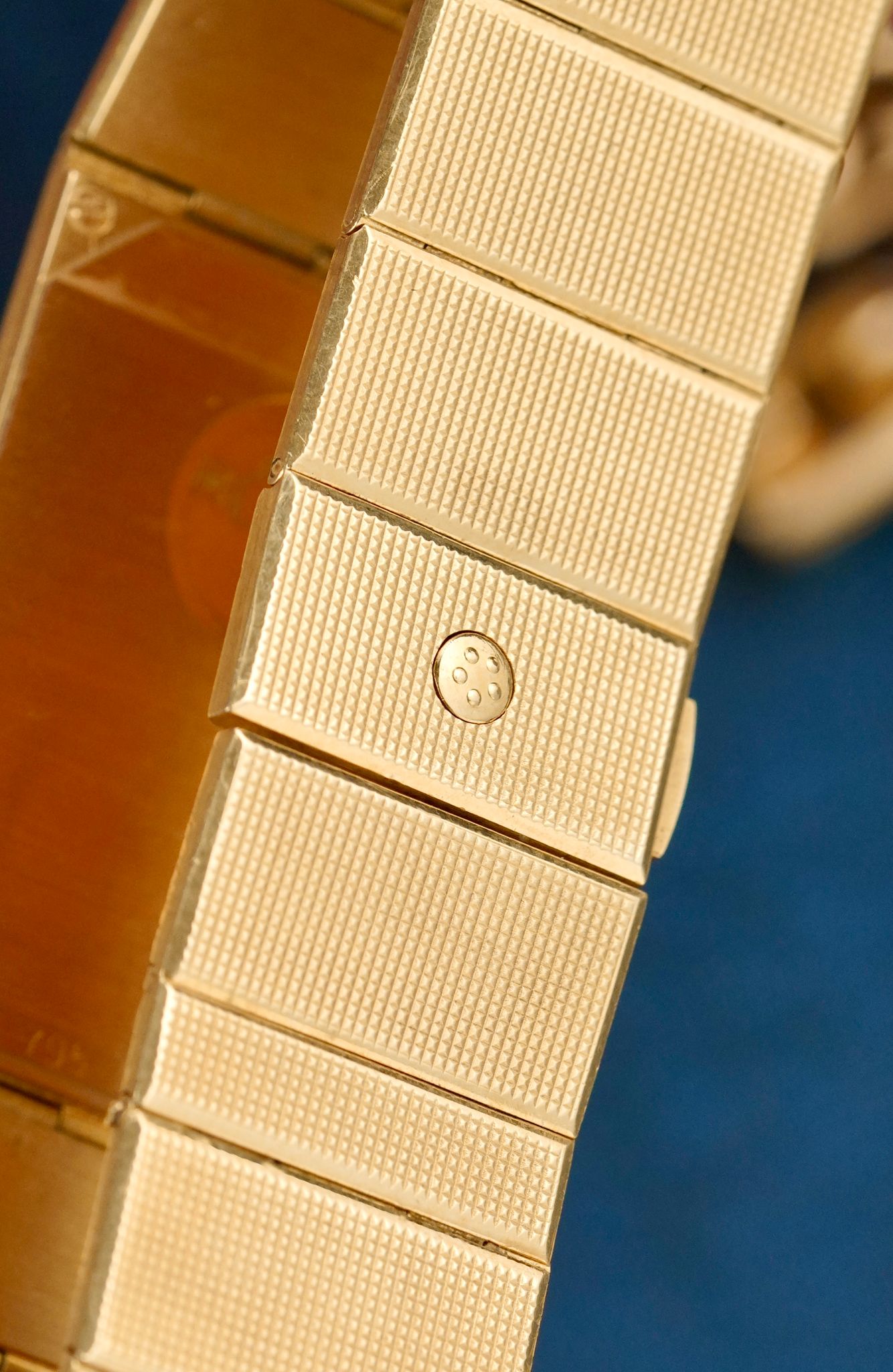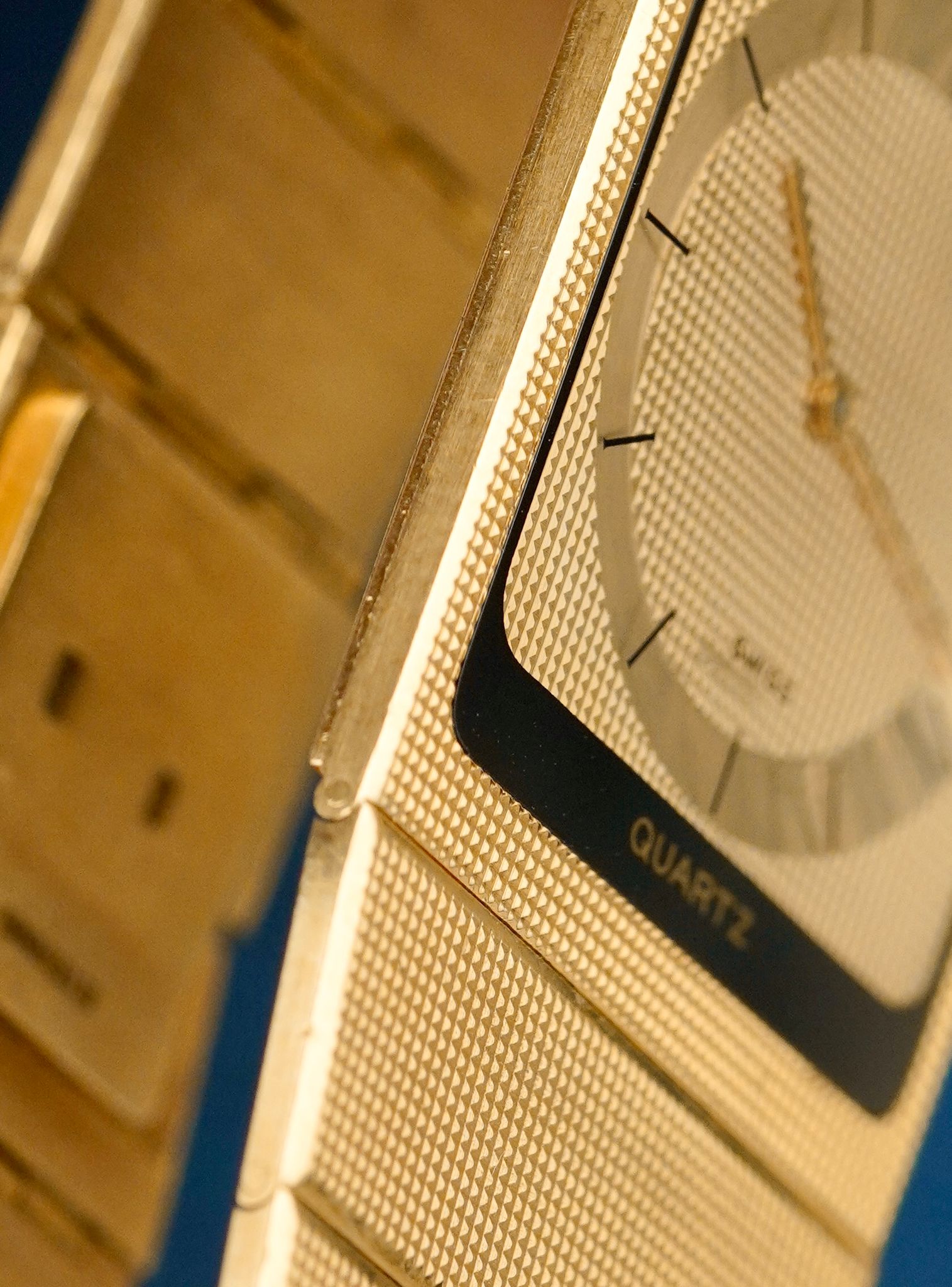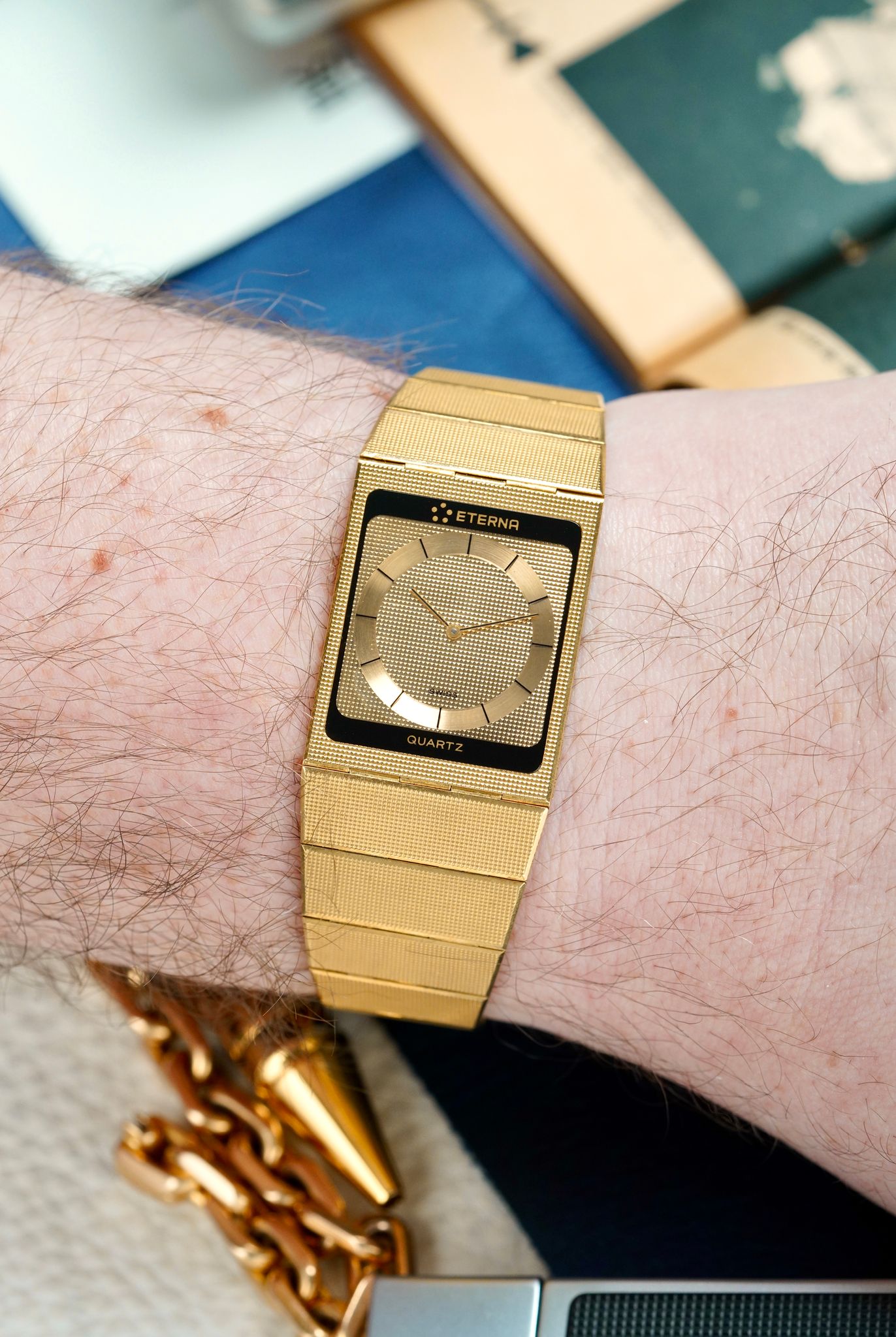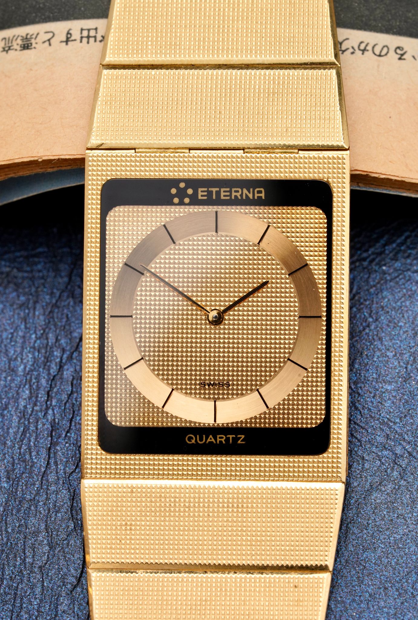 A sensational and very rare late 1970's Eterna Delierium, the watch that set the record for the thinnest in the world at 1.8mm thin, in solid 18K yellow gold, it's dial and case completely finished with the finest hobnail pattern l've seen, powered by the ultra thin ETA quartz caliber 999, this watch is running well and sized to fit a 6.75 inch wrist.