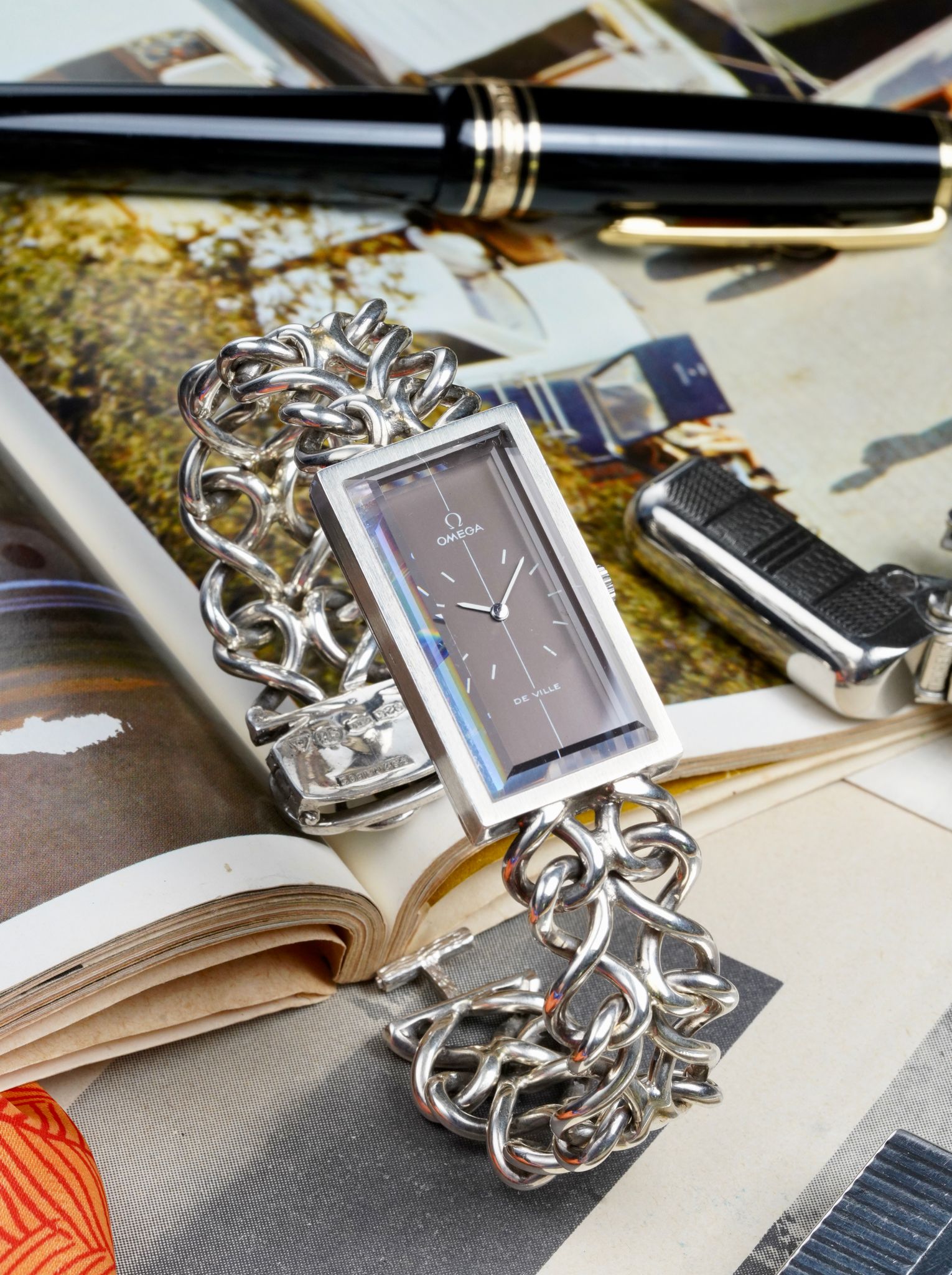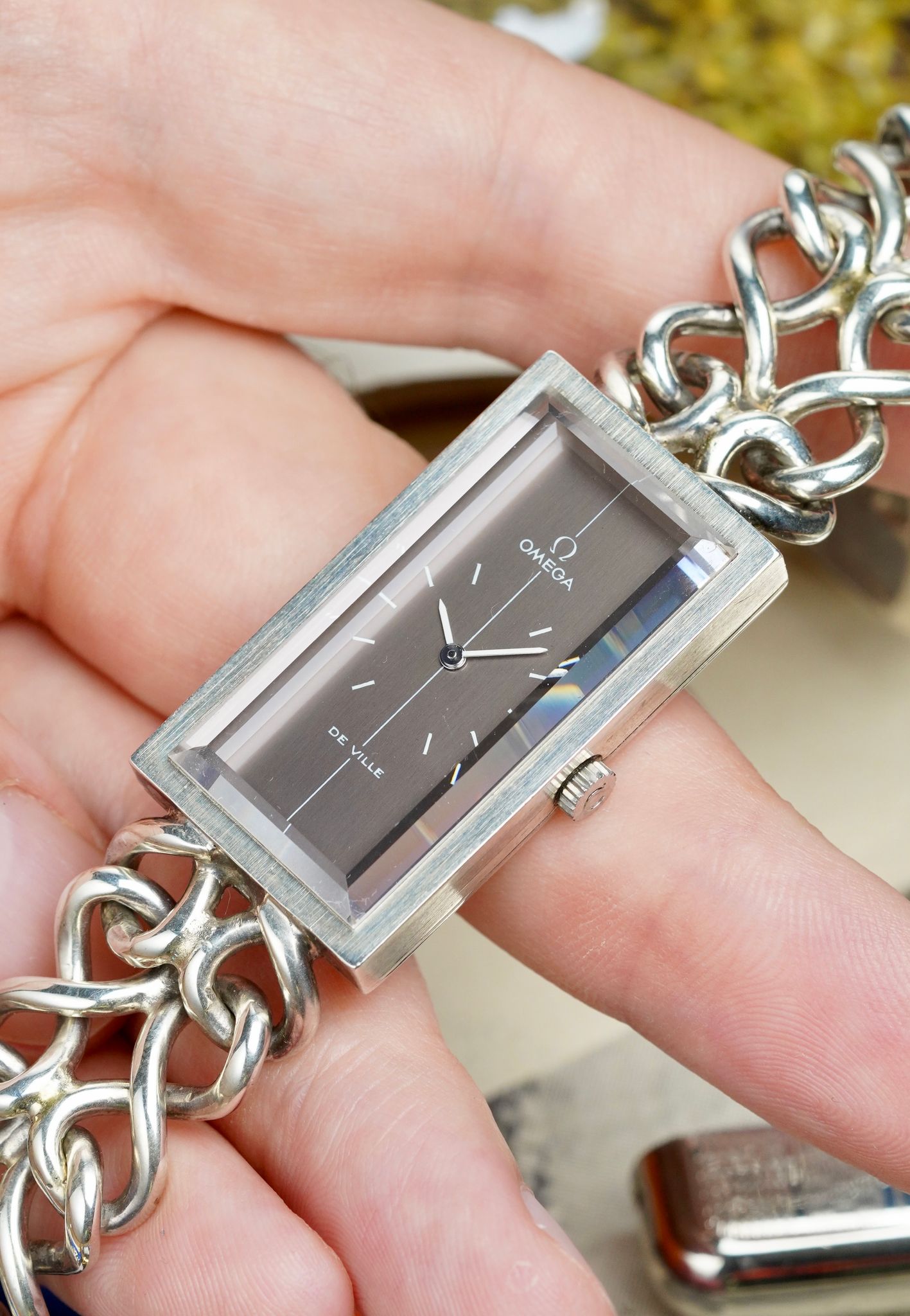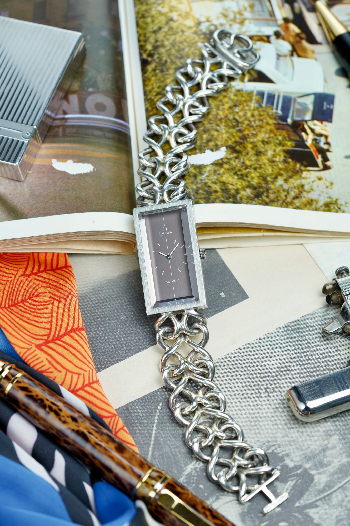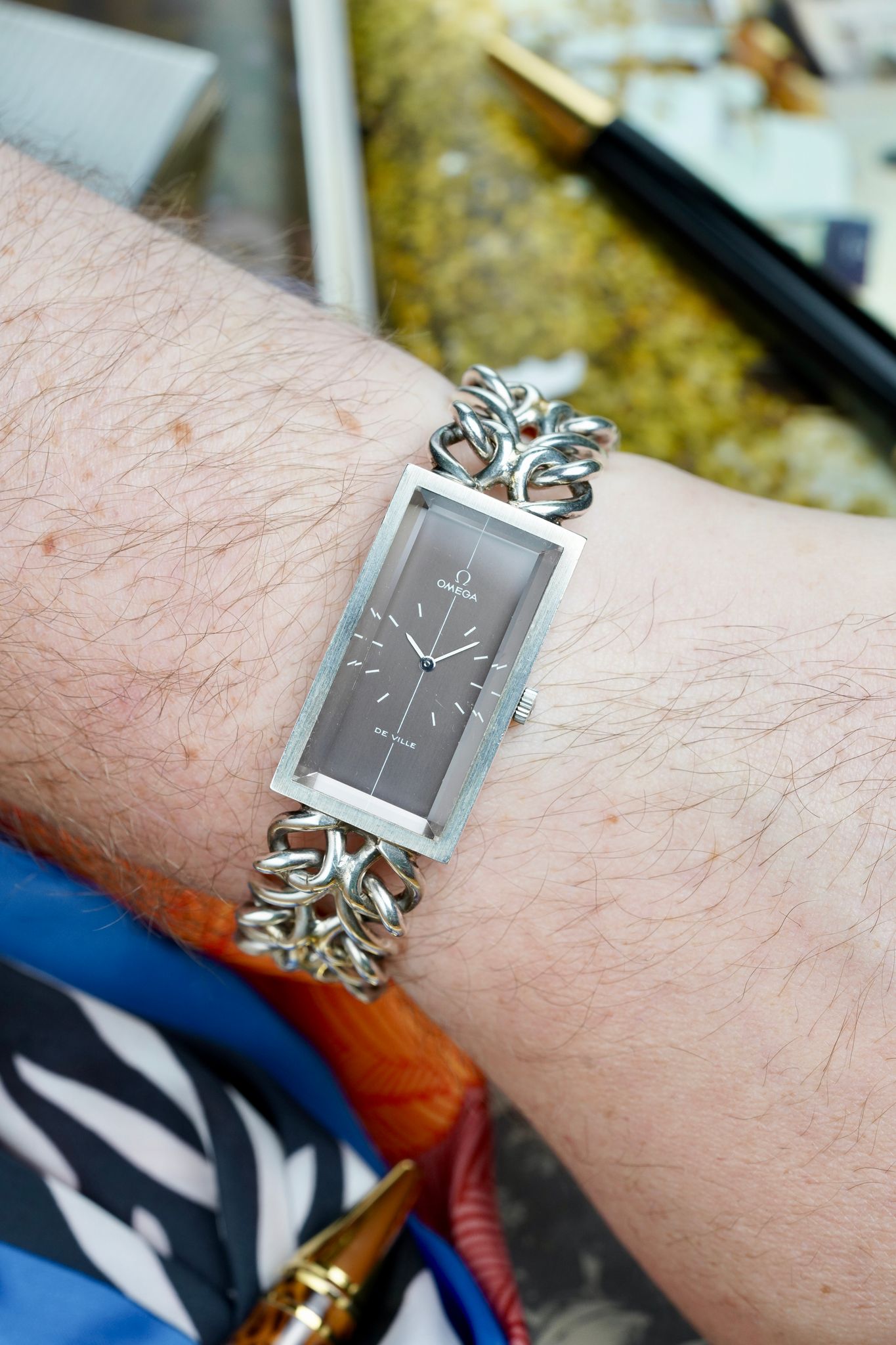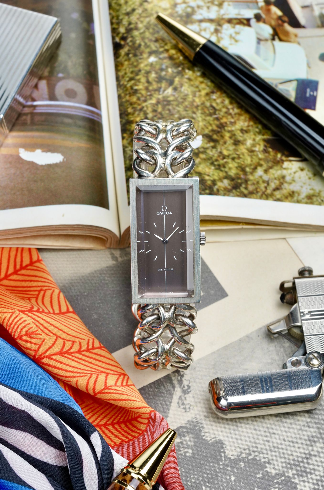 One of the boldest designs in vintage can be seen right here. British high jewelry designer Andrew Grima, who made pieces for royalty, collaborated with Omega in the 1970s to create some wild novelties, this tank style being one of the most famous and sought after.