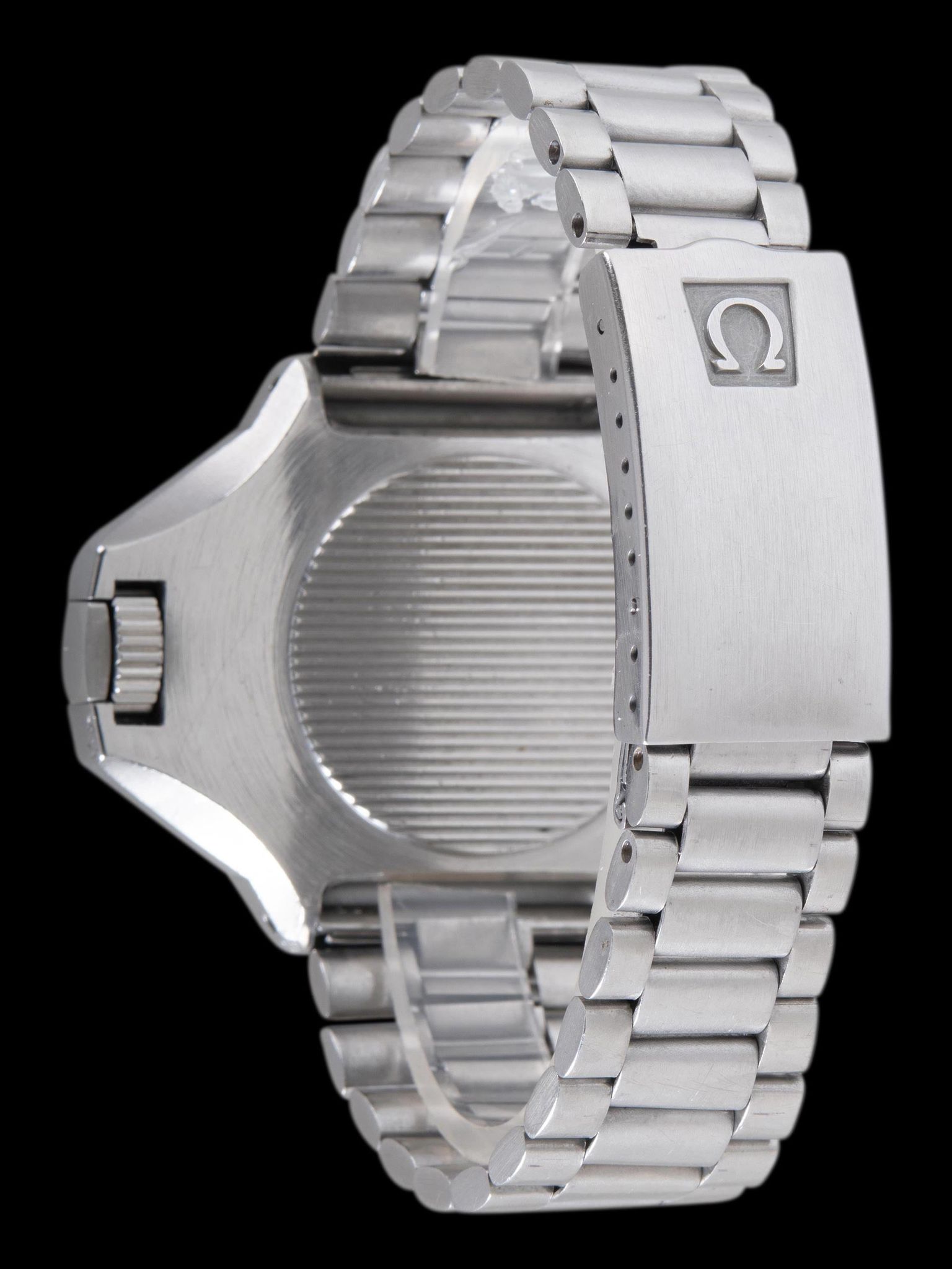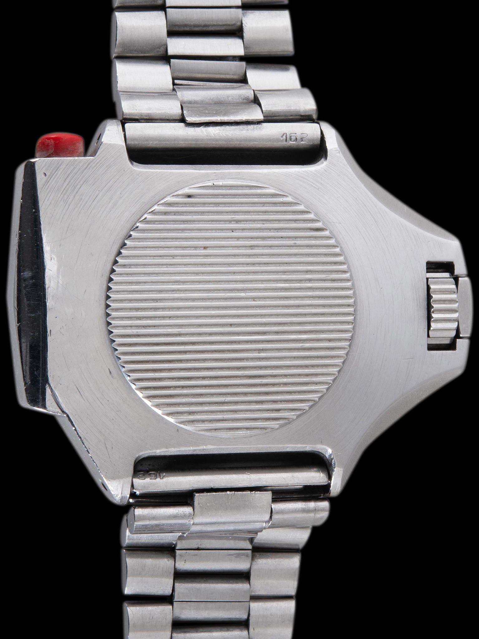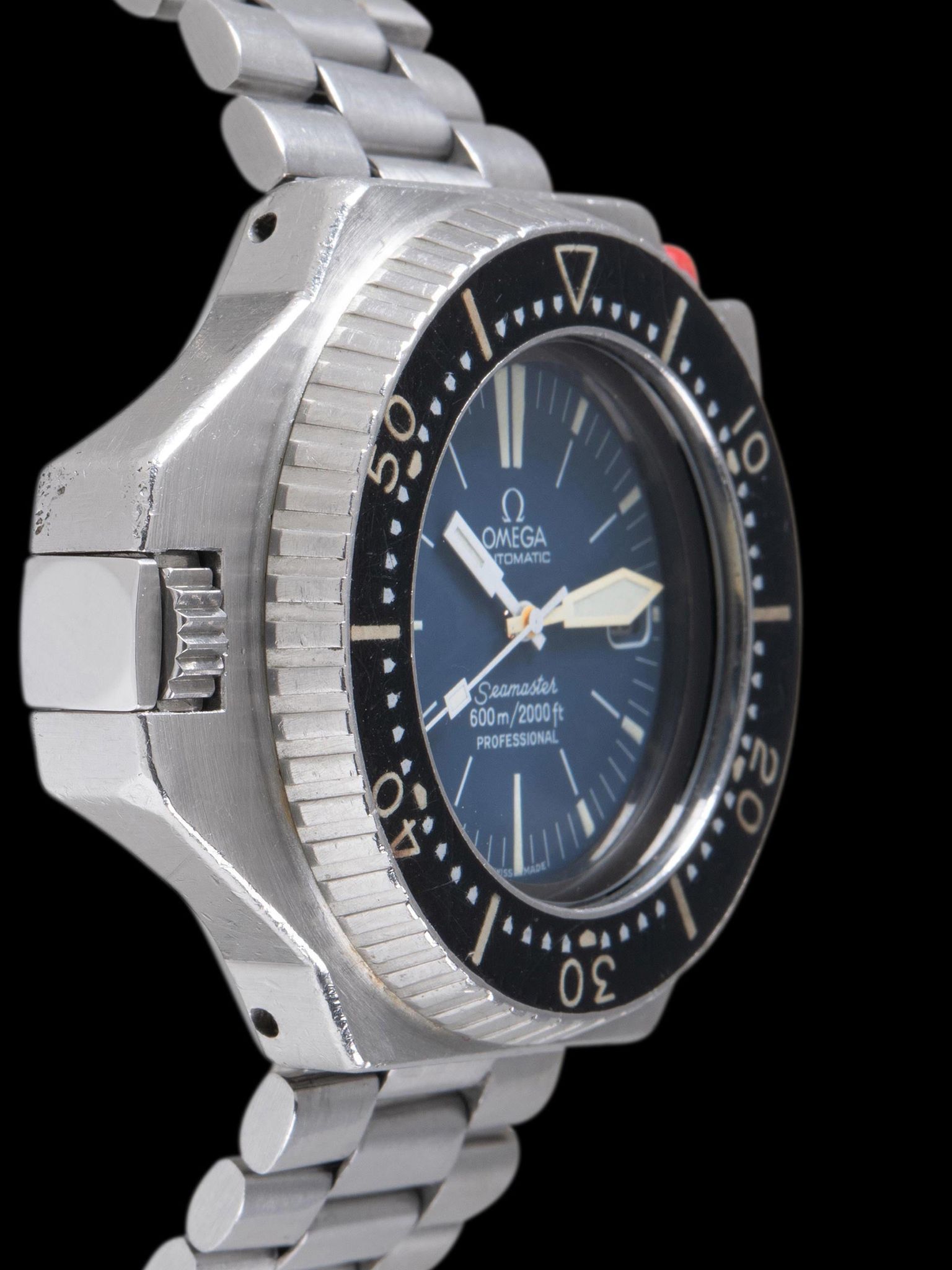 The case retains the factory geometry and dimensions while exhibiting honest wear throughout. The locking crown and nut work perfectly and the watch retains its original red bezel locking push button. The original Omega Mk II bezel remains in excellent condition with expected wear from use and no cracks or degradation. The mineral glass crystal is free from major scratches or wear. The Omega 1162 bracelet with 162 end pieces retains 23 links that show light stretch and will fit up to an 8-inch wrist. The original metallic date wheel also remains with the watch.