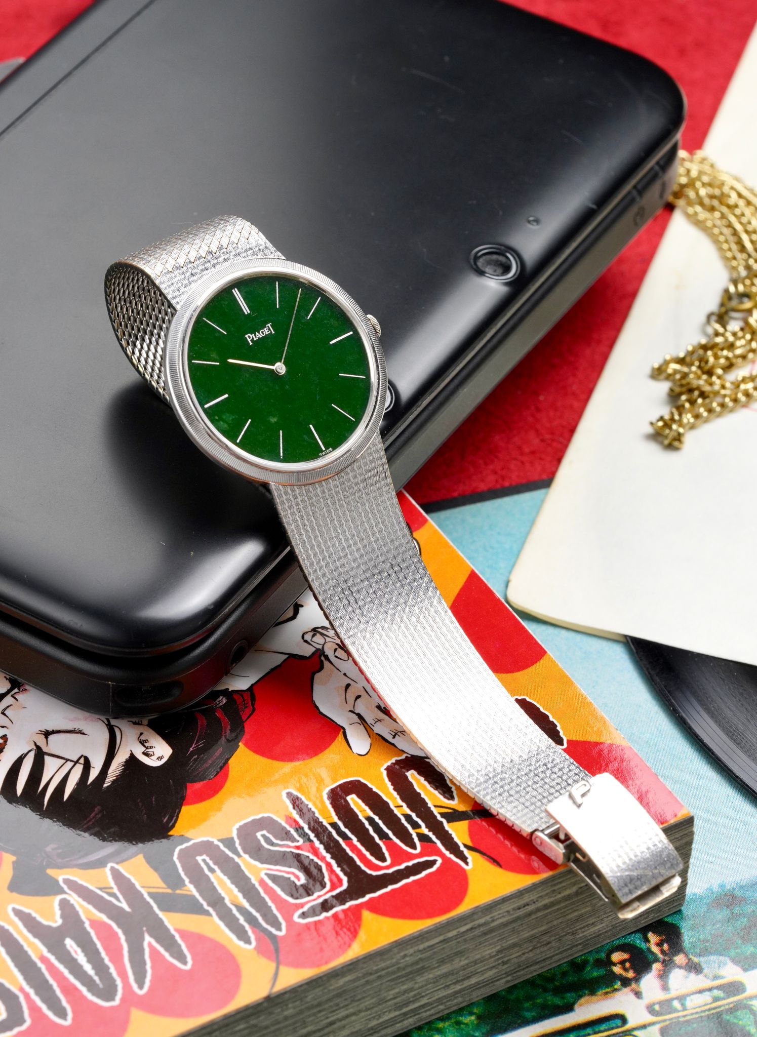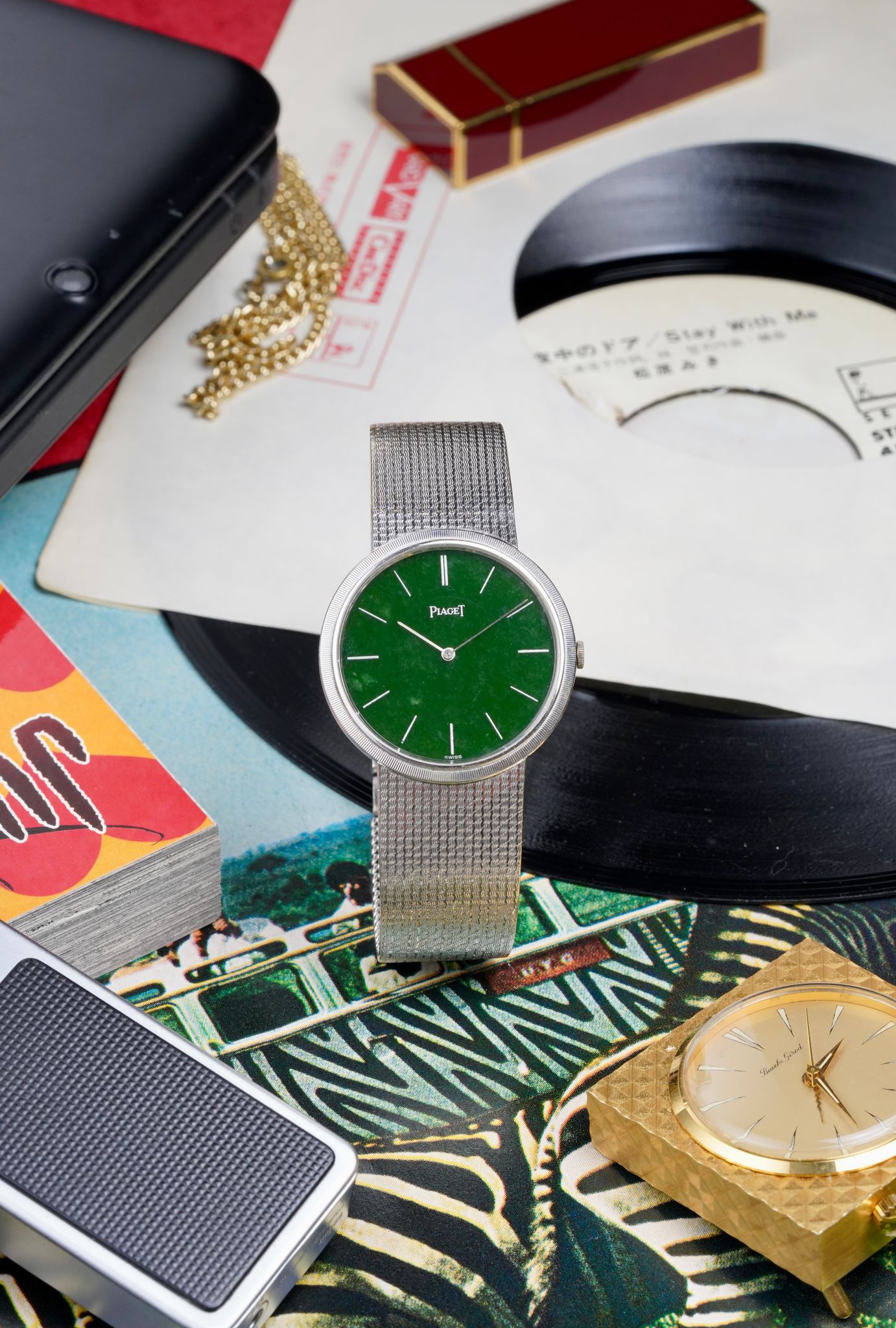 A 1970s Piaget Disco Volante ref. 9023 with a stunning dial hewn of Jade stone, in 18K white gold and powered by the ultra thin manual wind cal. 9P.