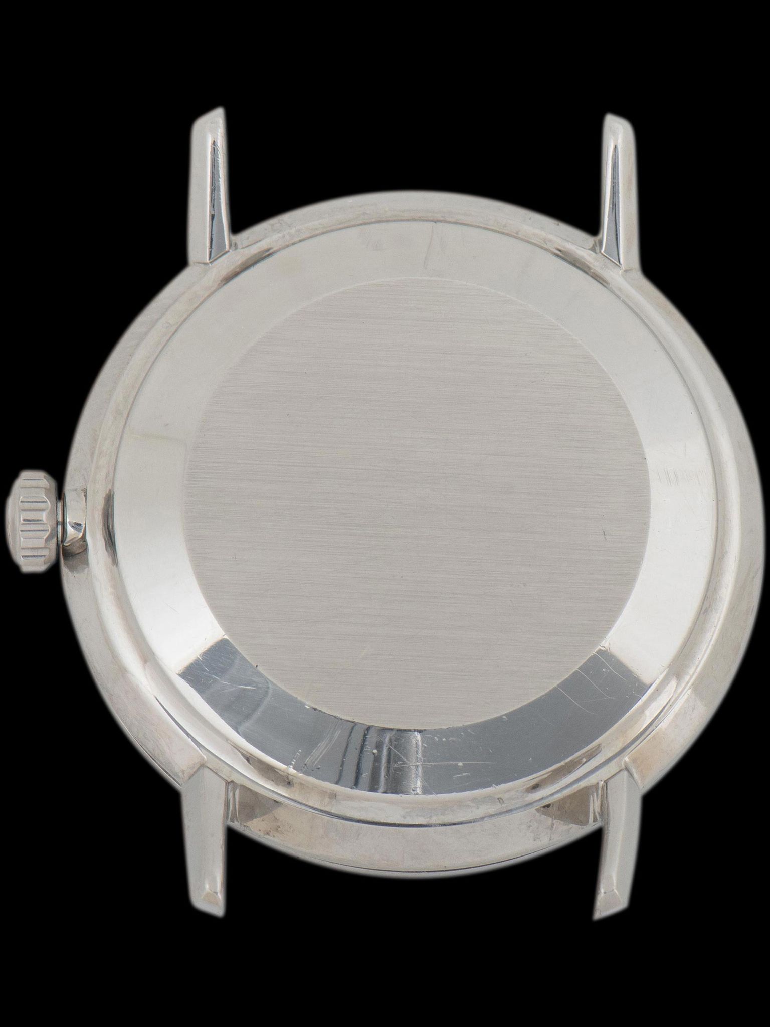The luxurious and unique silver "sigma" sunburst dial features factory-set diamond markers at 6, 9, and 12 o'clock, giving the watch a subtle yet stylish flair while also achieving a larger wrist presence than its case dimensions measure due to the silver dial. The dial itself is in exceptionally well-preserved vintage condition, showing no damage or notable elements of age. The tritium lume plots exhibit some light degradation throughout, though most remain intact and feature a charming eggshell patina. The original enamel inlaid and tritium tipped hands complement the subtle elegance of this watch perfectly. Under inspection, the tritium hands match the dial perfectly with no degradation, though there is some black enamel missing in the minutes hand.