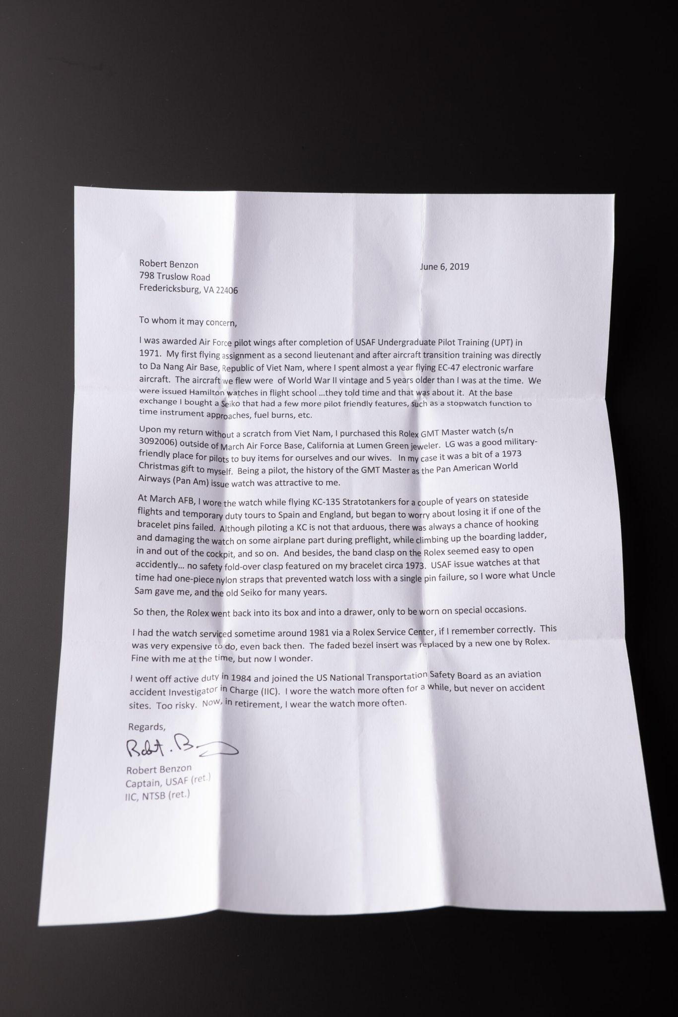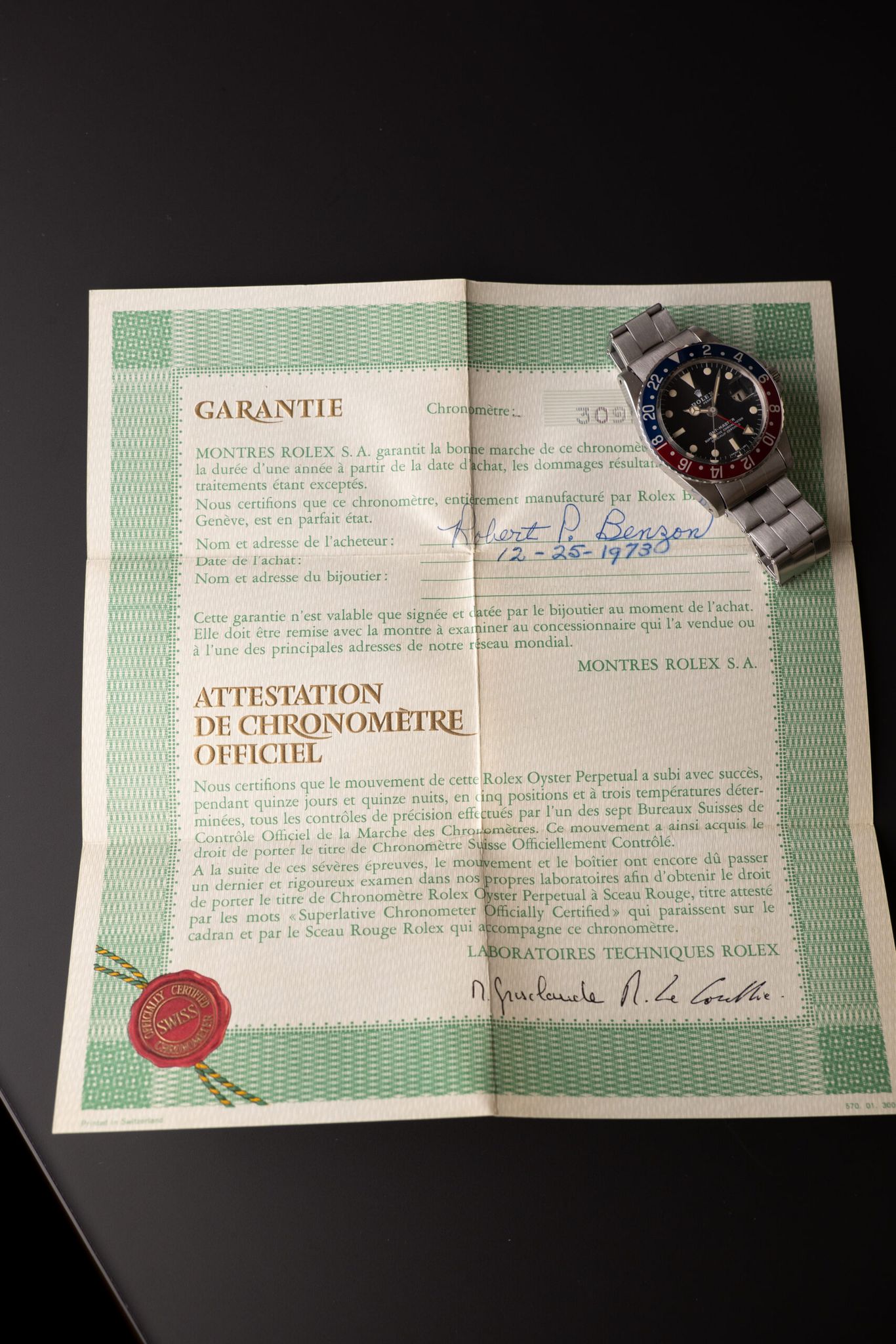 Watches like this GMT make the long hours well worth it. The original provenance of this watch shows that it was owned by a retired Air Force captain that served during the Vietnam war as well as the NTSB as a crash investigator which included one of the 9/11 plane crashes along with TWA flight 800 and the Hudson River flight. Included are the original box and papers that show Robert Benzon’s name on the certificate as well as a page documenting his career and the origins of his Pepsi GMT. The paperwork mentions a service date in 1981 where Rolex Service Center replaced the original insert with a service one. This was replaced back to a period correct one at some point likely after Robert sold this watch. Dial and case are in excellent condition as well and this is a correct MK2 insert. This watch has definitely lived a life that could fill a book and we are so glad to be able to offer it to a future custodian and aviation enthusiast.