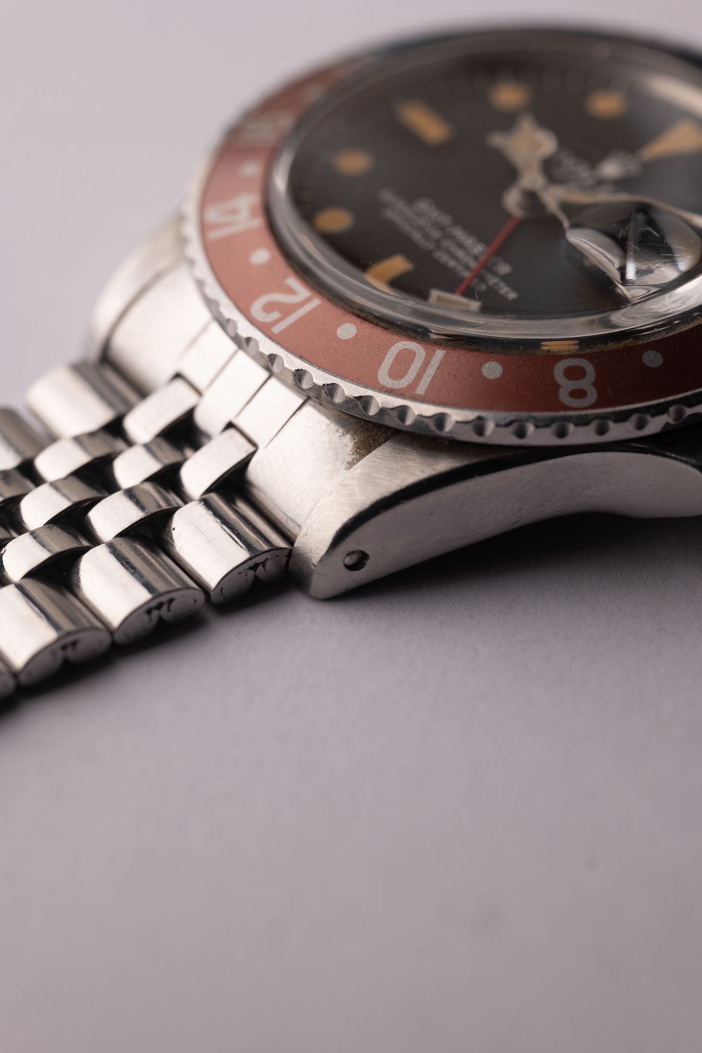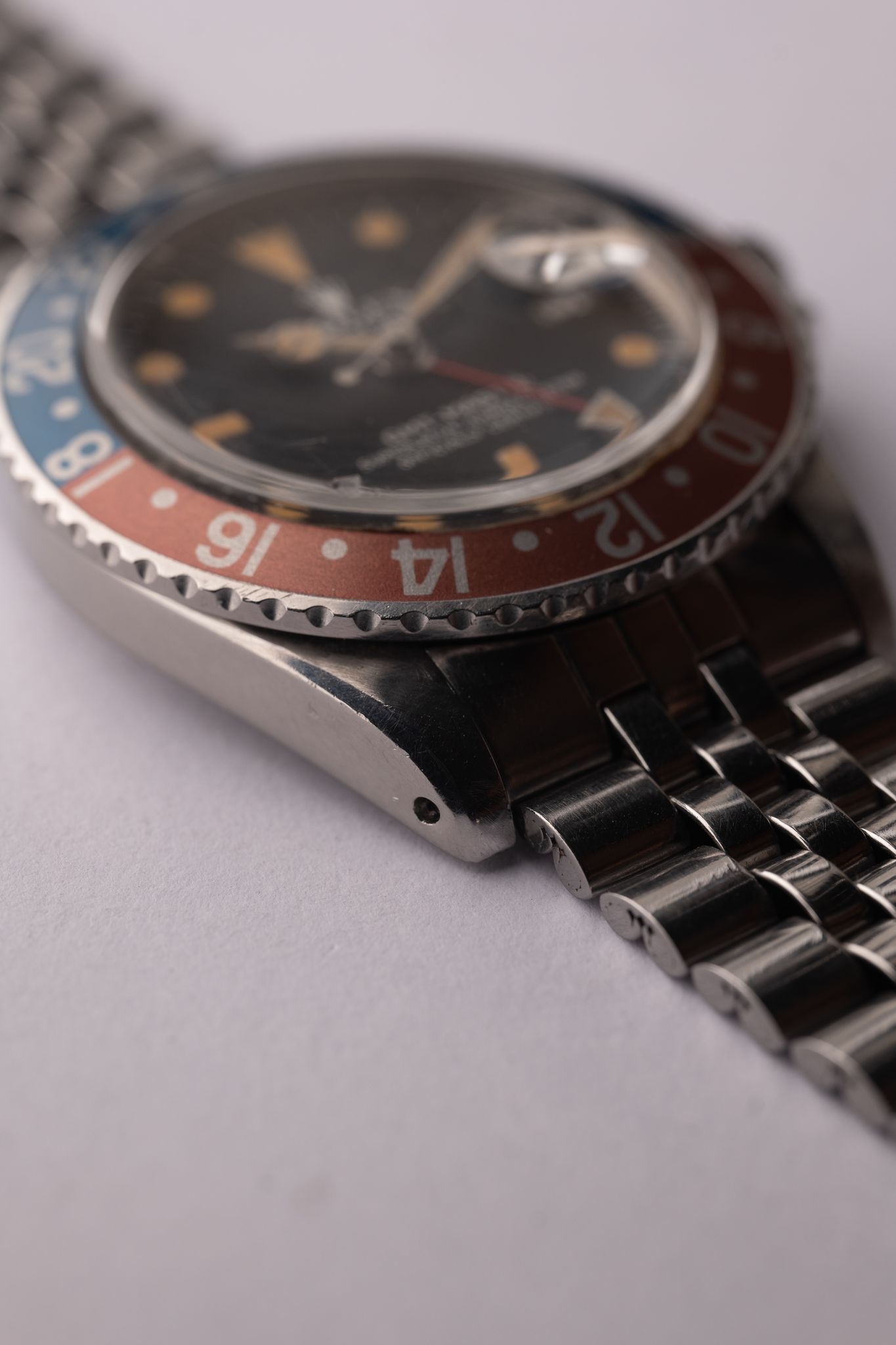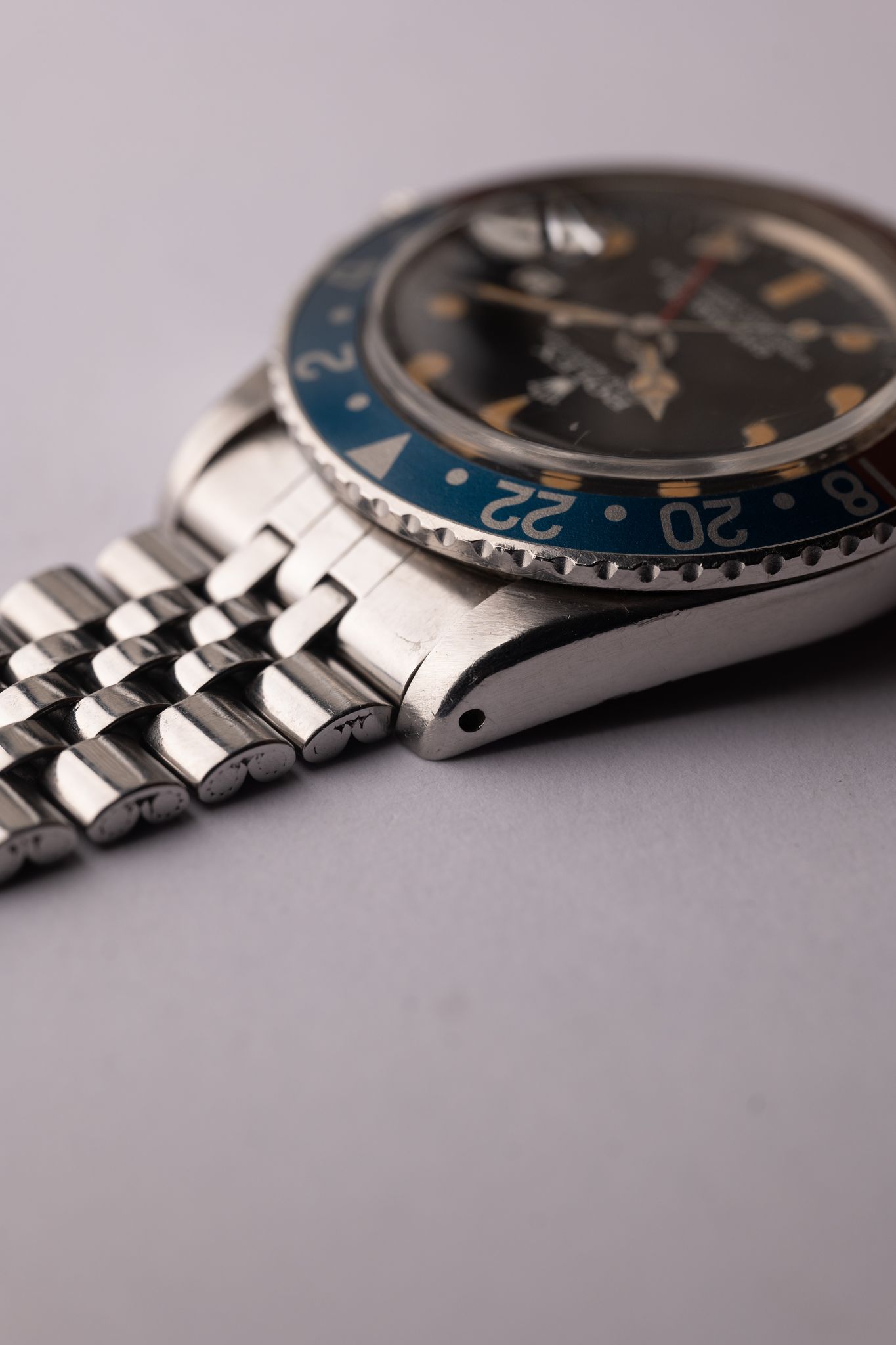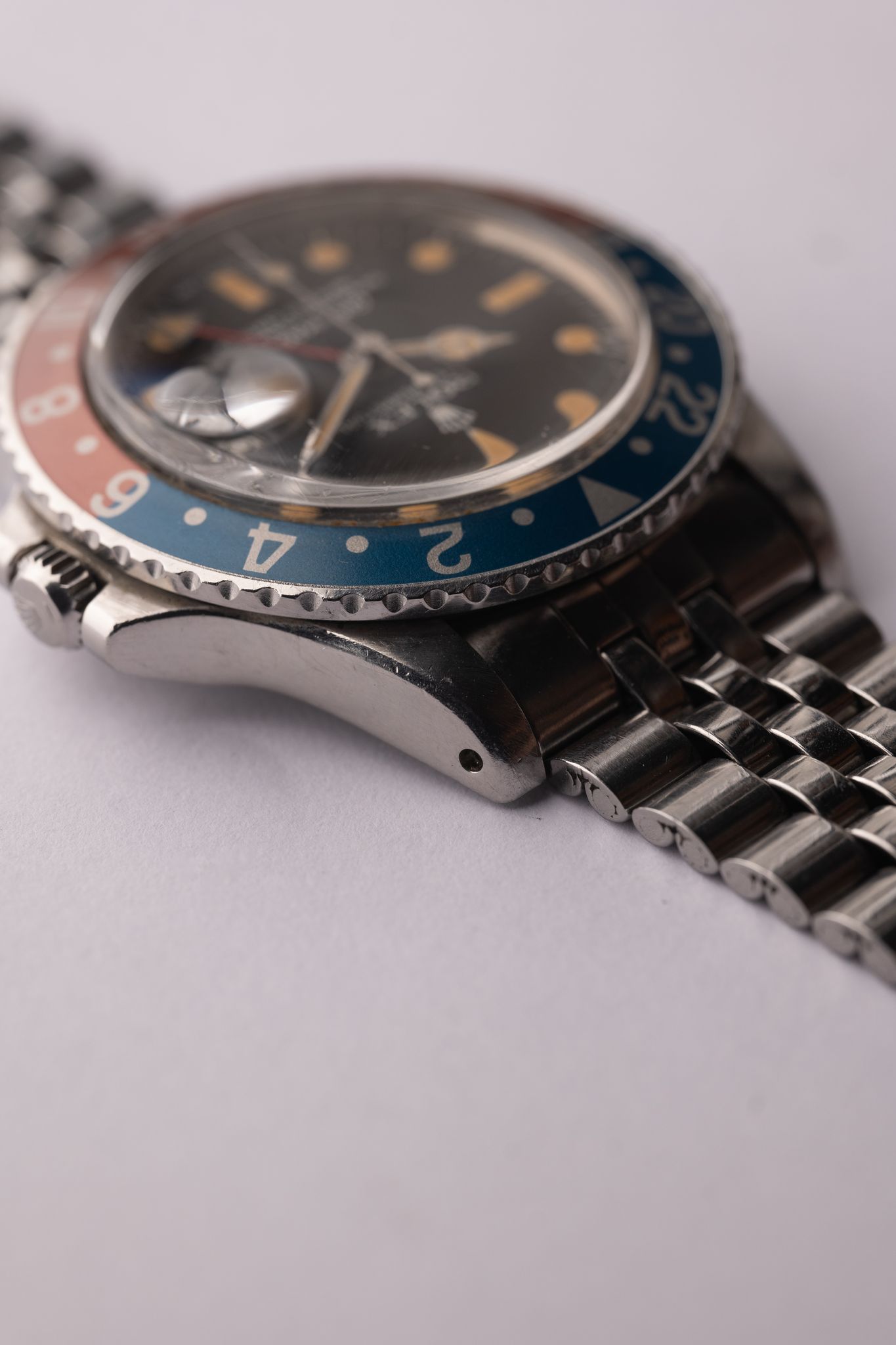The MK4 variant of the 1675 GMT has a very distinct crown on the logo. The lume on this particular one appears to have gone nuclear and is as pumpkin as it gets. Insert is an excellent period correct Pepsi with subtle tones of blue and copper. The case has been lightly polished in the past but the original bevels are still visible. Comes on Jubilee bracelet