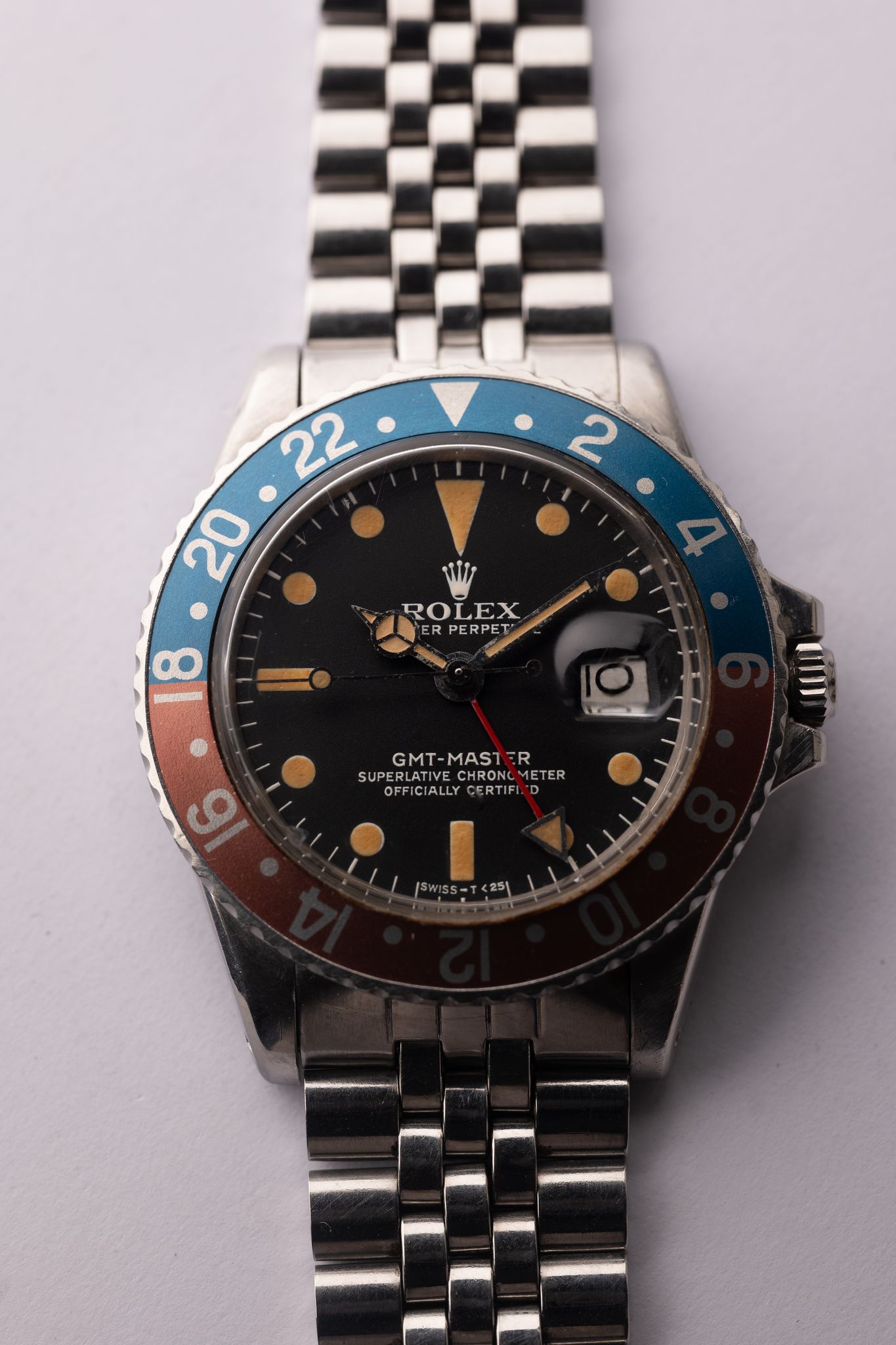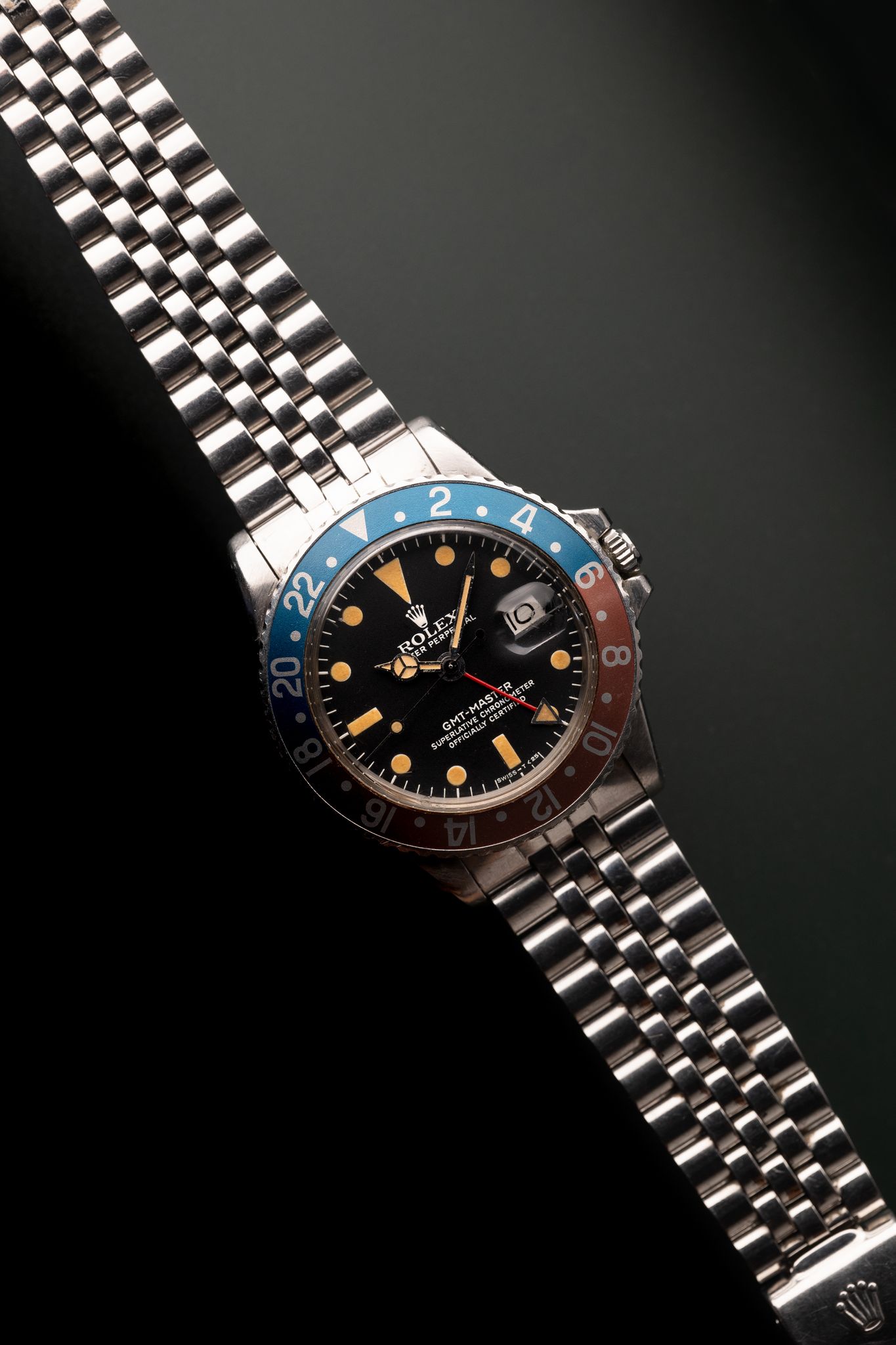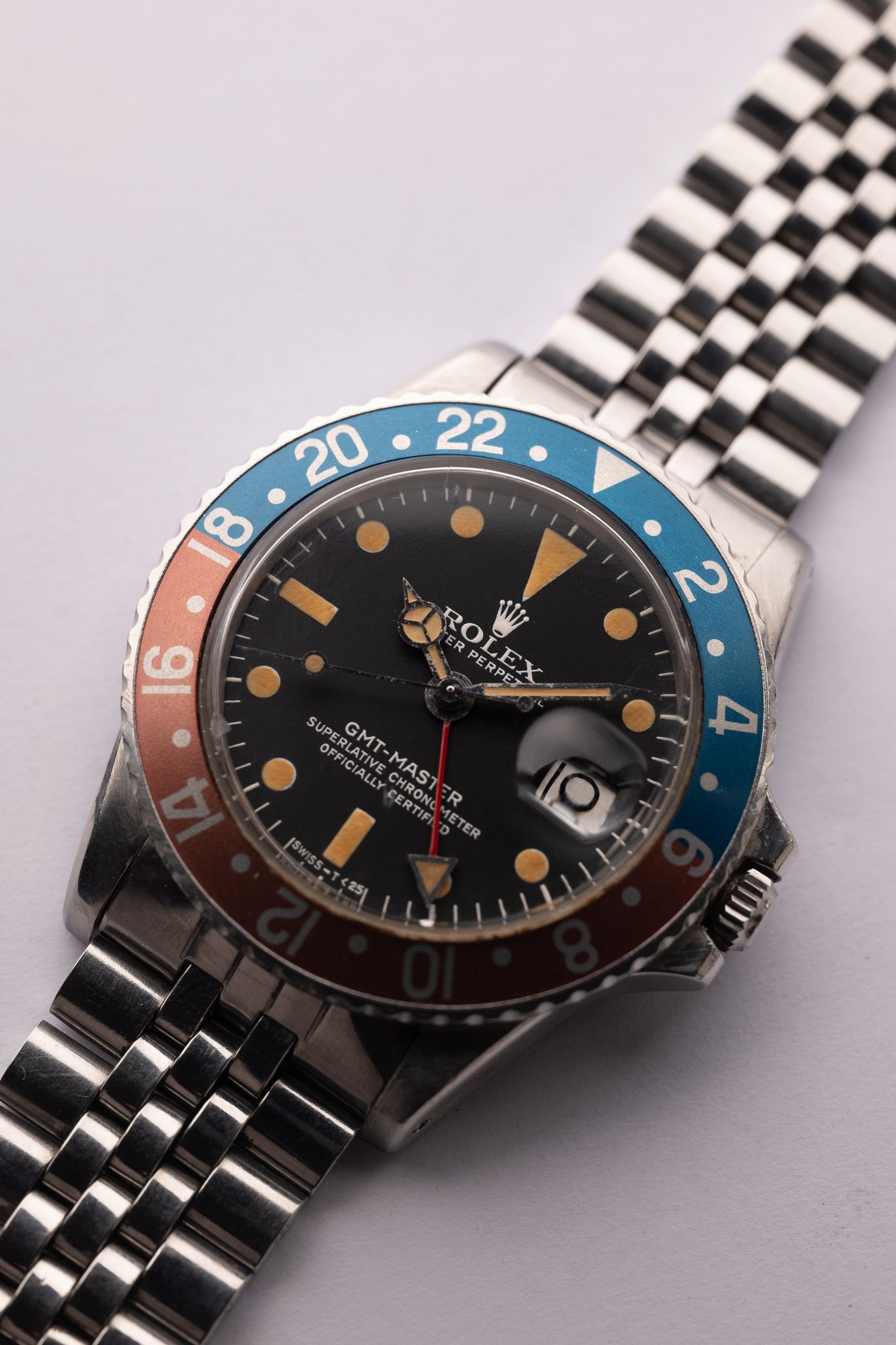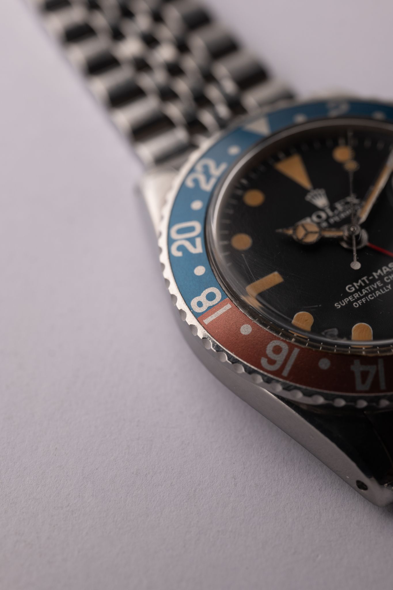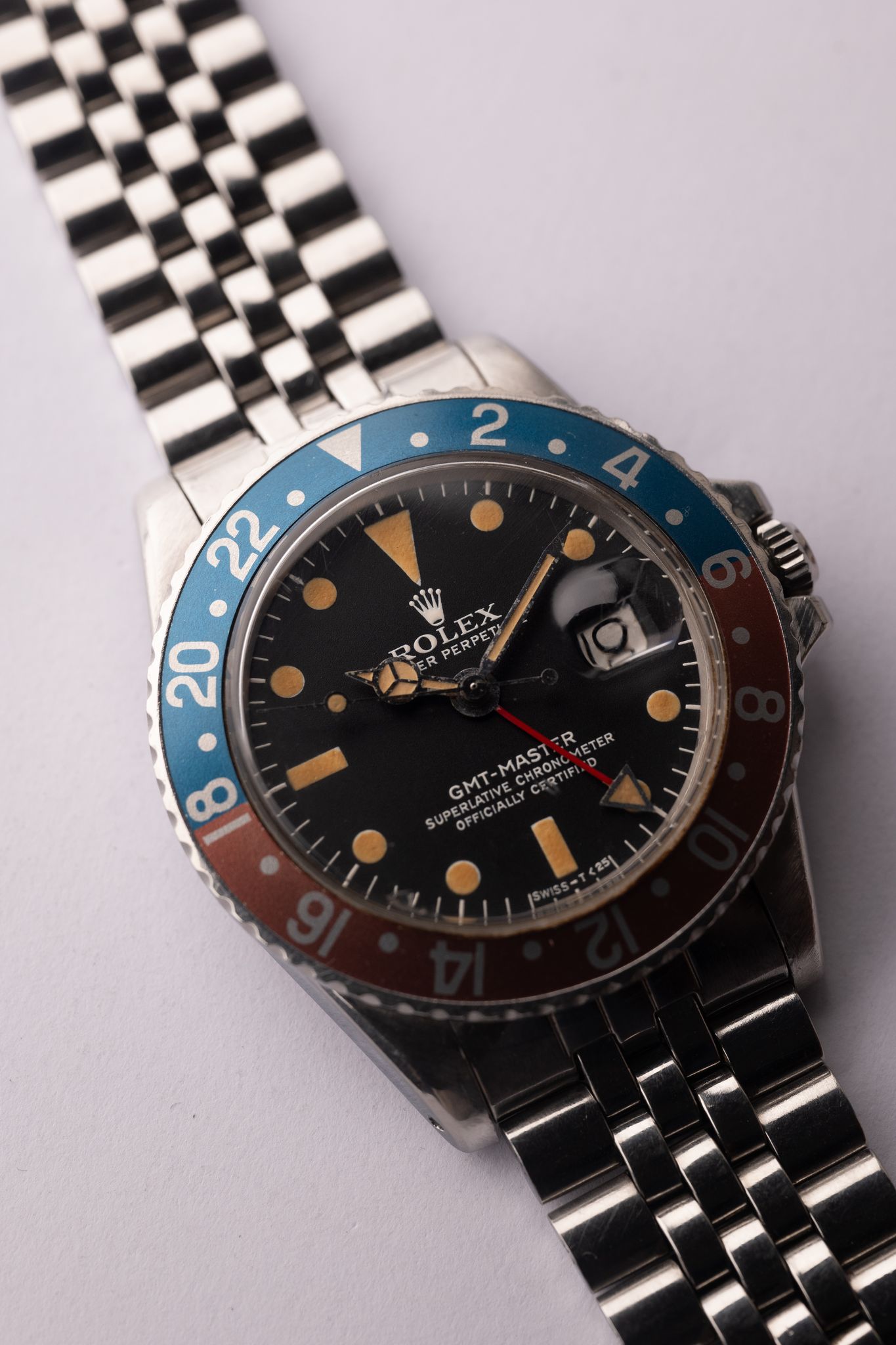 The MK4 variant of the 1675 GMT has a very distinct crown on the logo. The lume on this particular one appears to have gone nuclear and is as pumpkin as it gets. Insert is an excellent period correct Pepsi with subtle tones of blue and copper. The case has been lightly polished in the past but the original bevels are still visible. Comes on Jubilee bracelet