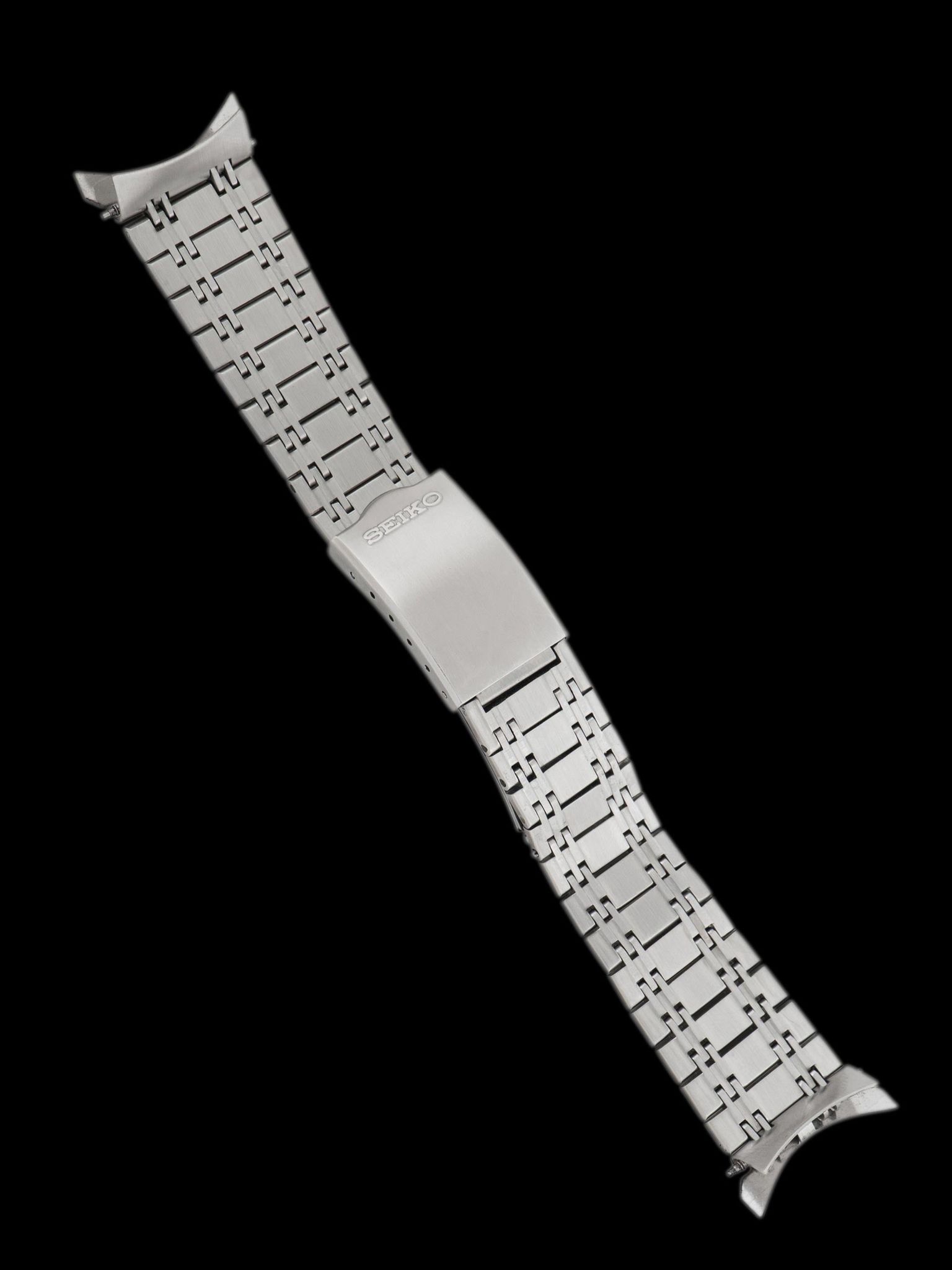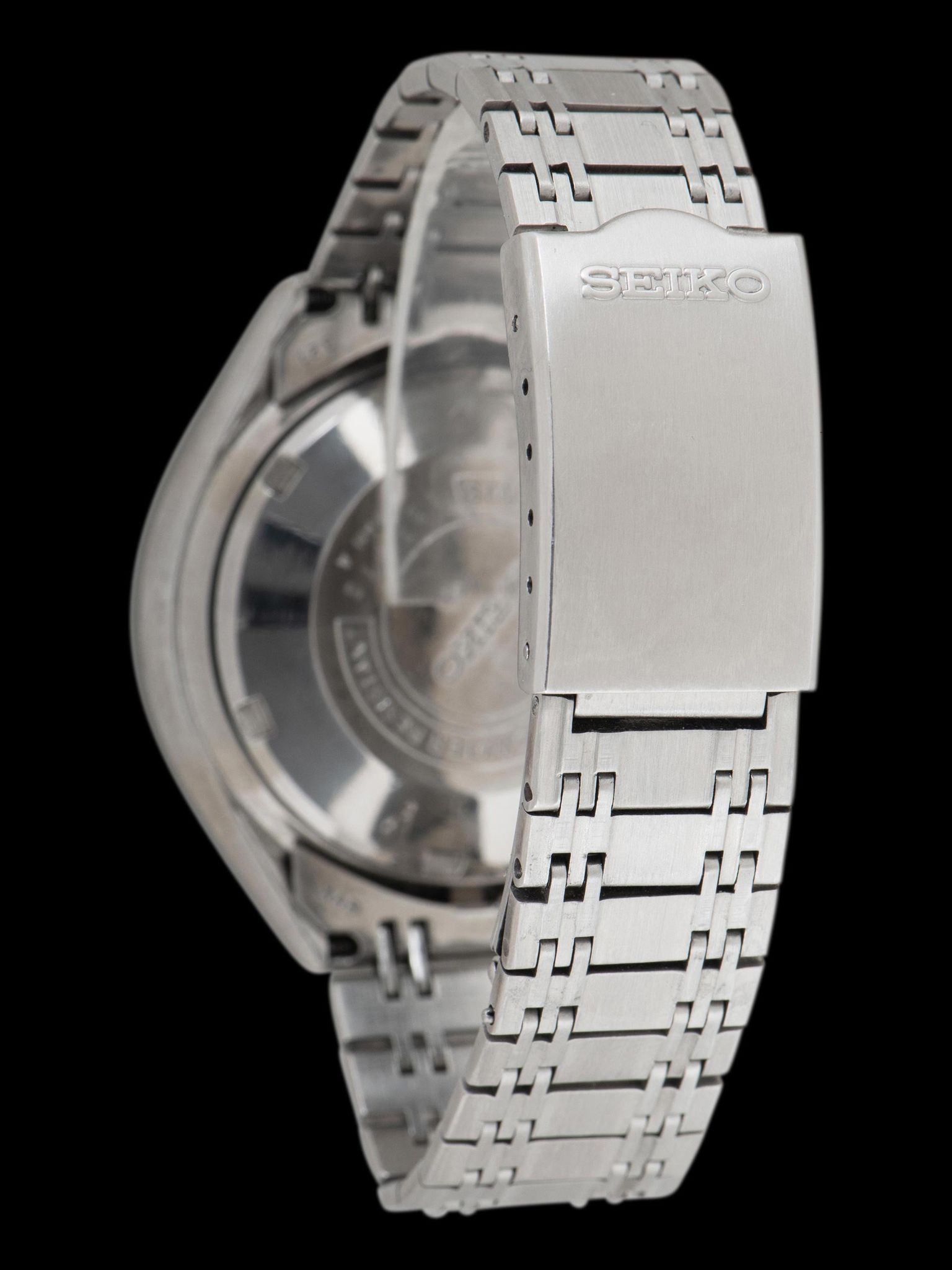 The excellent case exhibits minimal signs of use and light evidence of being previously polished. The case retains its original unsigned crown and pump pushers. The case back retains all of its original factory markings in crisp condition. The original and rare Seiko bracelet retains 21 links that show light stretch and will fit up to a 6.75-inch wrist. The bracelet does feature some minor repairs on the underside, so they are invisible when on wrist.