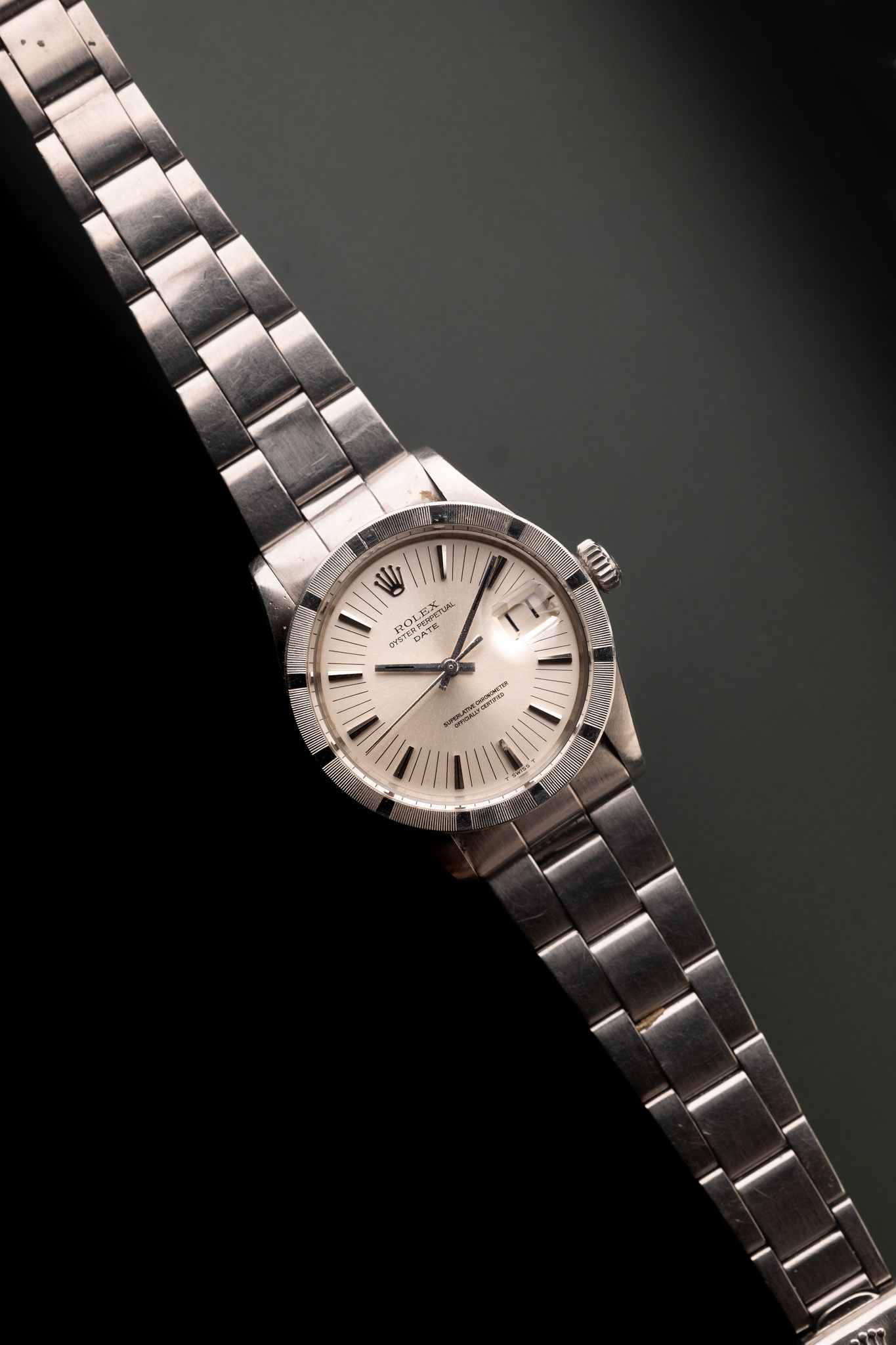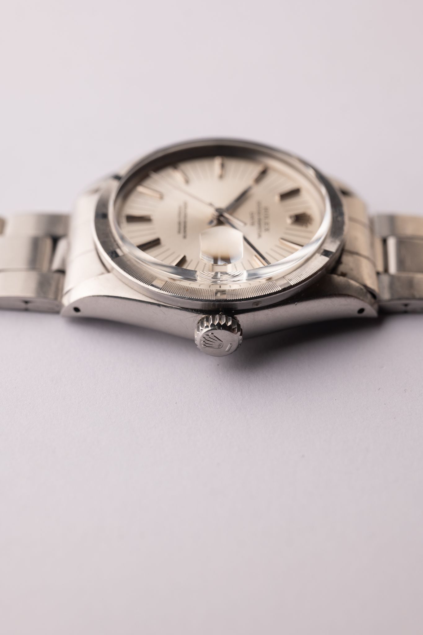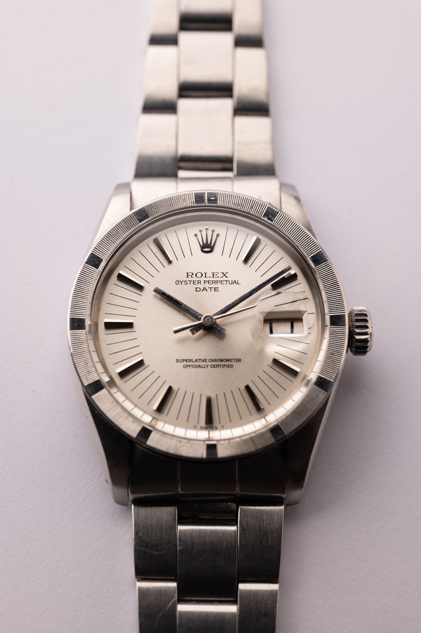 Description: This 1501 is featured with a radial dial which is rarely seen on the Oyster Perpetual, this model is further elevated by its engine-turned bezel. And together, these details create a standout piece among the 1500 references. The watch is in excellent condition, with thick lugs throughout.