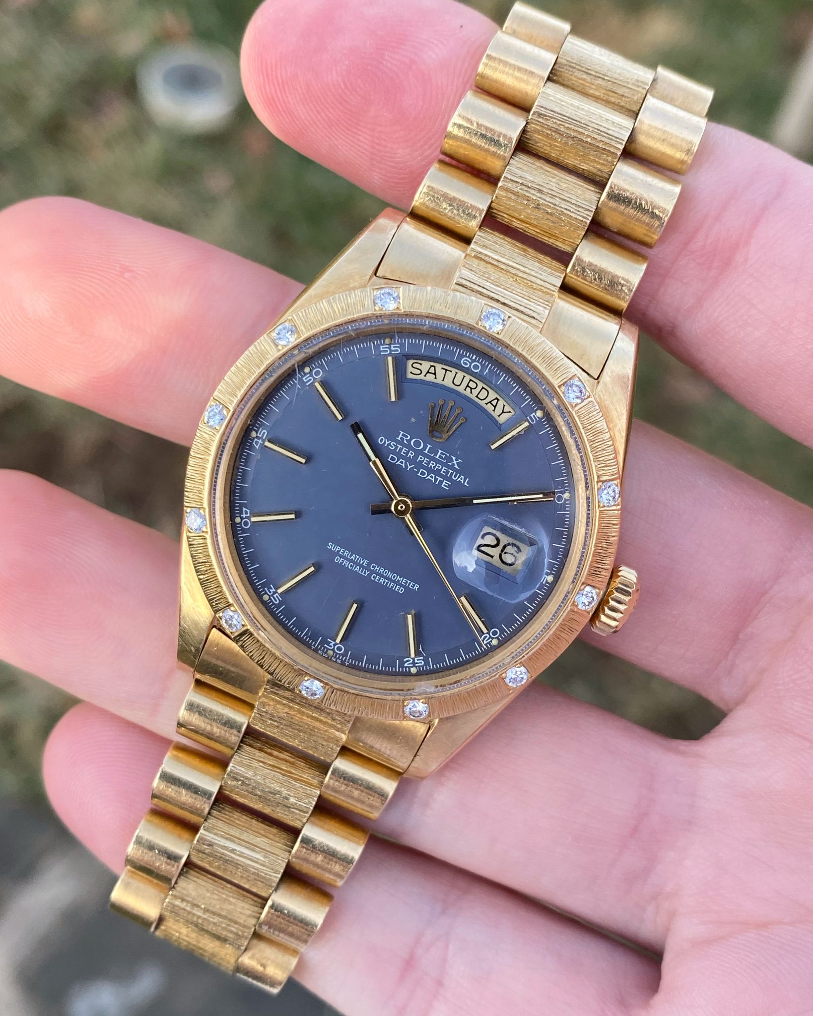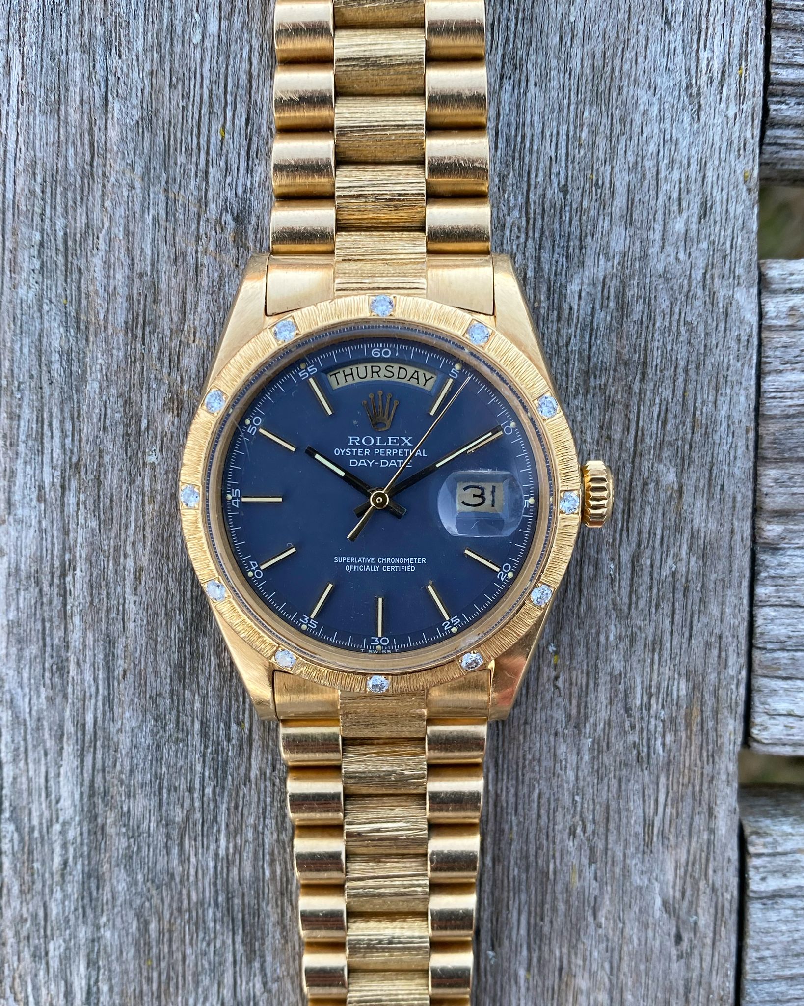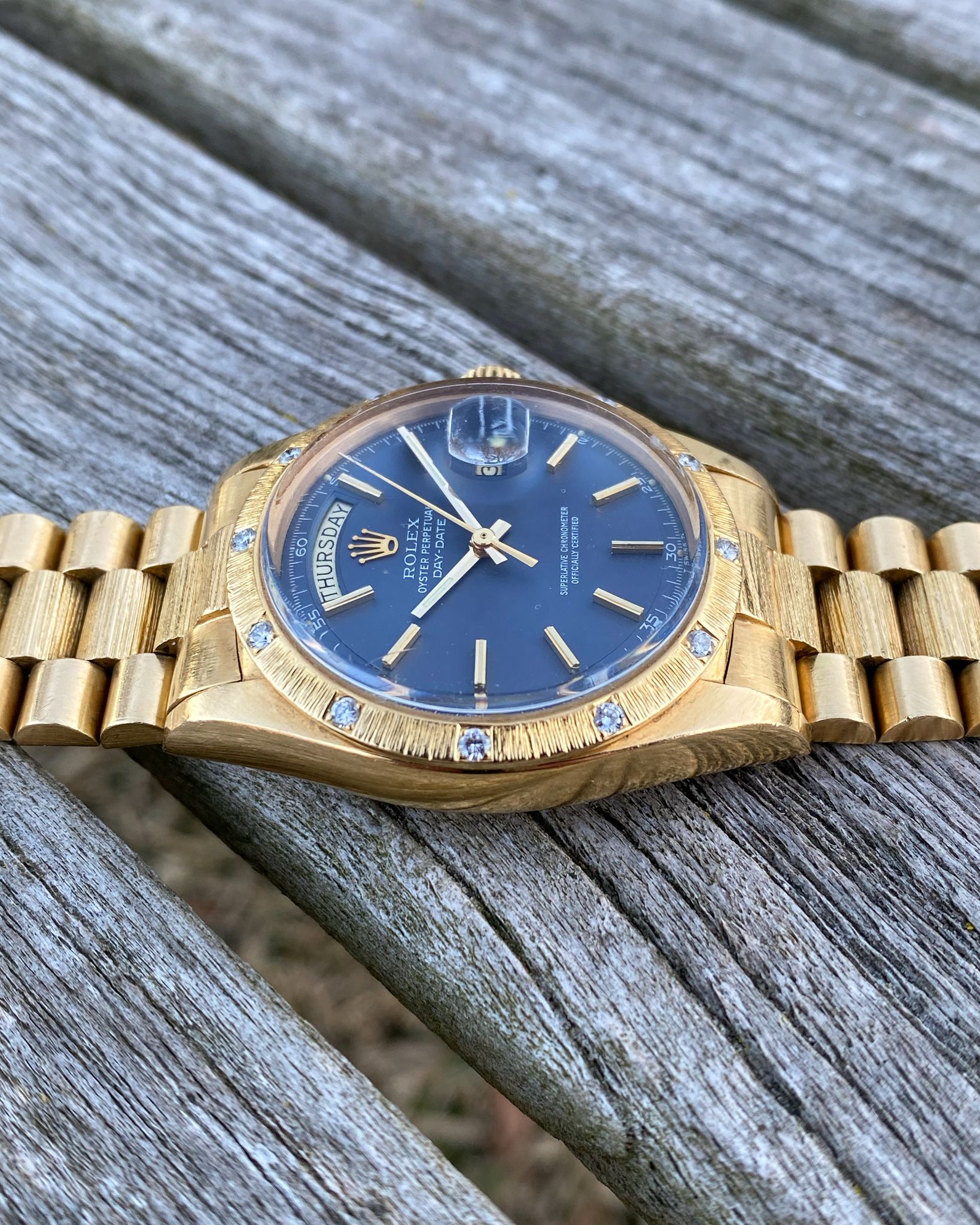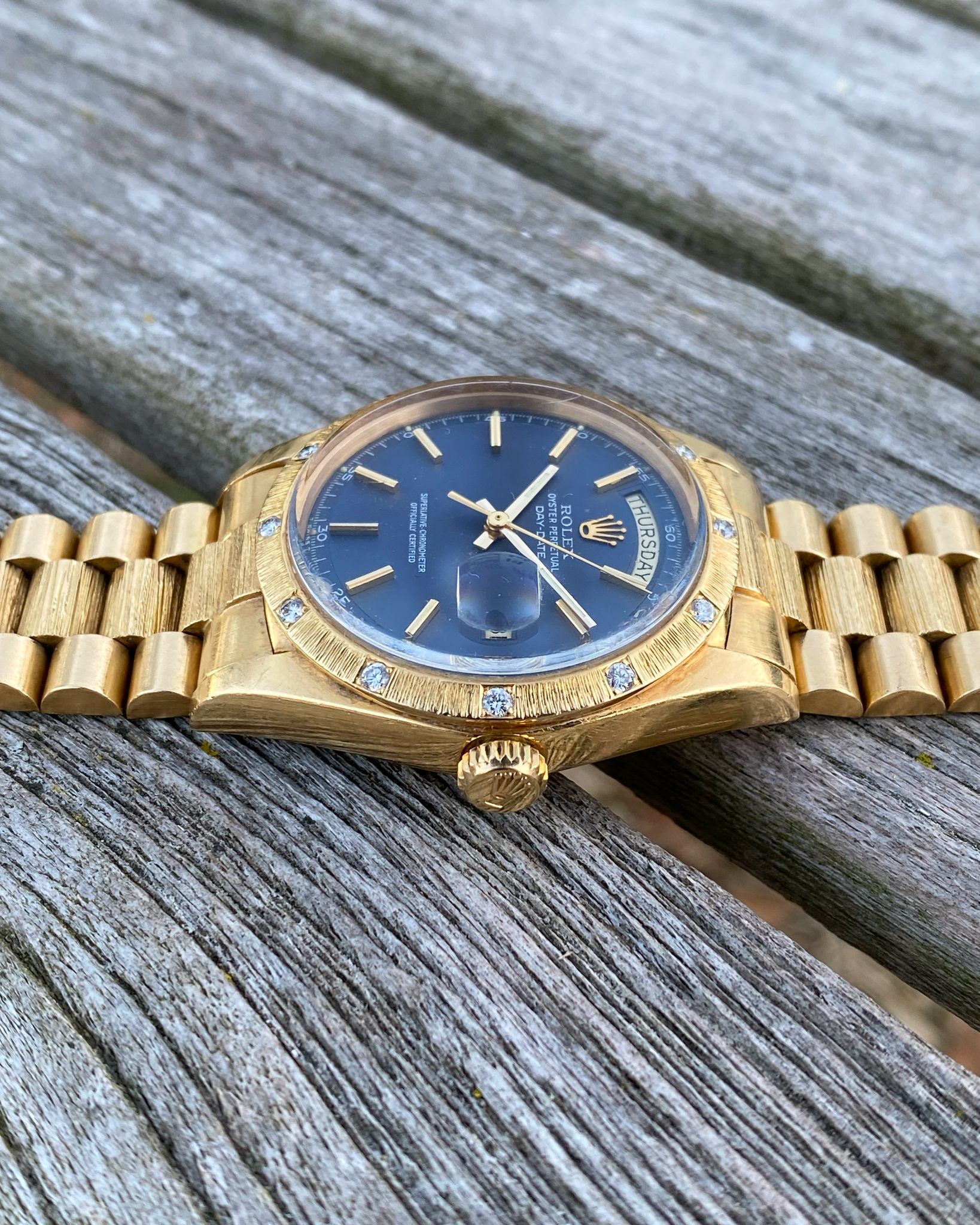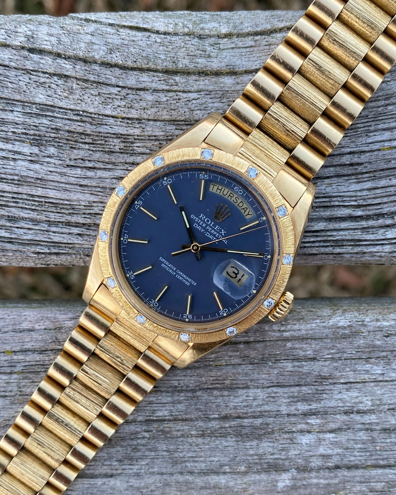Rolex - 1972 Rolex 1807 Day-Date Bark President Matte Blue Pie Pan Dial OEM Factory 12 Diamond Bezel